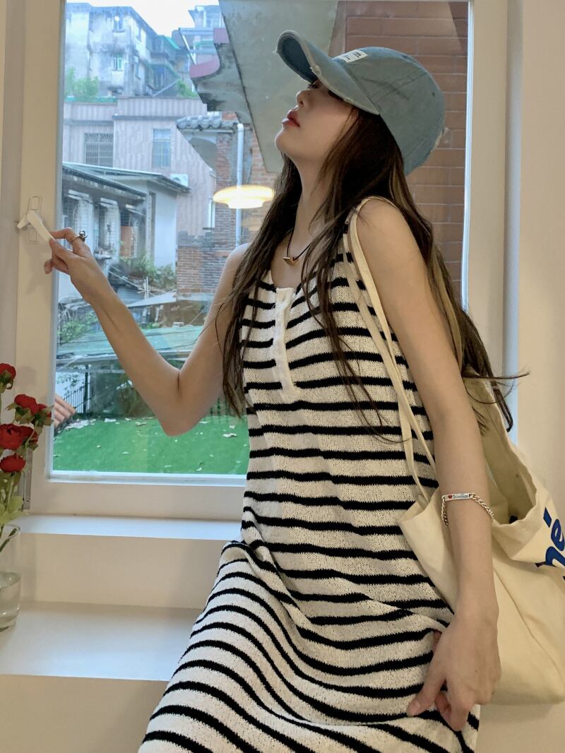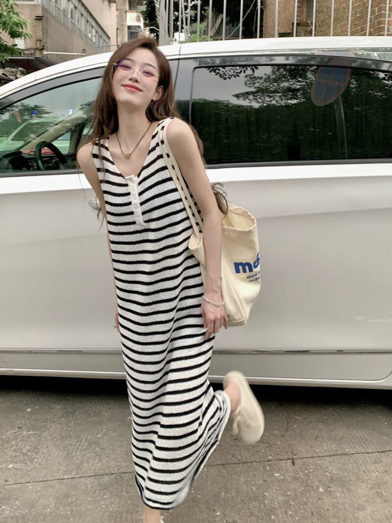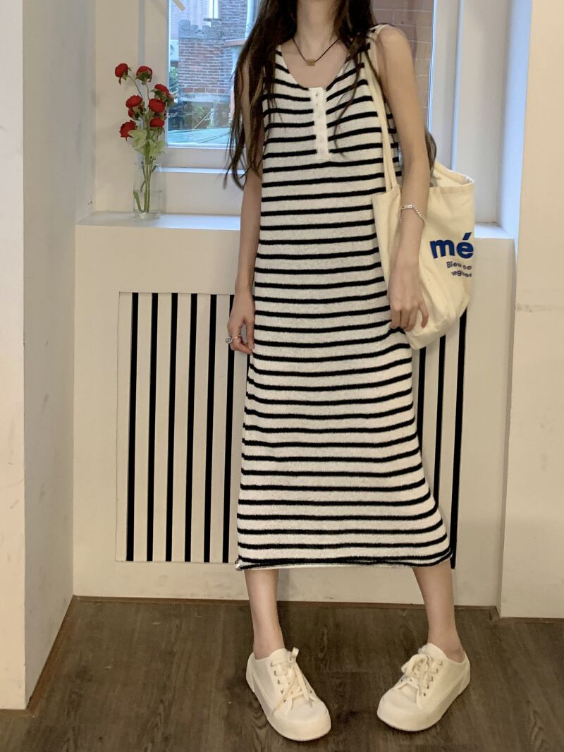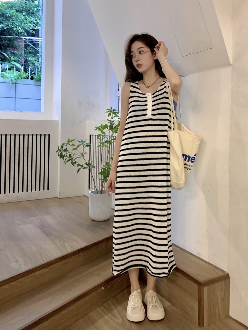 怠惰なスタイルのホリデーストライプVネックサスペンダードレス女性の夏の薄いセクションルーズカジュアルミッドレングスノースリーブベストスカート サマー 夏物 7460043647503519 | framboise21
