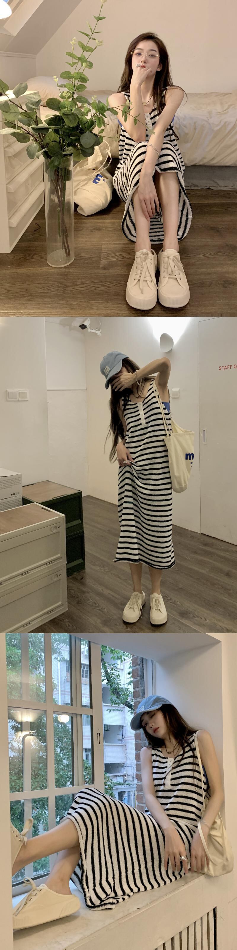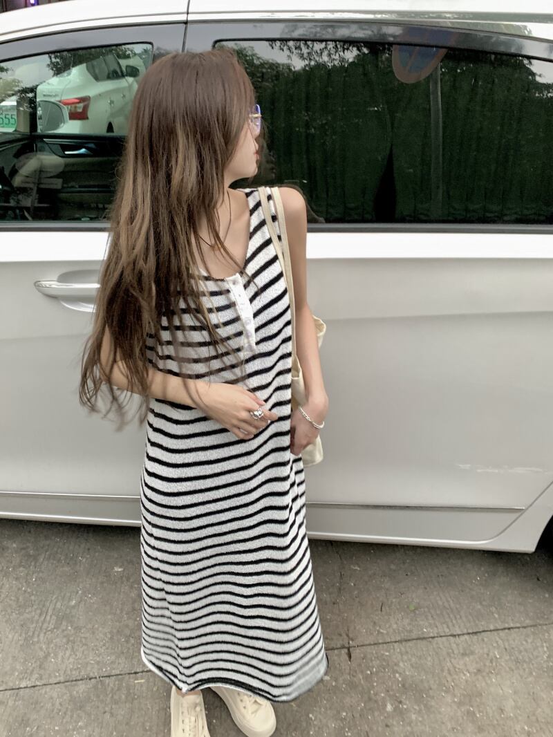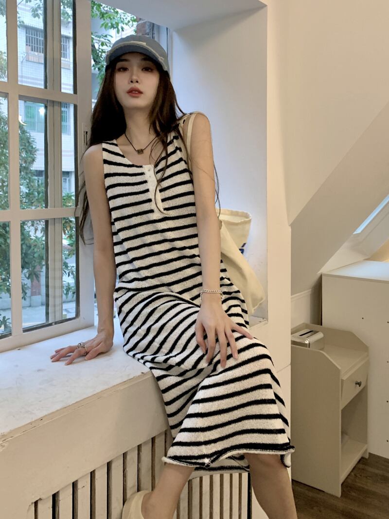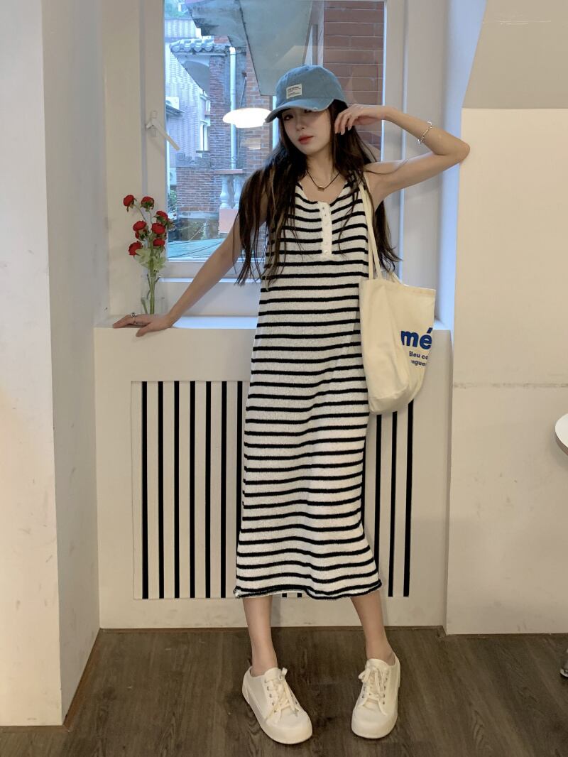怠惰なスタイルのホリデーストライプVネックサスペンダードレス女性の夏の薄いセクションルーズカジュアルミッドレングスノースリーブベストスカート サマー 夏物 7460043647503519 | framboise21
