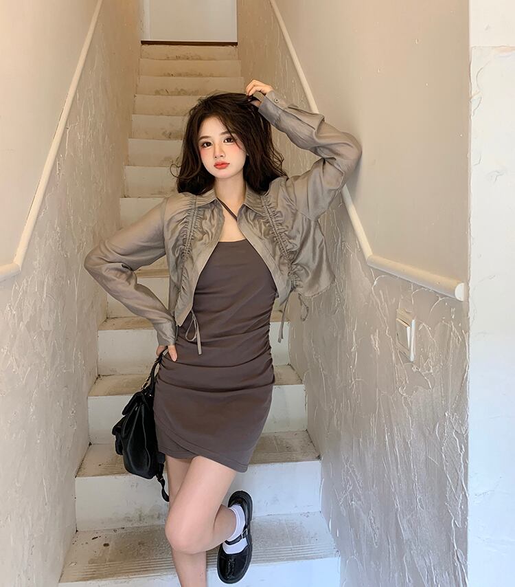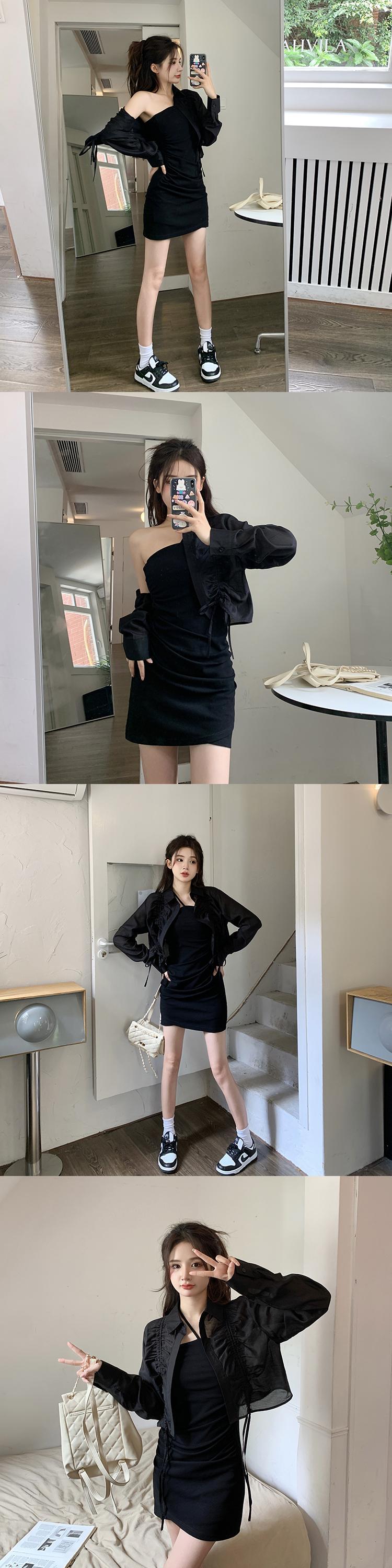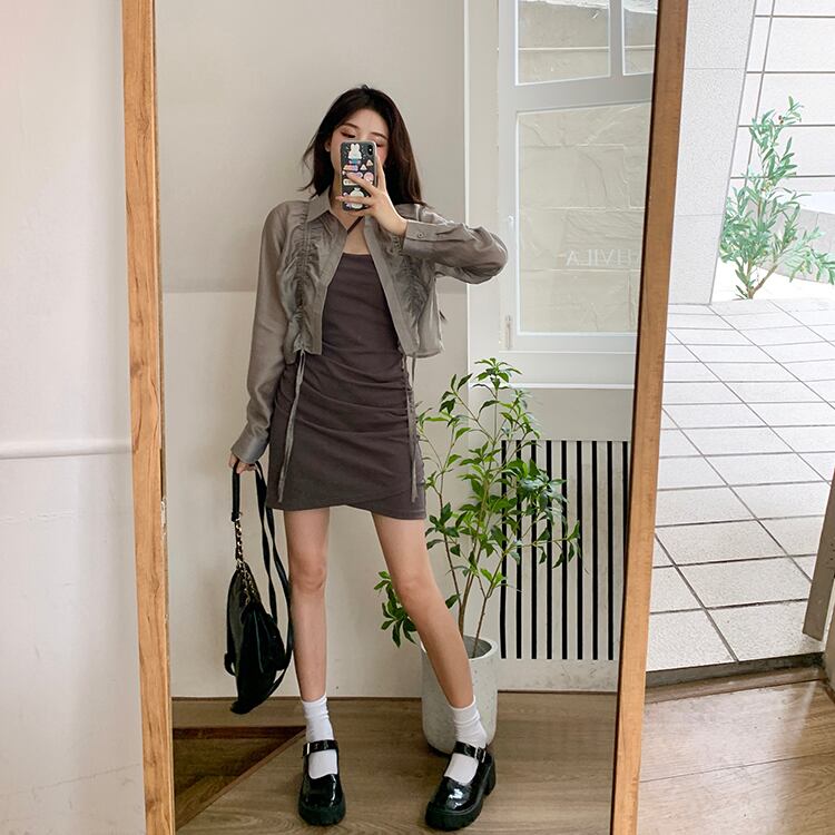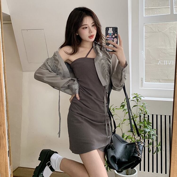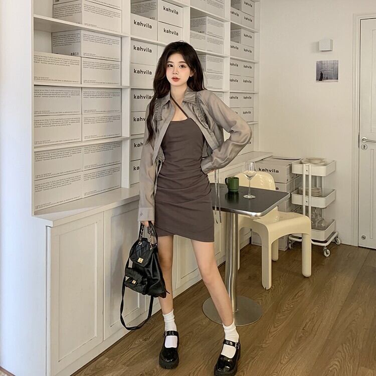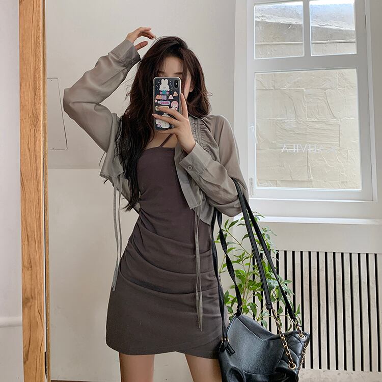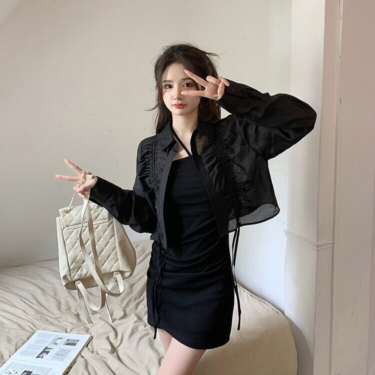 色:茶色の日焼け止めシャツ,黒い日焼け止め,コーヒー色のドレス,ブラックサスペンダースカート