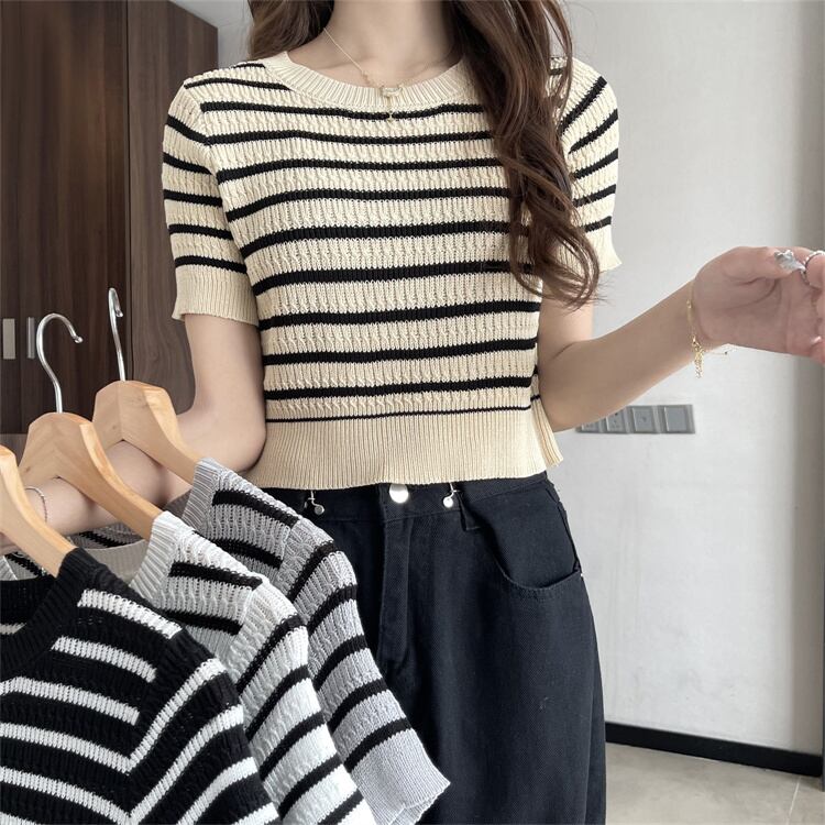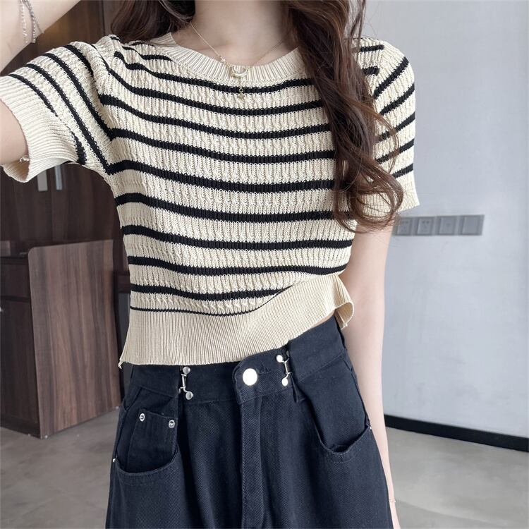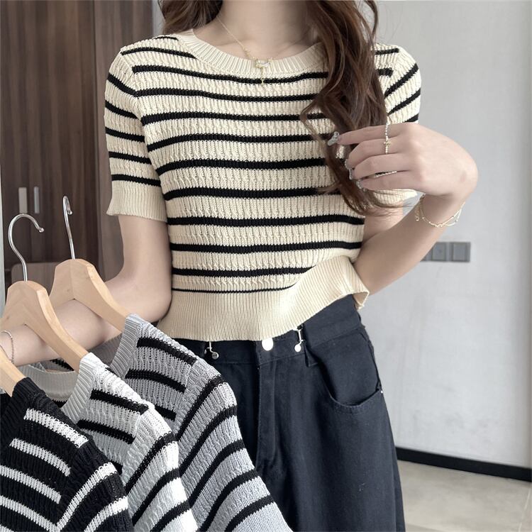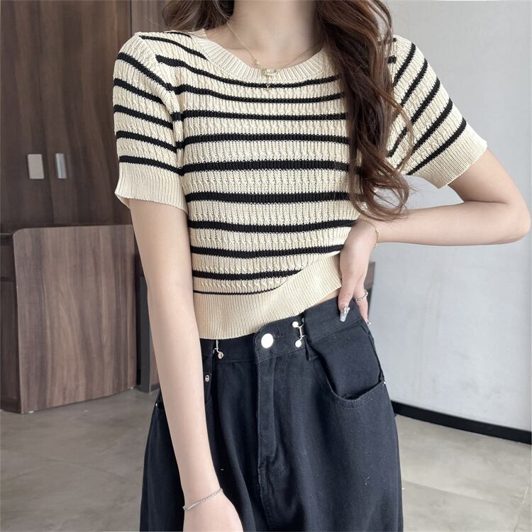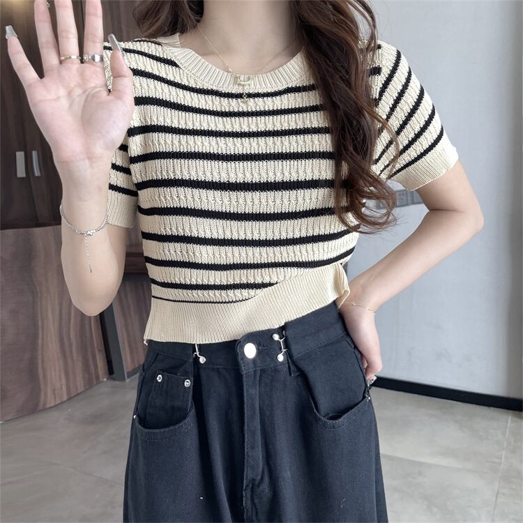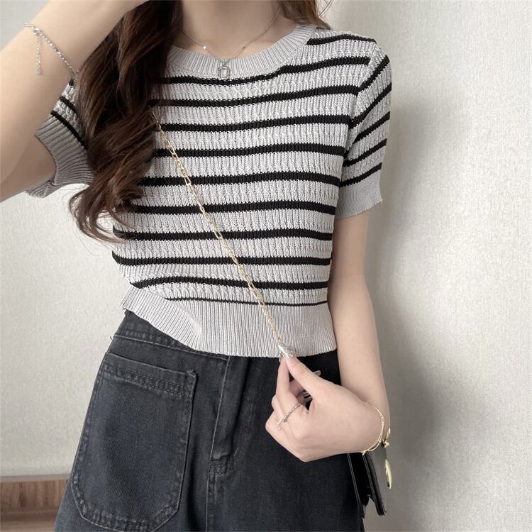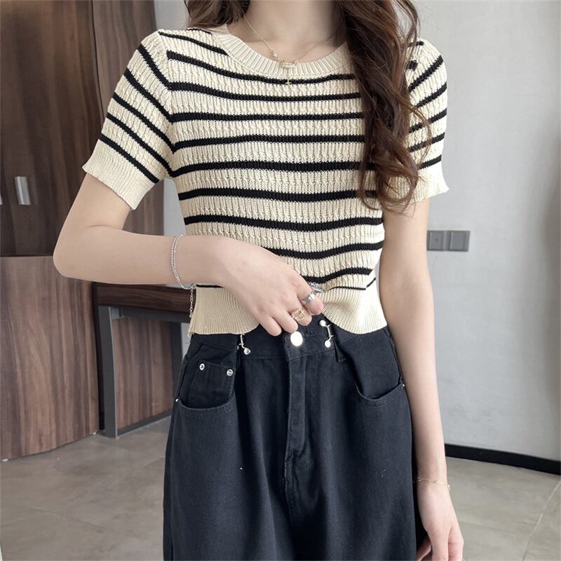 フロントショルダーストライプ半袖 Tシャツ女性の 2022 夏潮ウエストスリムショートアイスシルクニットセータートップ ハーフスリーブ サマー 夏物 7460058483833970 | framboise21