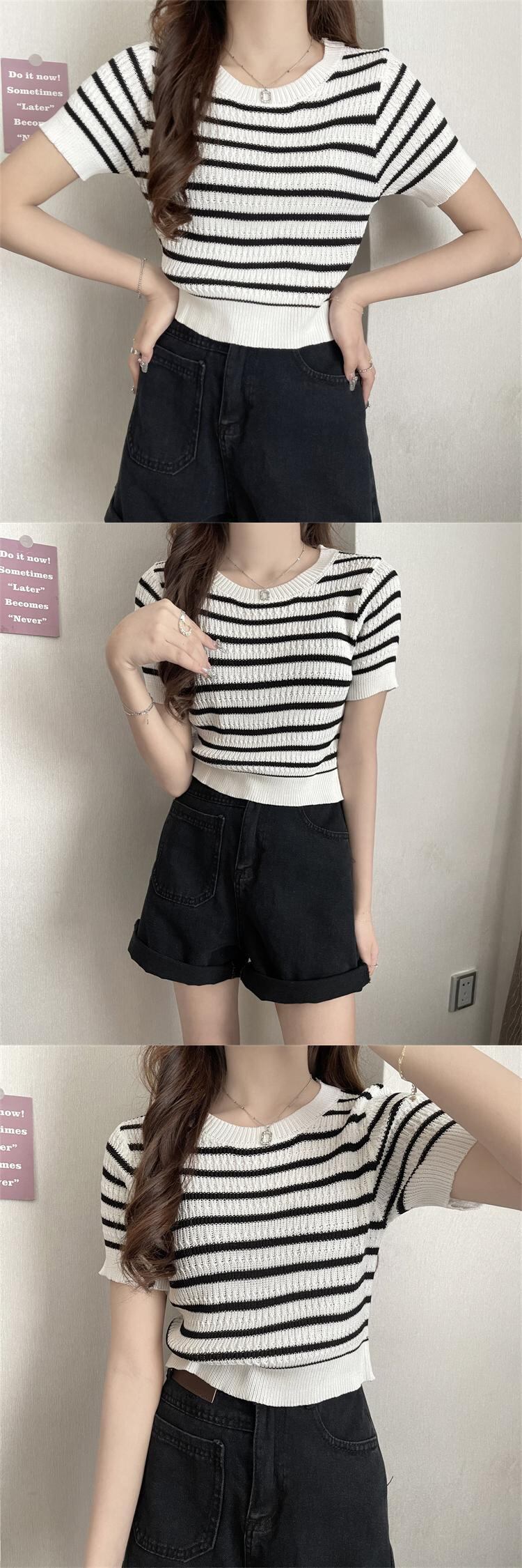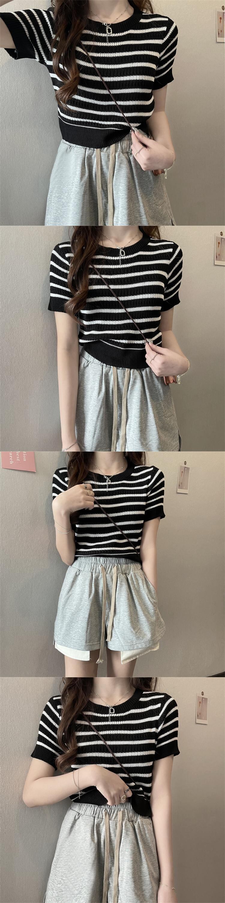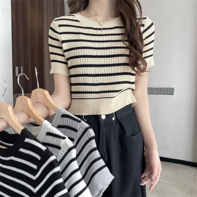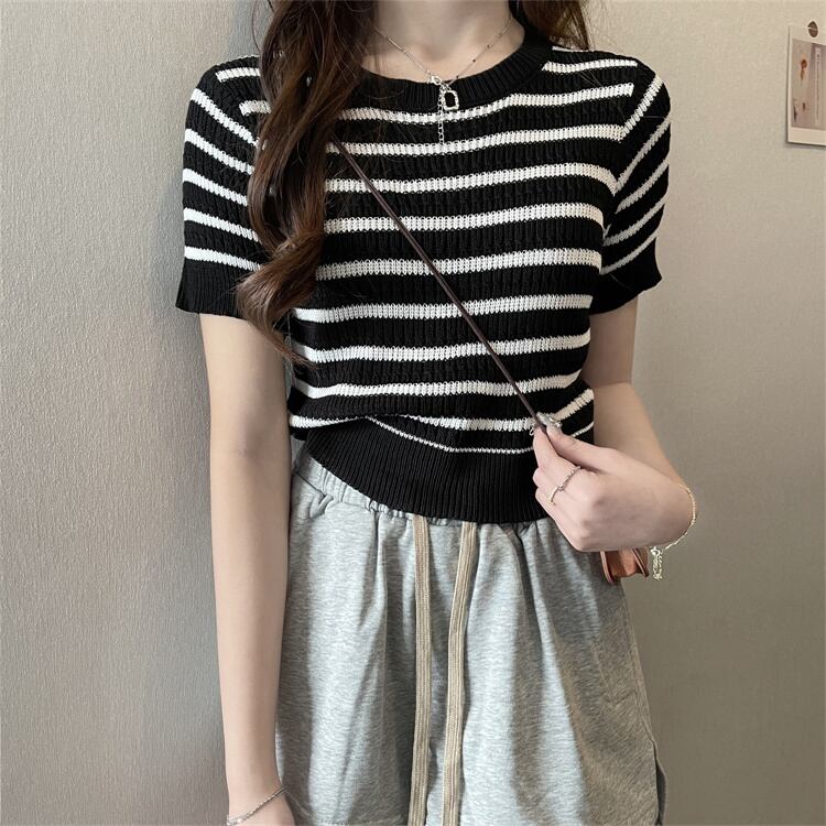 フロントショルダーストライプ半袖 Tシャツ女性の 2022 夏潮ウエストスリムショートアイスシルクニットセータートップ ハーフスリーブ サマー 夏物 7460058483833970 | framboise21