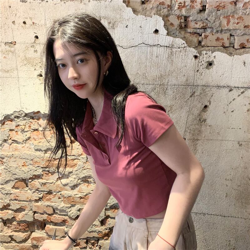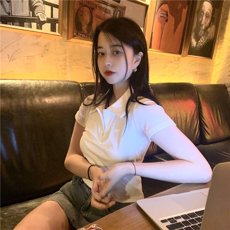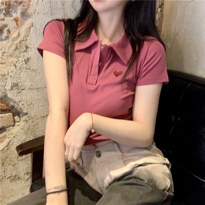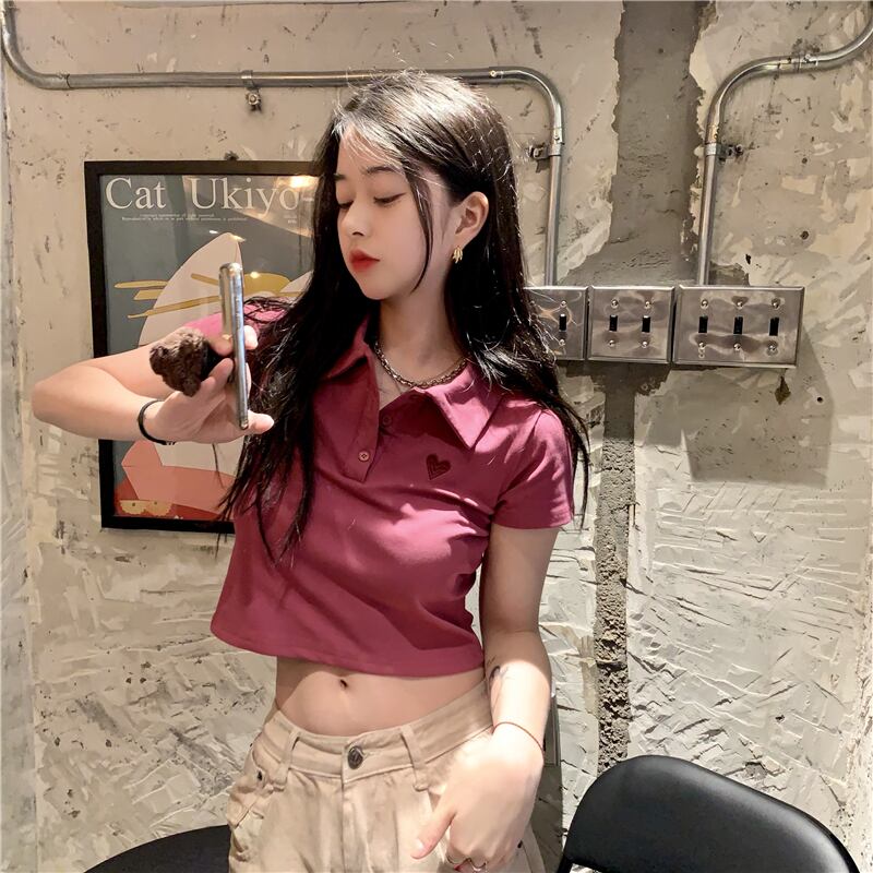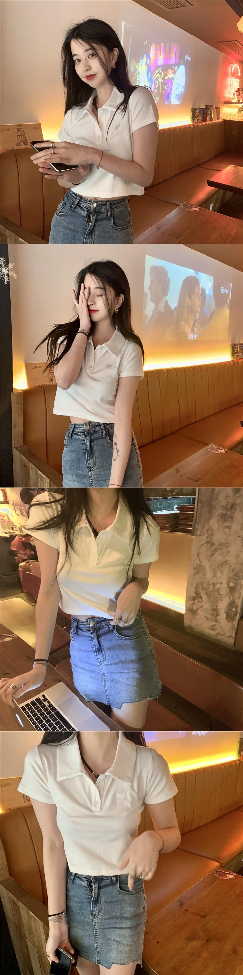 ラブ刺繍ポロカラー半袖レディース2022年夏新作フロントショルダーTシャツ甘辛スタイルタイトショートトップ 大人ガーリー スウィート キュート カジュアル サマー 夏物 7460044149126634 | framboise21