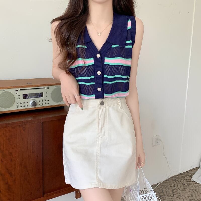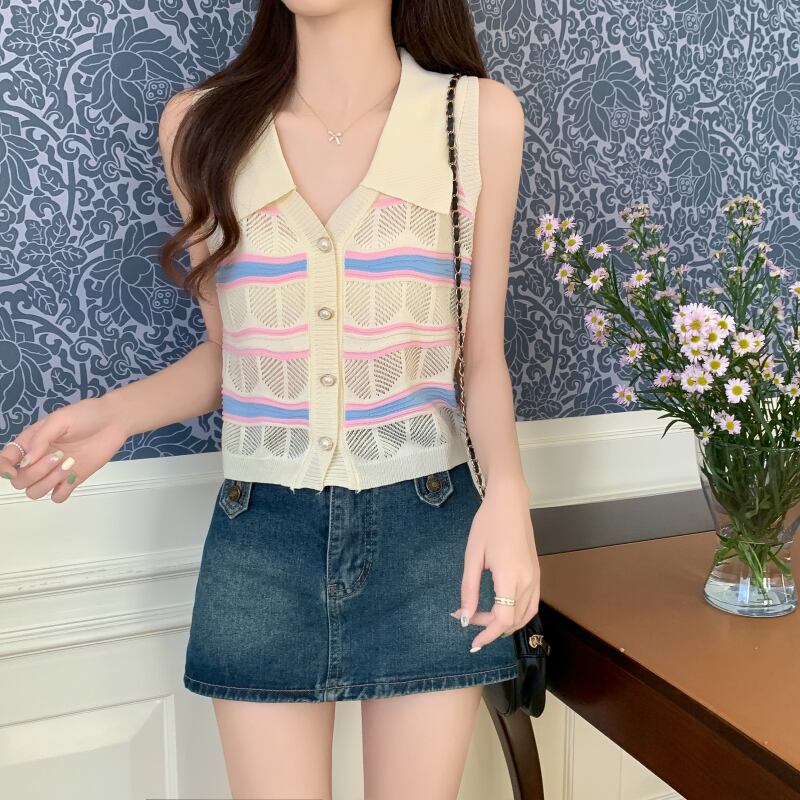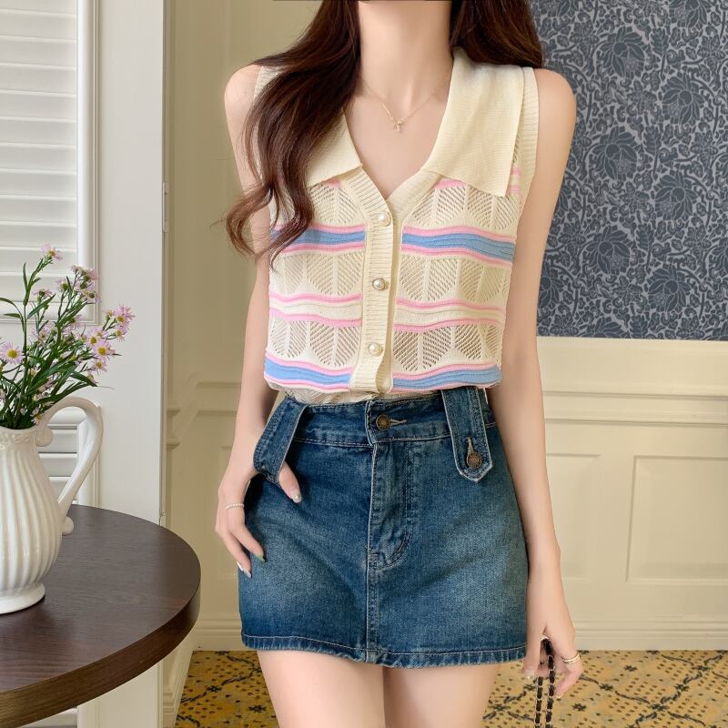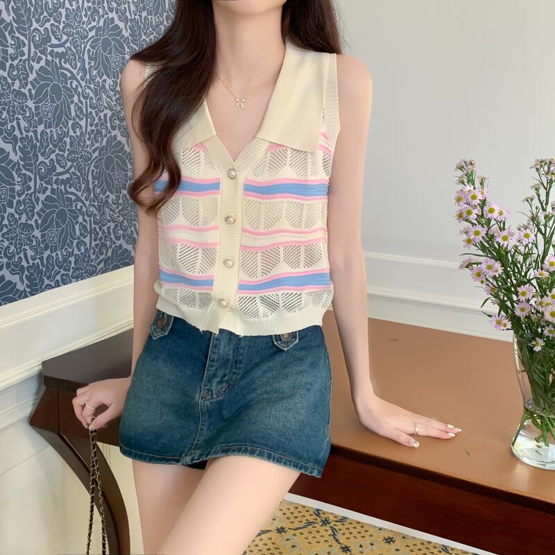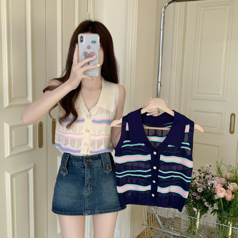 甘くて優しいスタイルストライプアイスシルクニットカーディガンノースリーブTシャツレディースサマーデザインニッチラペルショートトップ 大人ガーリー スウィート キュート カジュアル 夏物 7460045339717543 | framboise21