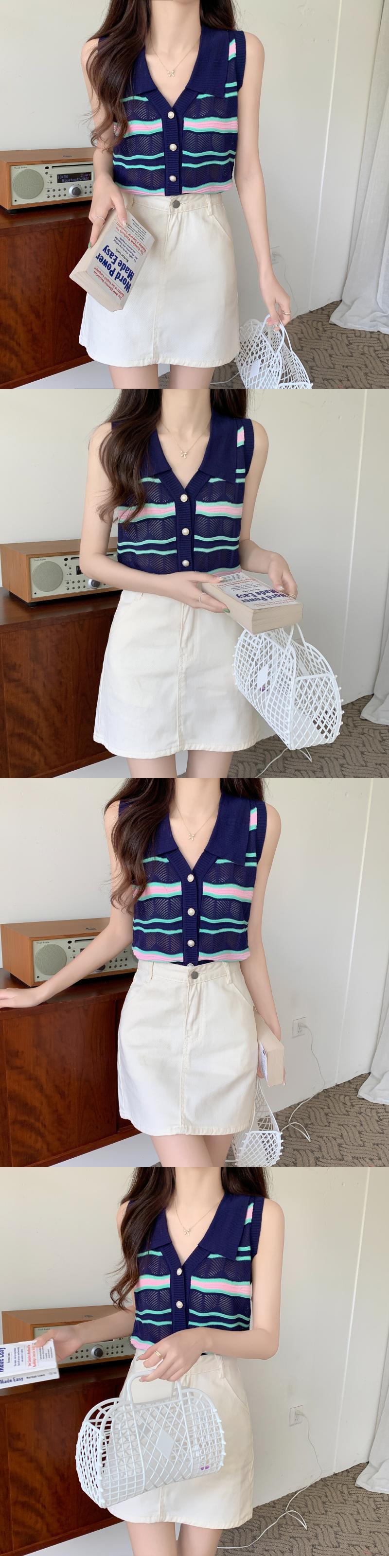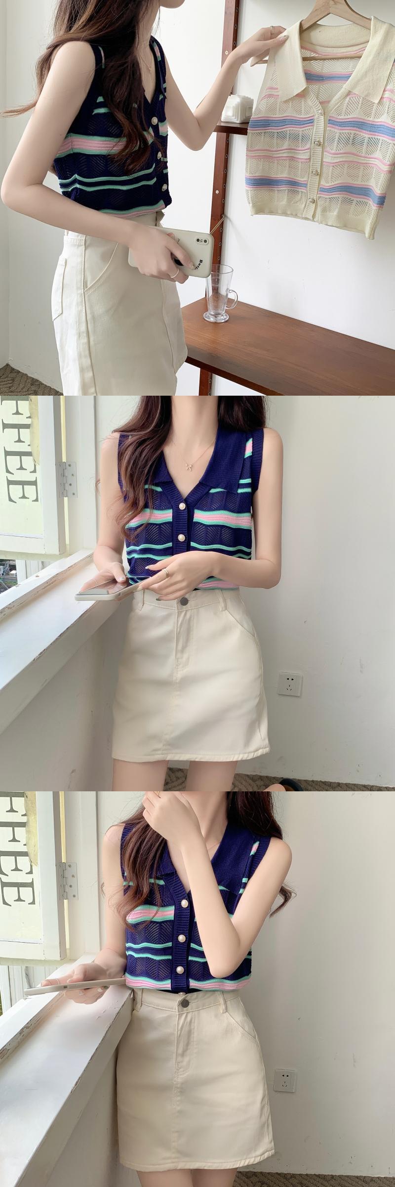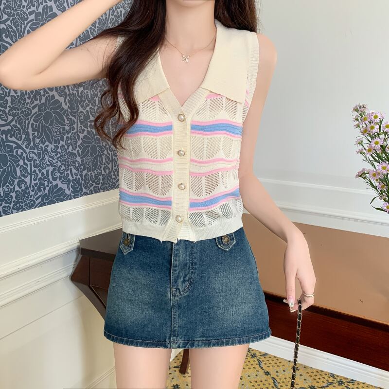 甘くて優しいスタイルストライプアイスシルクニットカーディガンノースリーブTシャツレディースサマーデザインニッチラペルショートトップ 大人ガーリー スウィート キュート カジュアル 夏物 7460045339717543 | framboise21