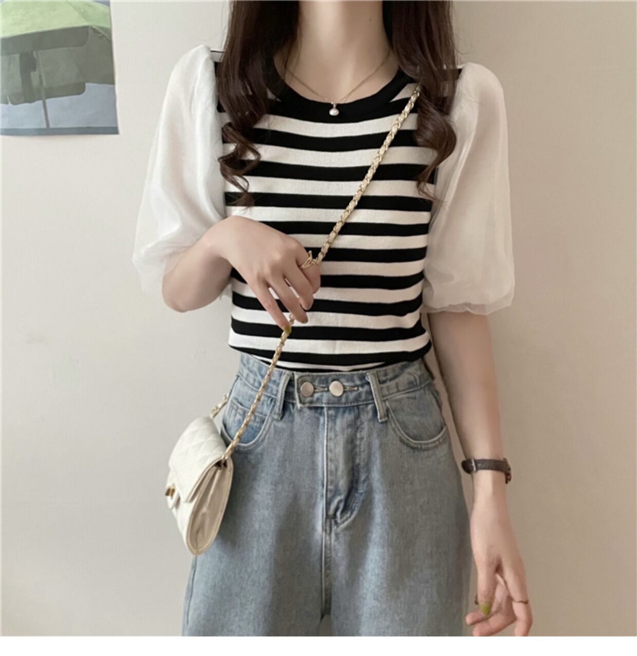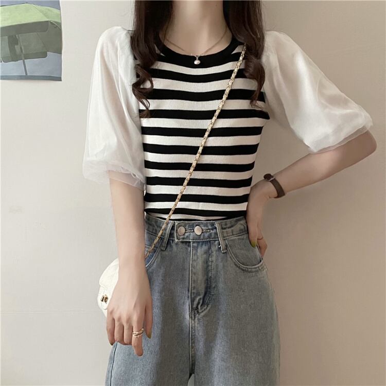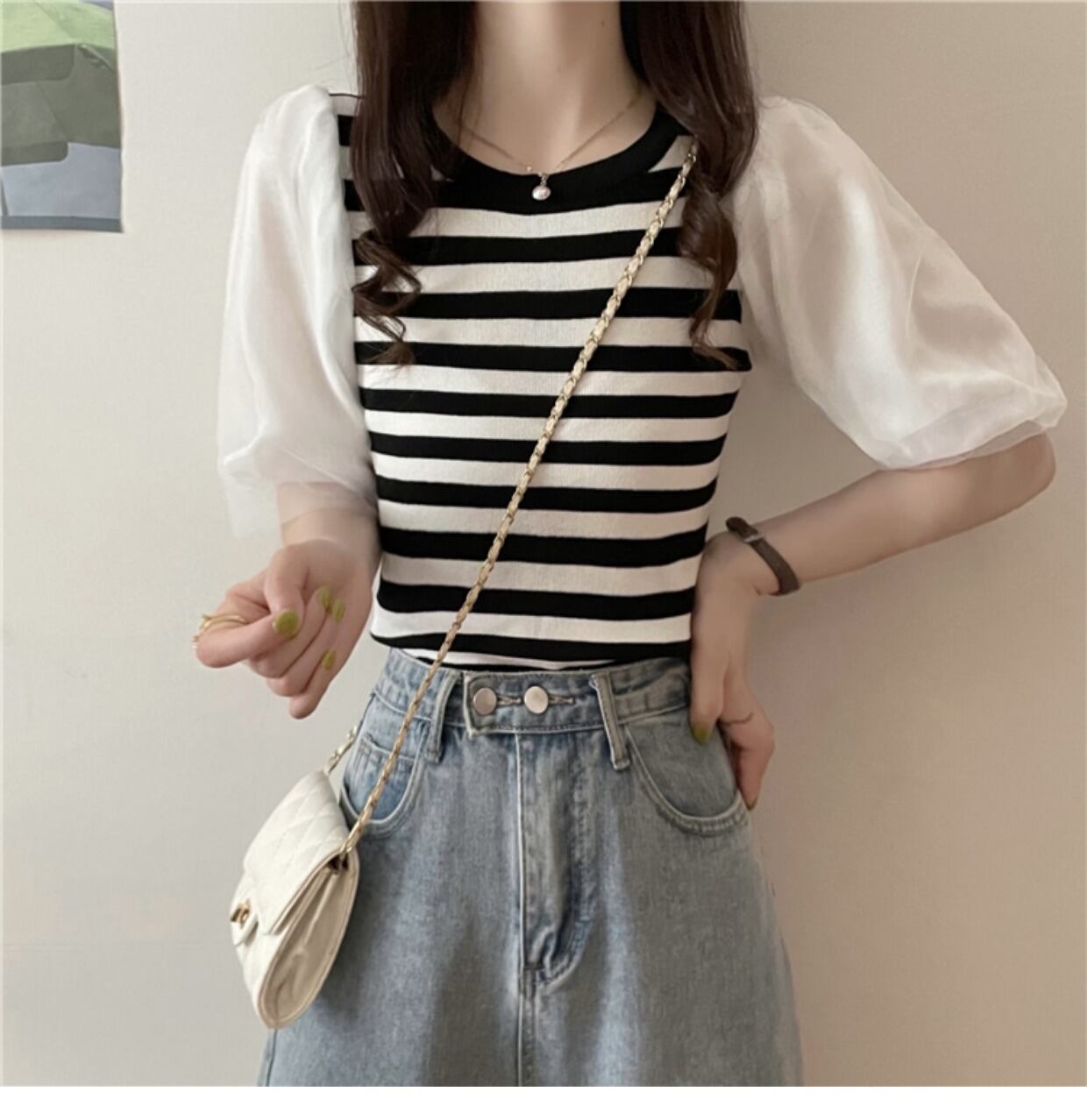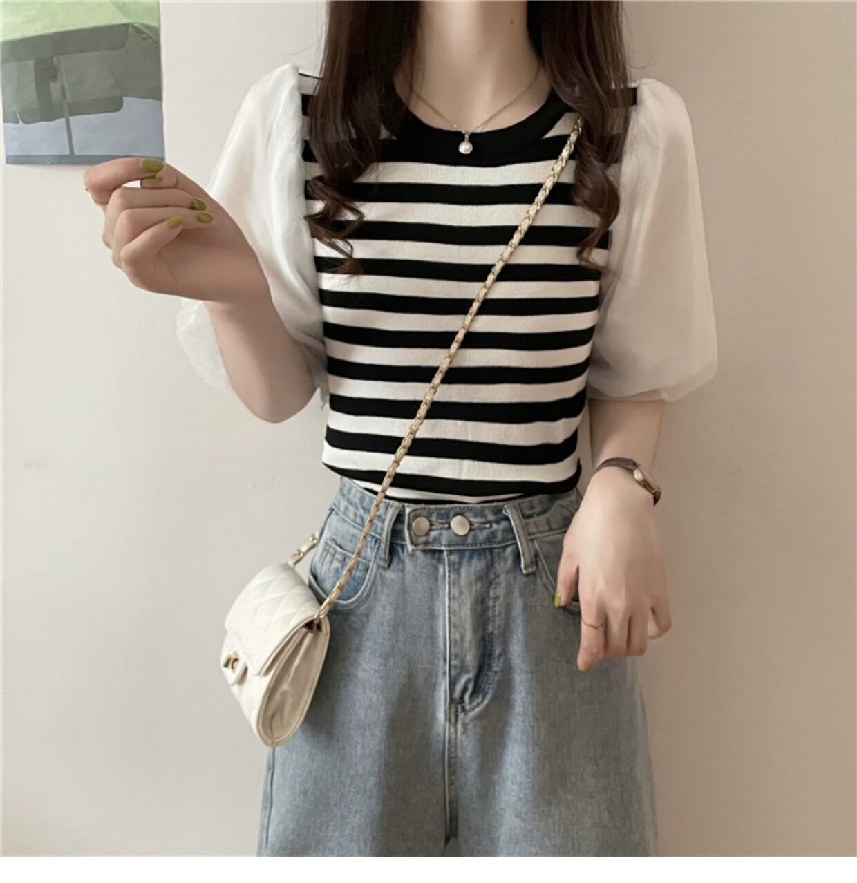 メッシュ バブル 半袖 ステッチ ショート Tシャツ レディース スリム 白黒 ストライプ アイスシルク ニットセーター ショートトップ 夏 ホワイト ブラック サマー 夏物 7460045205683381 | framboise21
