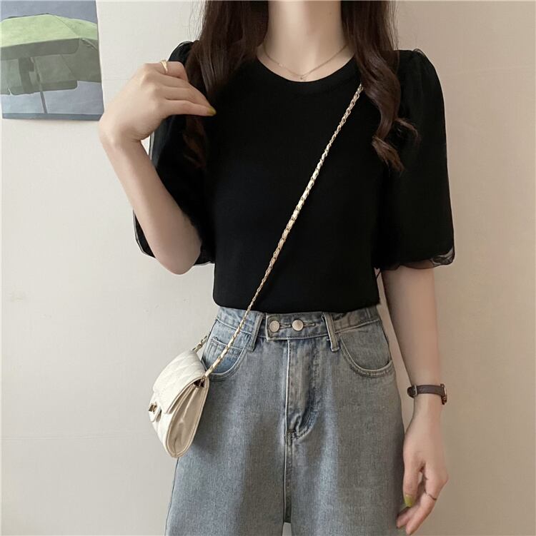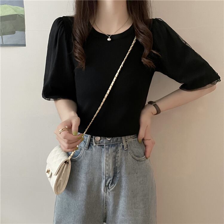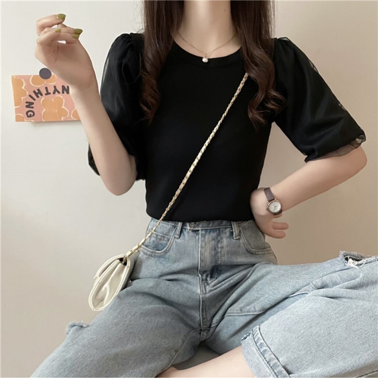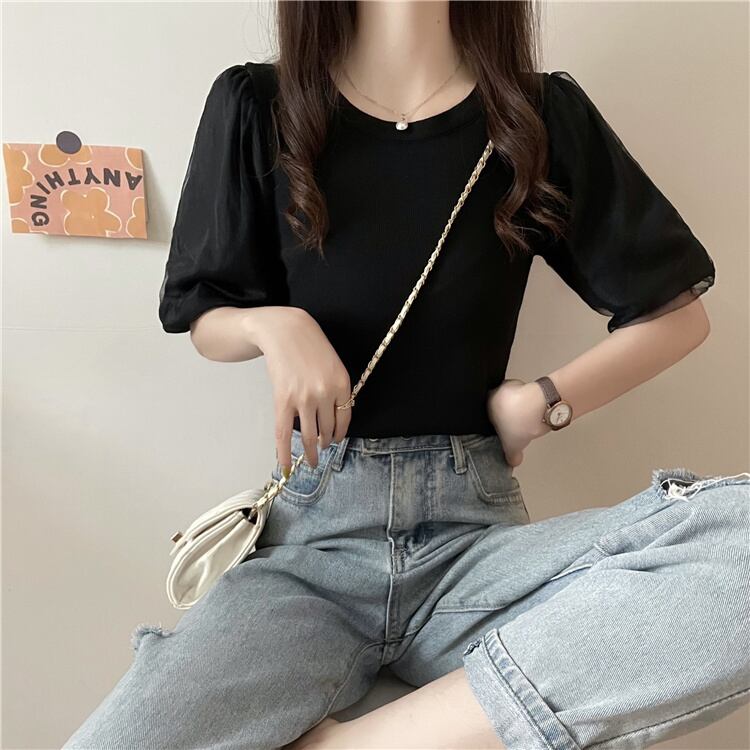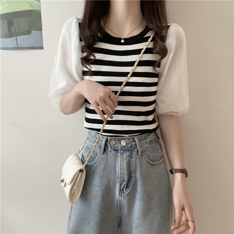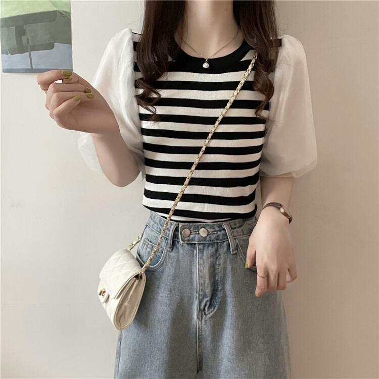 メッシュ バブル 半袖 ステッチ ショート Tシャツ レディース スリム 白黒 ストライプ アイスシルク ニットセーター ショートトップ 夏 ホワイト ブラック サマー 夏物 7460045205683381 | framboise21