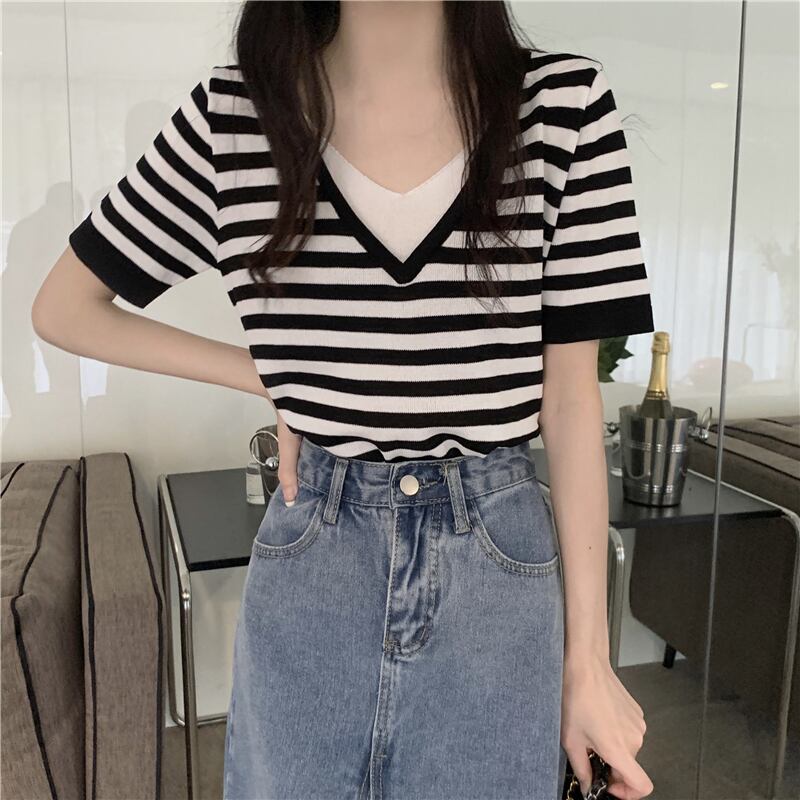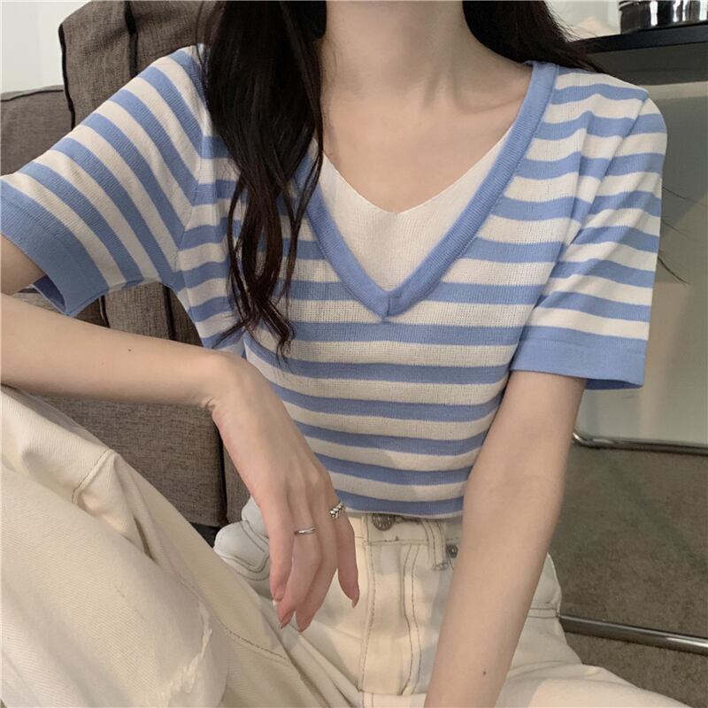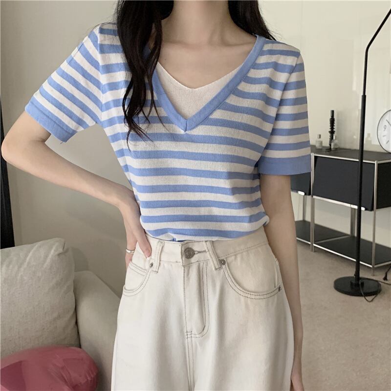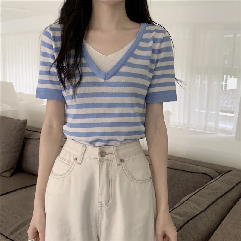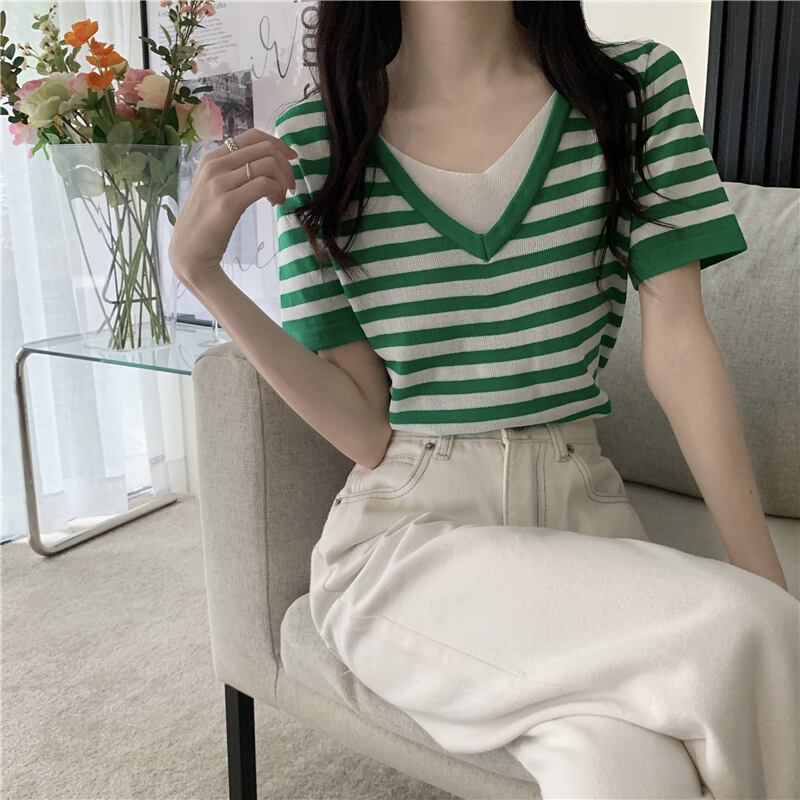 Vネックフェイクツーピース半袖アイスシルクニットセータートップレディースハイウエストデザインニッチフロントショルダーストライプショートTシャツトレンド ハイウェスト 7460098933683884 | framboise21