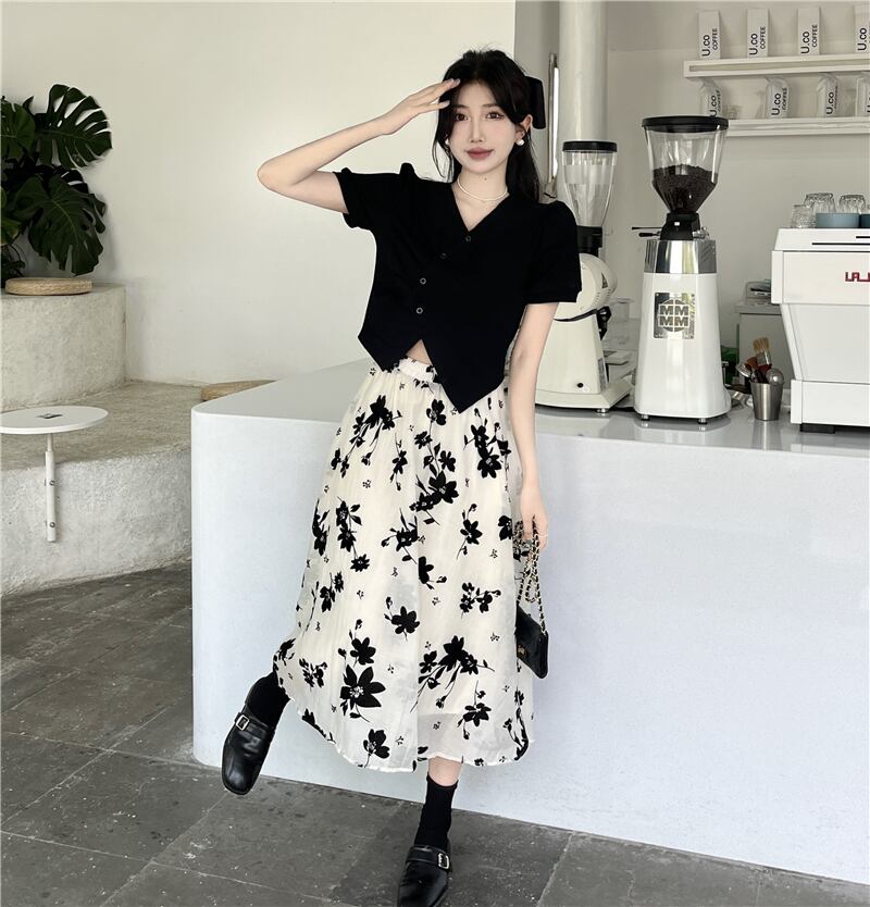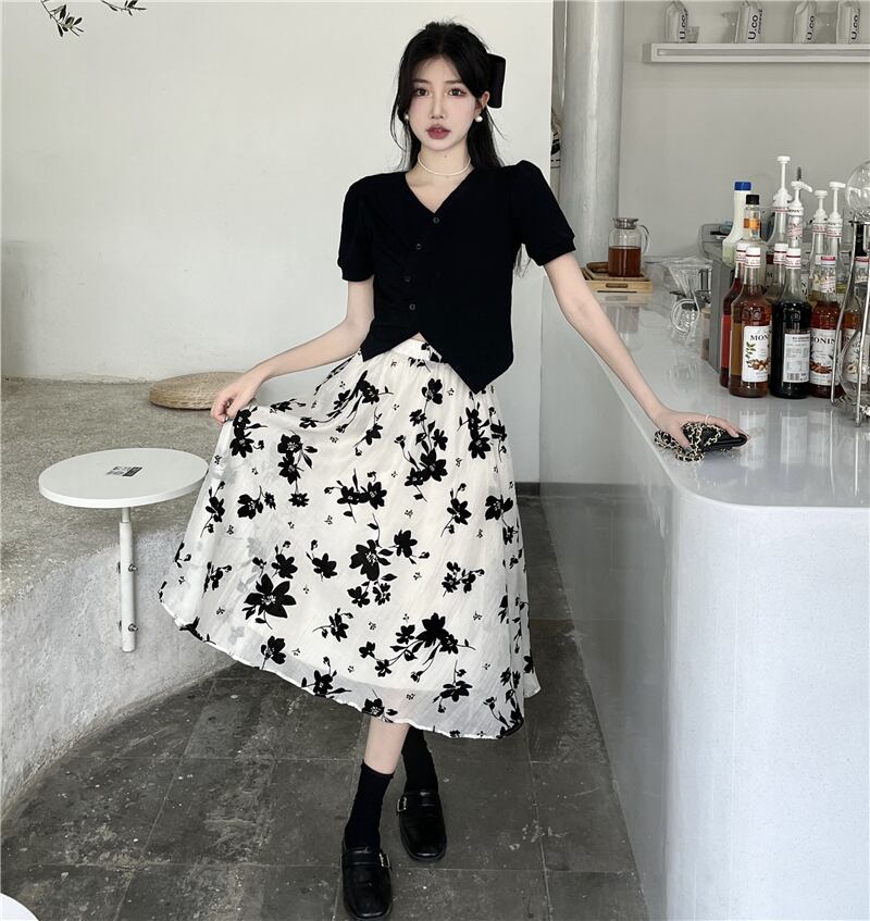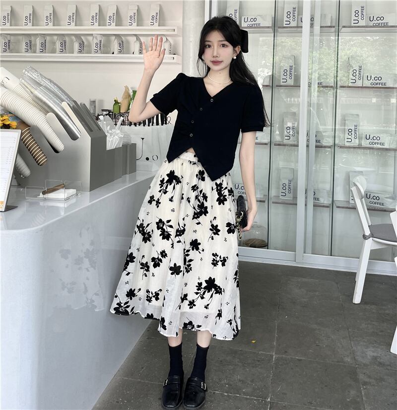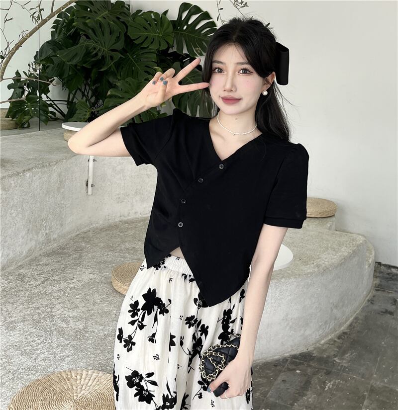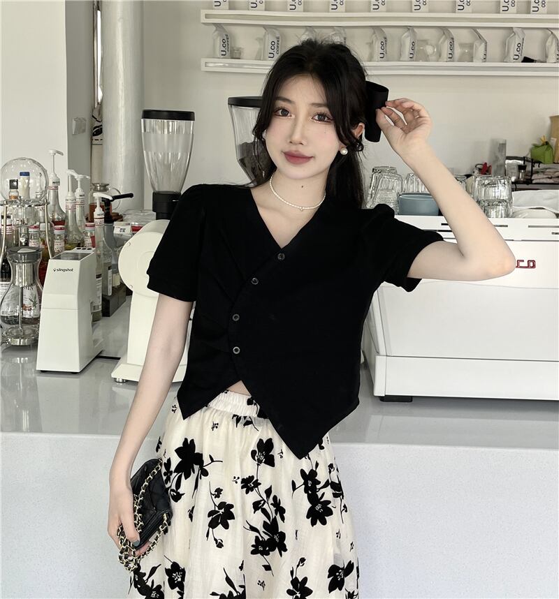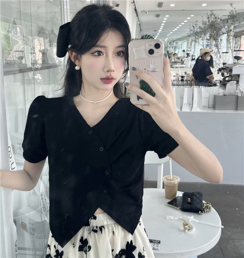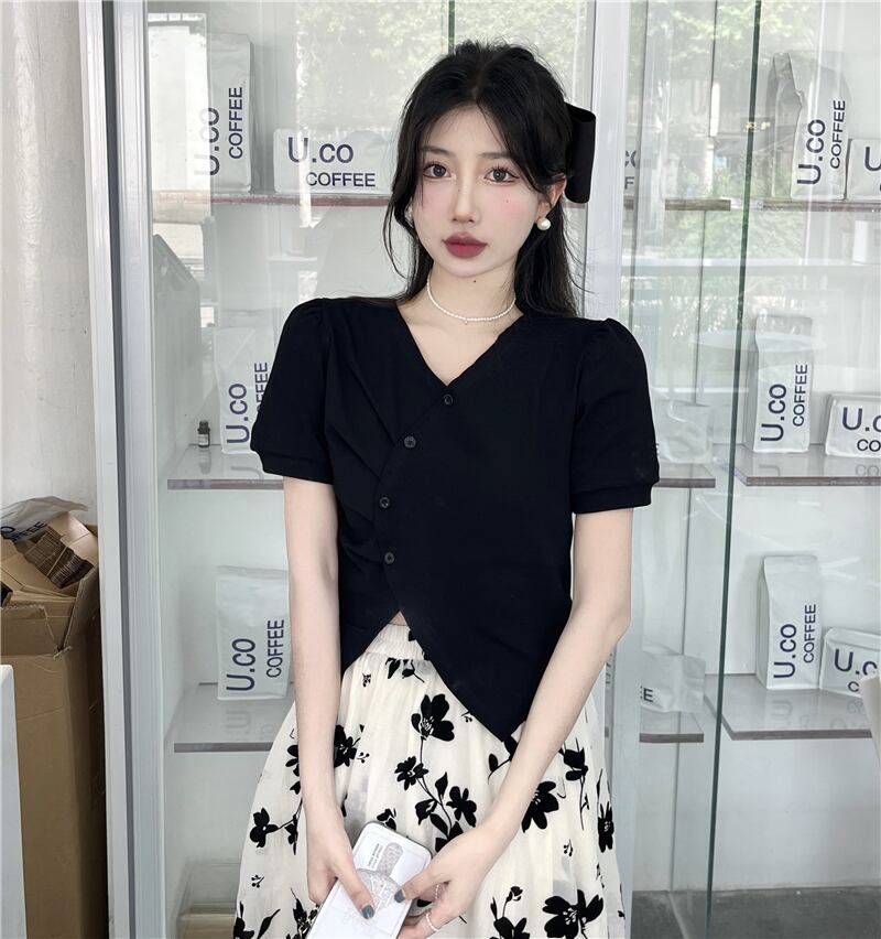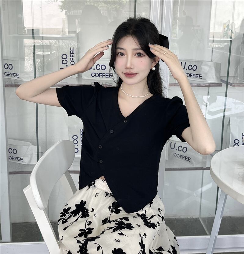 イレギュラーブラックVネックフロントショルダー半袖Tシャツレディースサマーデザインニッチオールマッチ自己修養パフスリーブショートトップ 夏物 7460080986572038 | framboise21