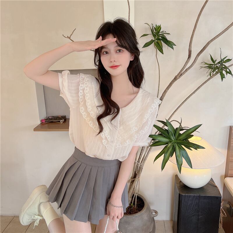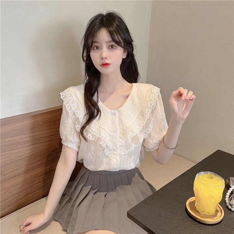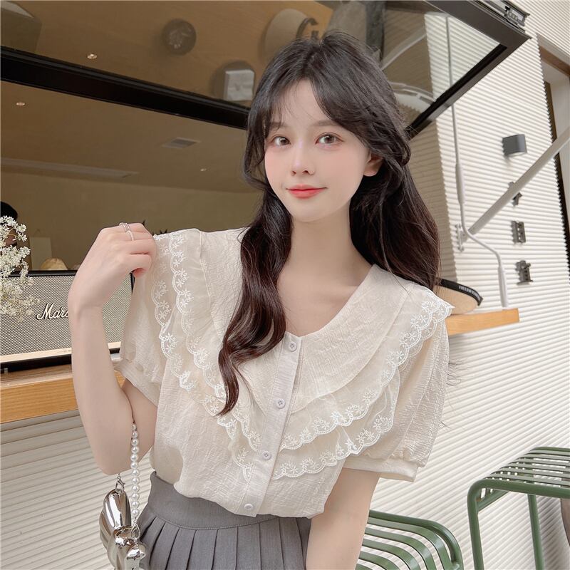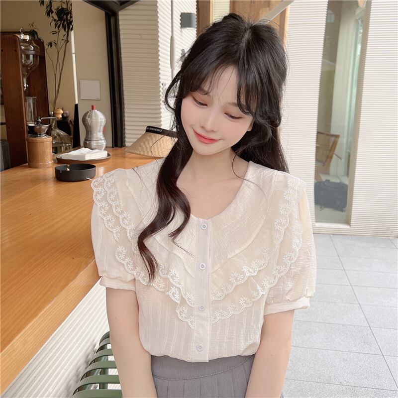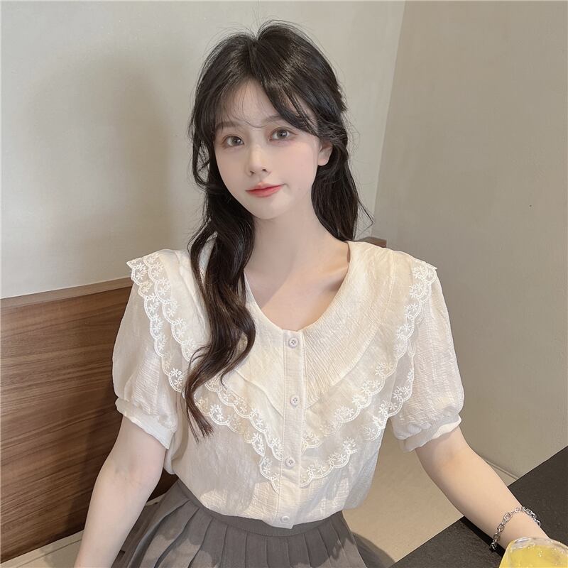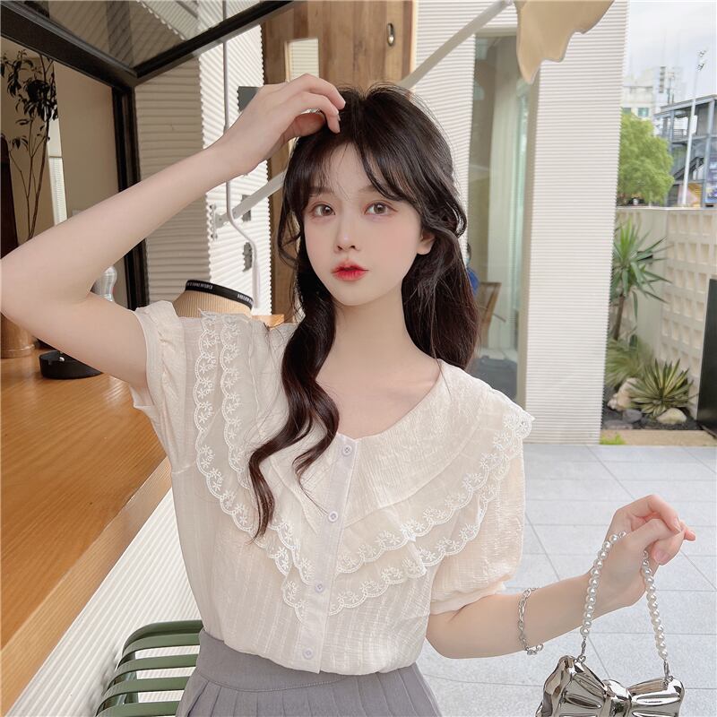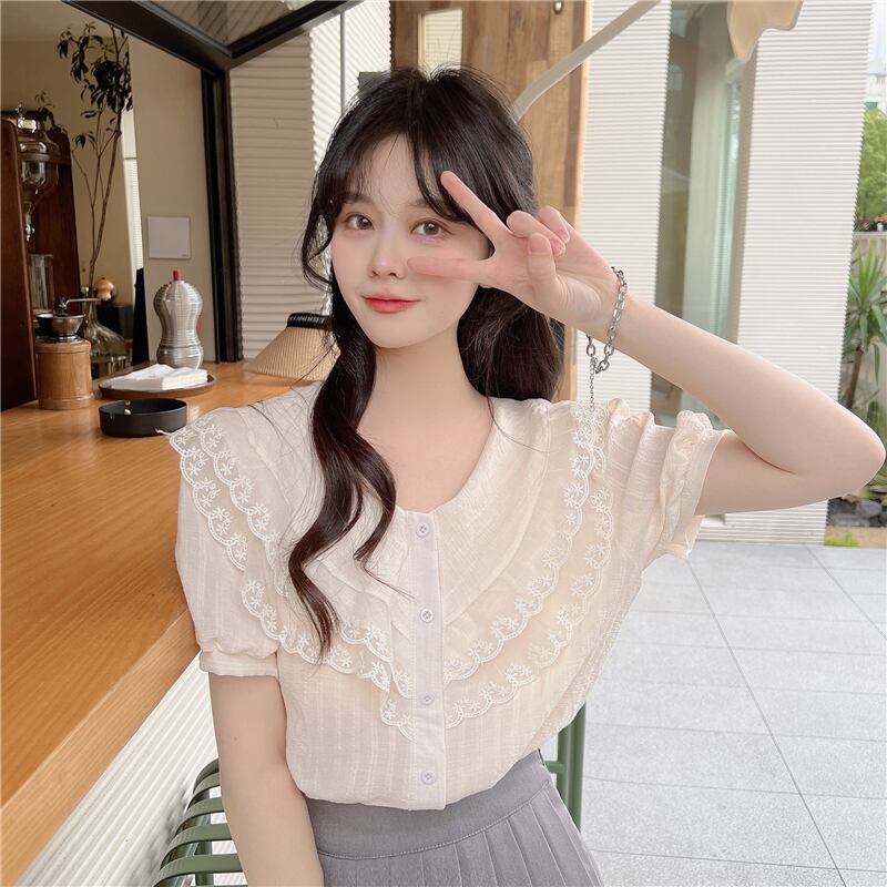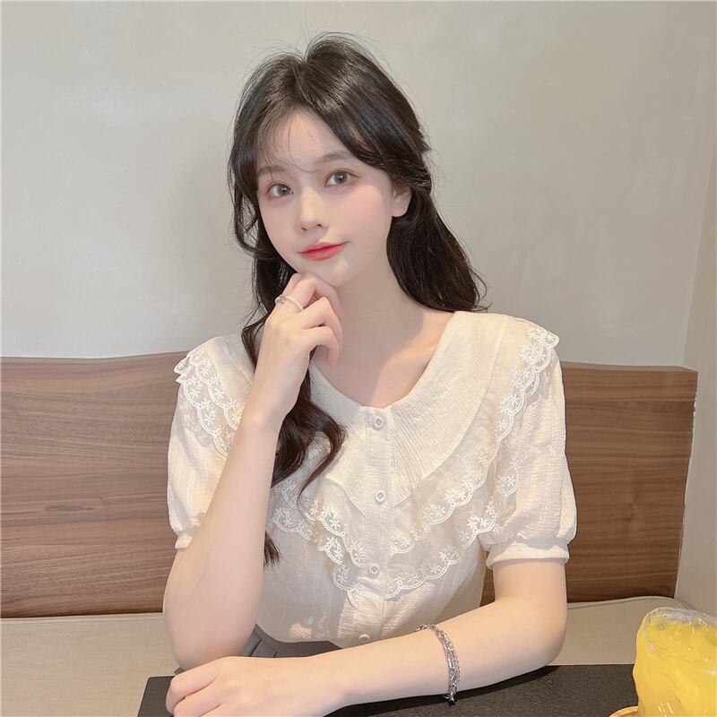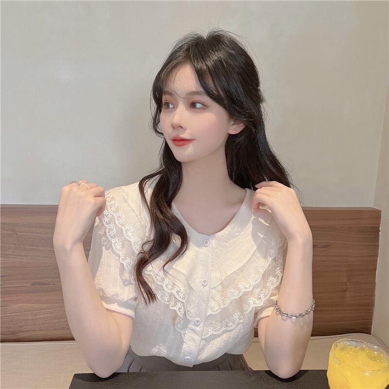 レースレースステッチVネック半袖シャツレディースサマースイートフレンチパフスリーブシフォントップデザインニッチ 大人ガーリー スウィート キュート カジュアル 夏物 7460091788643478 | framboise21