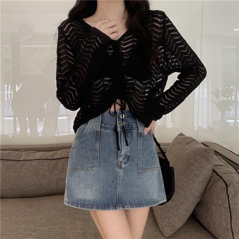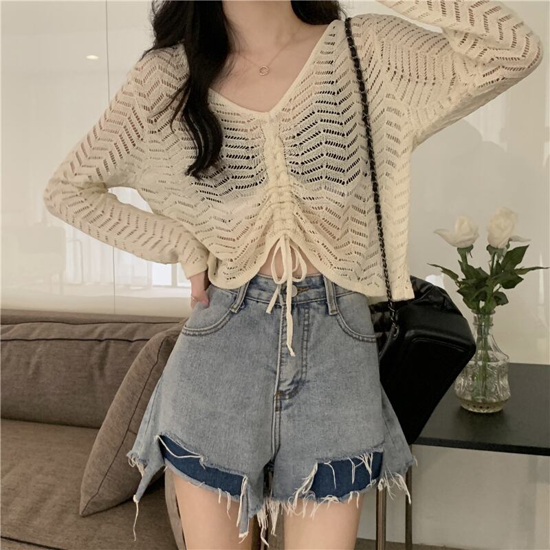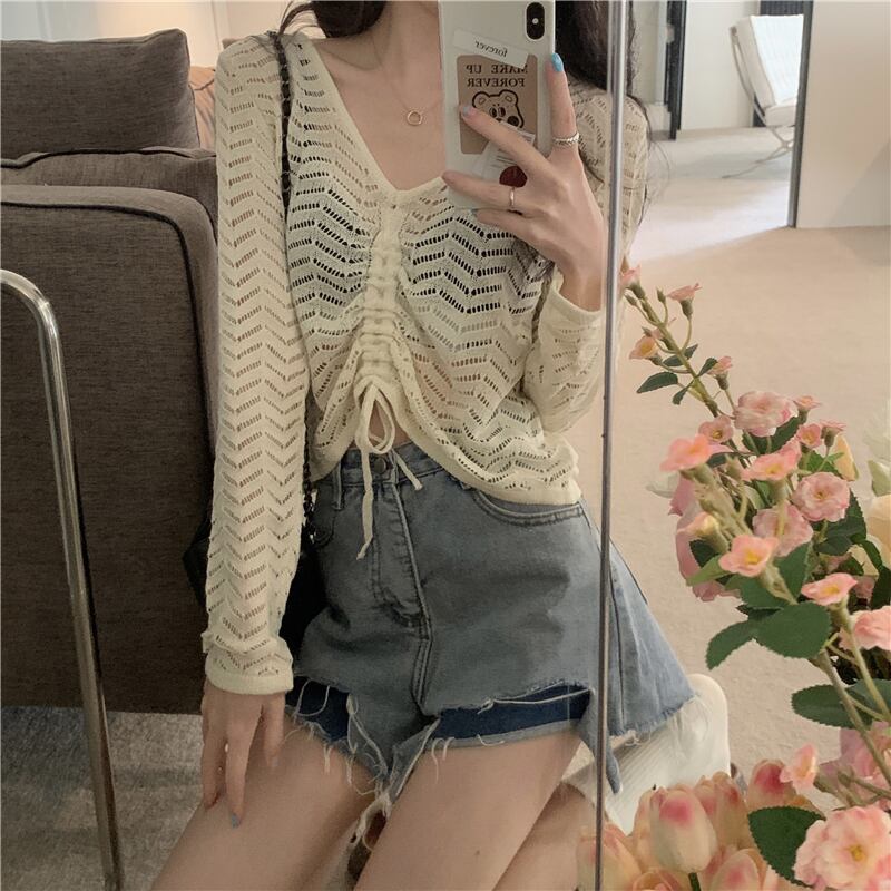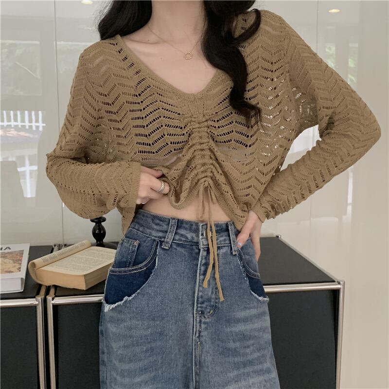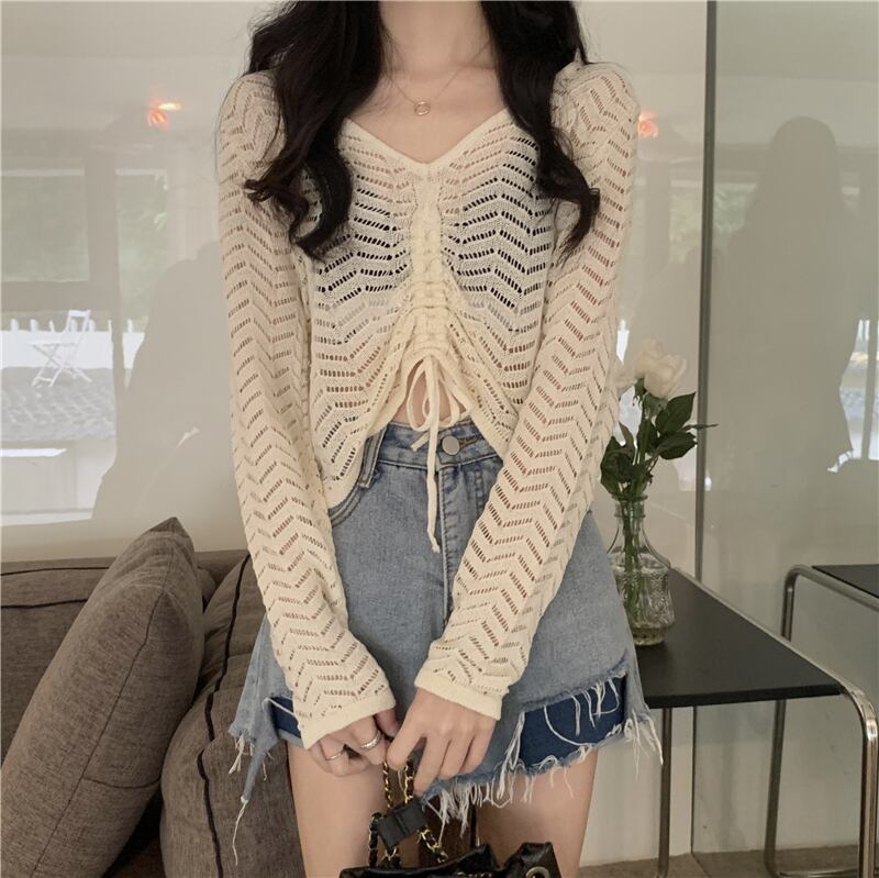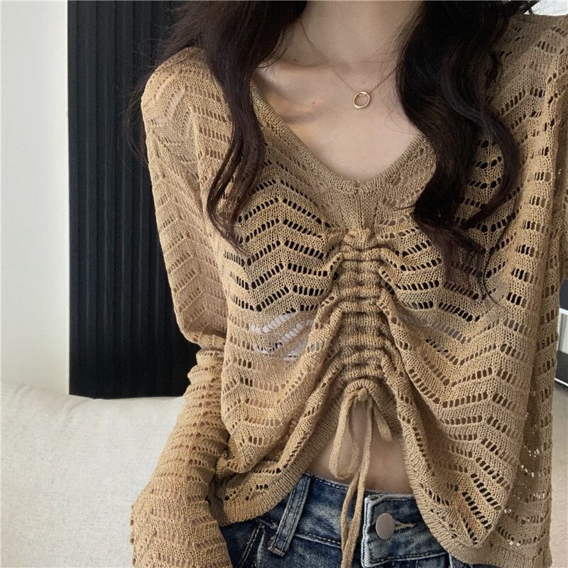 センスニッチ 巾着 中空 日焼け止め ブラウス レディース 薄手 夏 ゆったり 長袖 ショート Vネック セーター トップス ロング サマー 夏物 7460014911382288 | framboise21