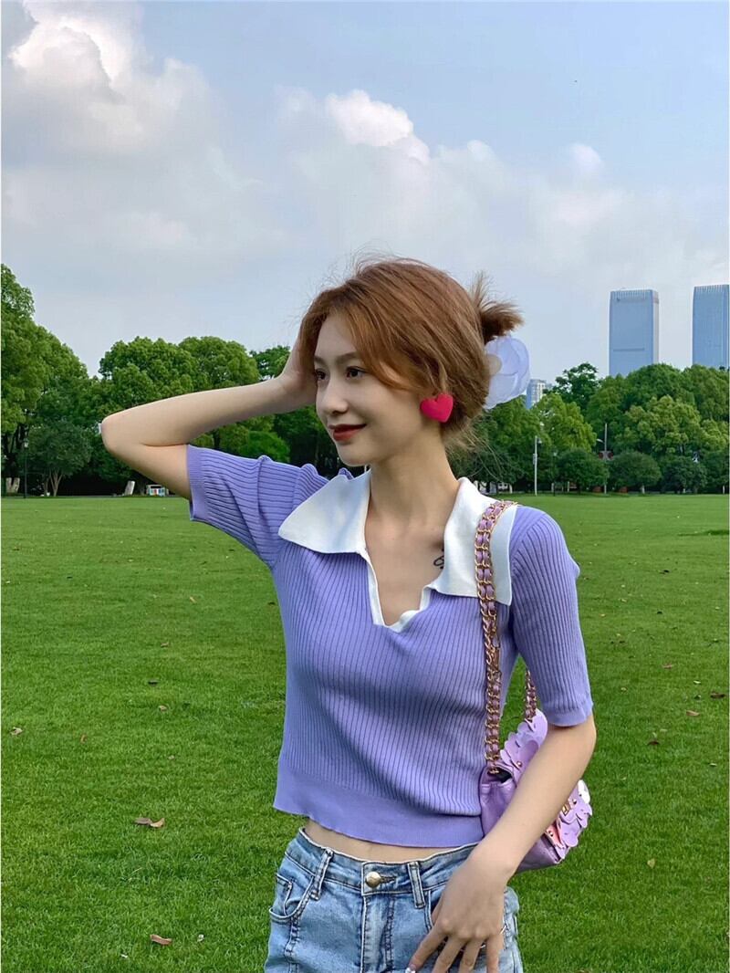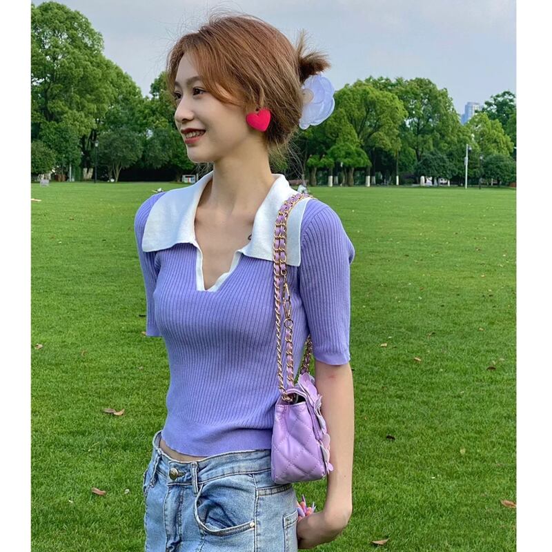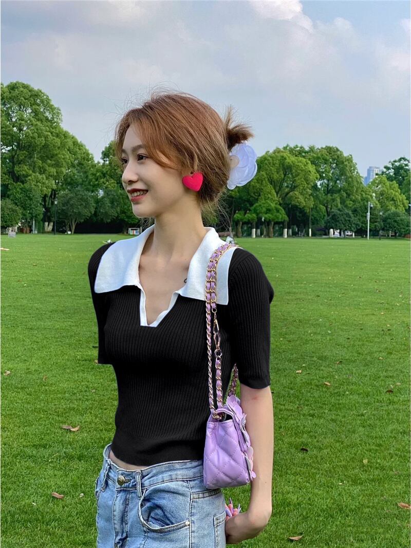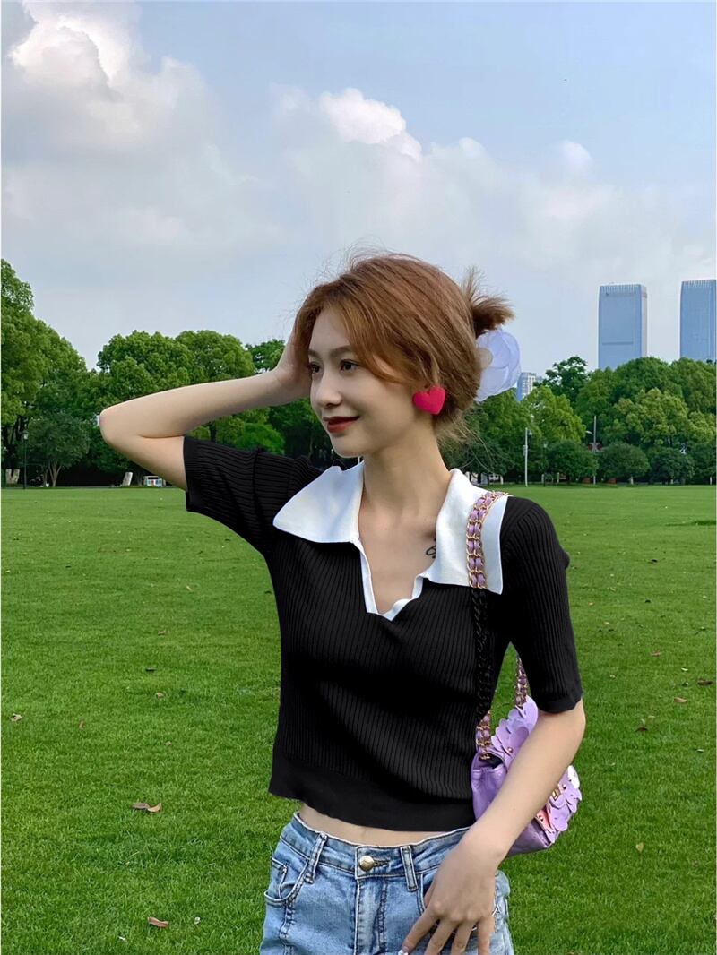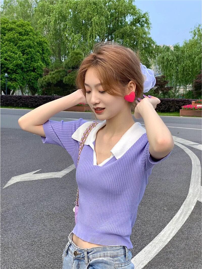 スリムフィットでスリムなVネックフロントショルダー半袖Tシャツ レディース サマーシック コントラストカラー ポロシャツ ハイウエスト クロップド へそ ショート ニットトップス ハイウェスト 夏物 7460092913700609 | framboise21