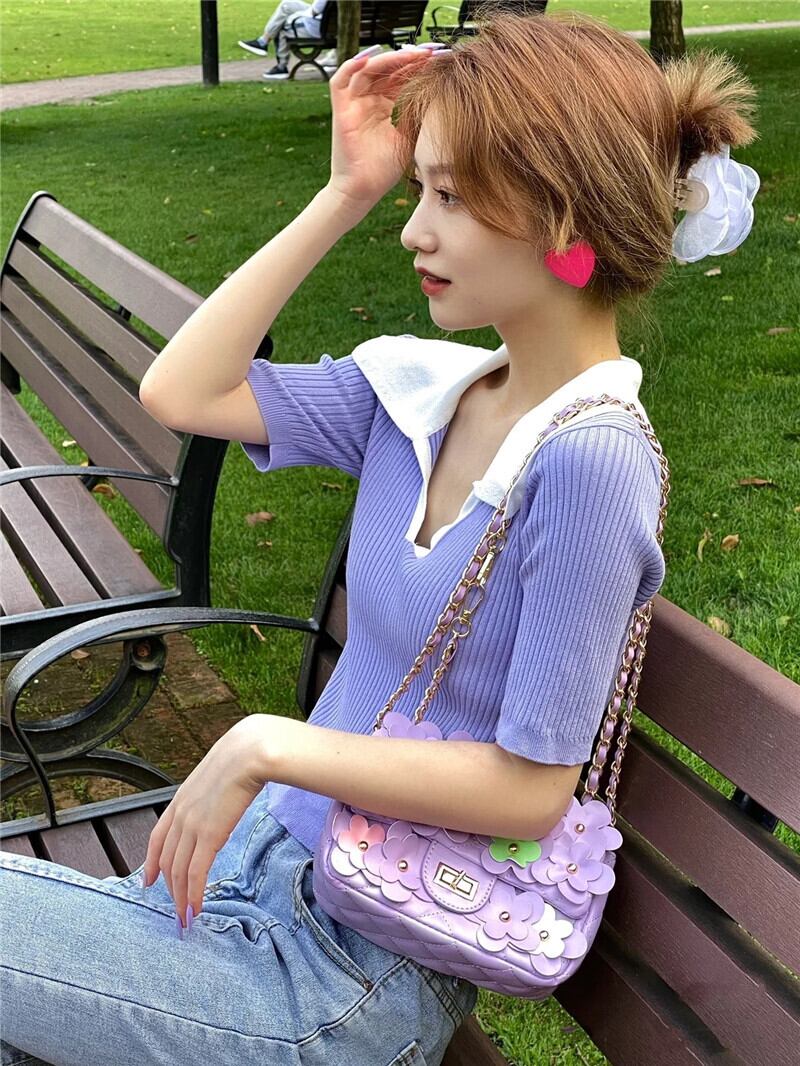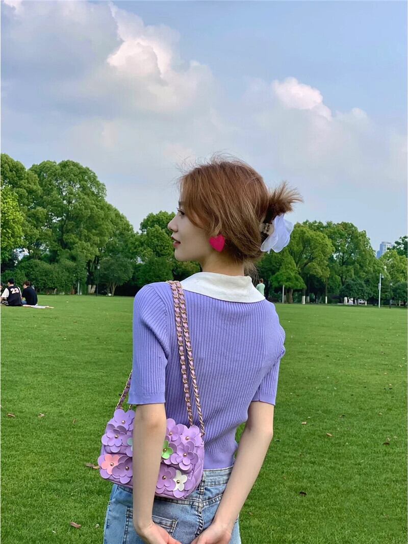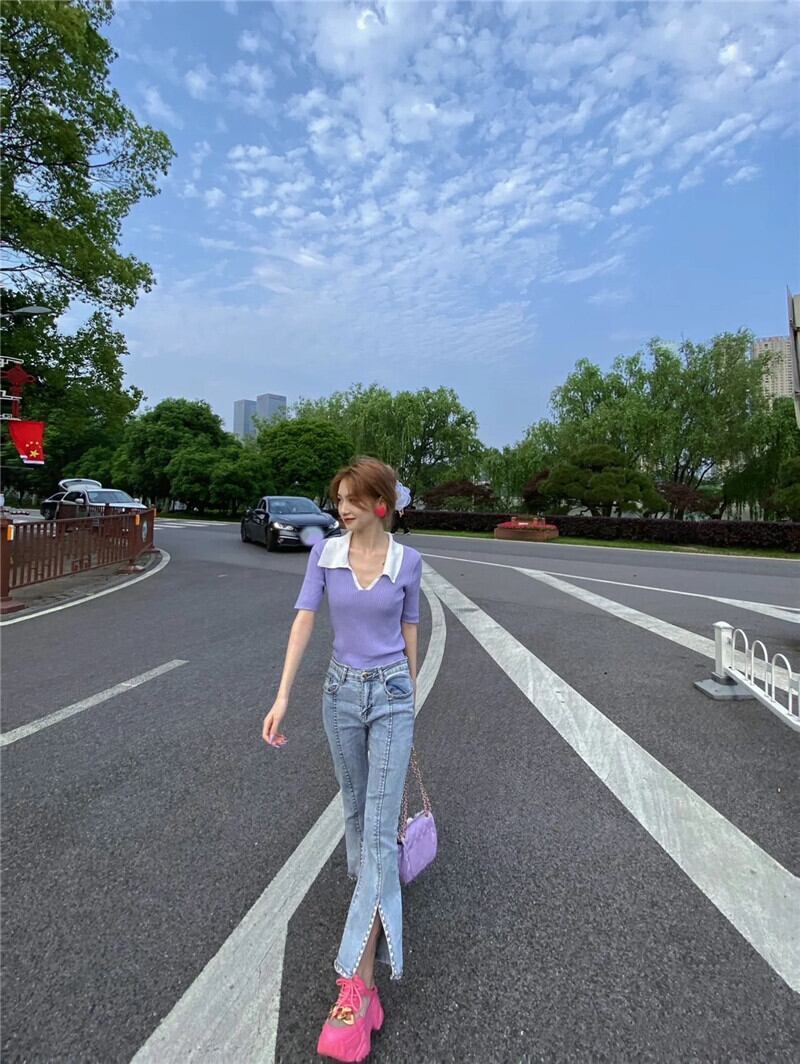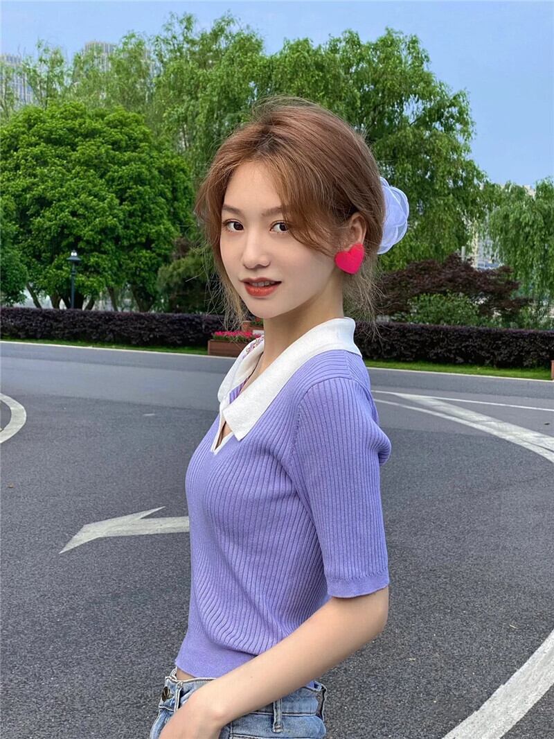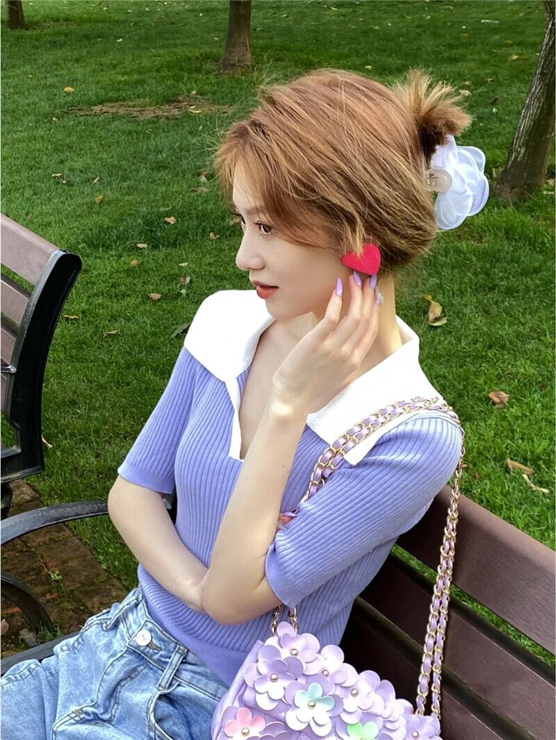 スリムフィットでスリムなVネックフロントショルダー半袖Tシャツ レディース サマーシック コントラストカラー ポロシャツ ハイウエスト クロップド へそ ショート ニットトップス ハイウェスト 夏物 7460092913700609 | framboise21