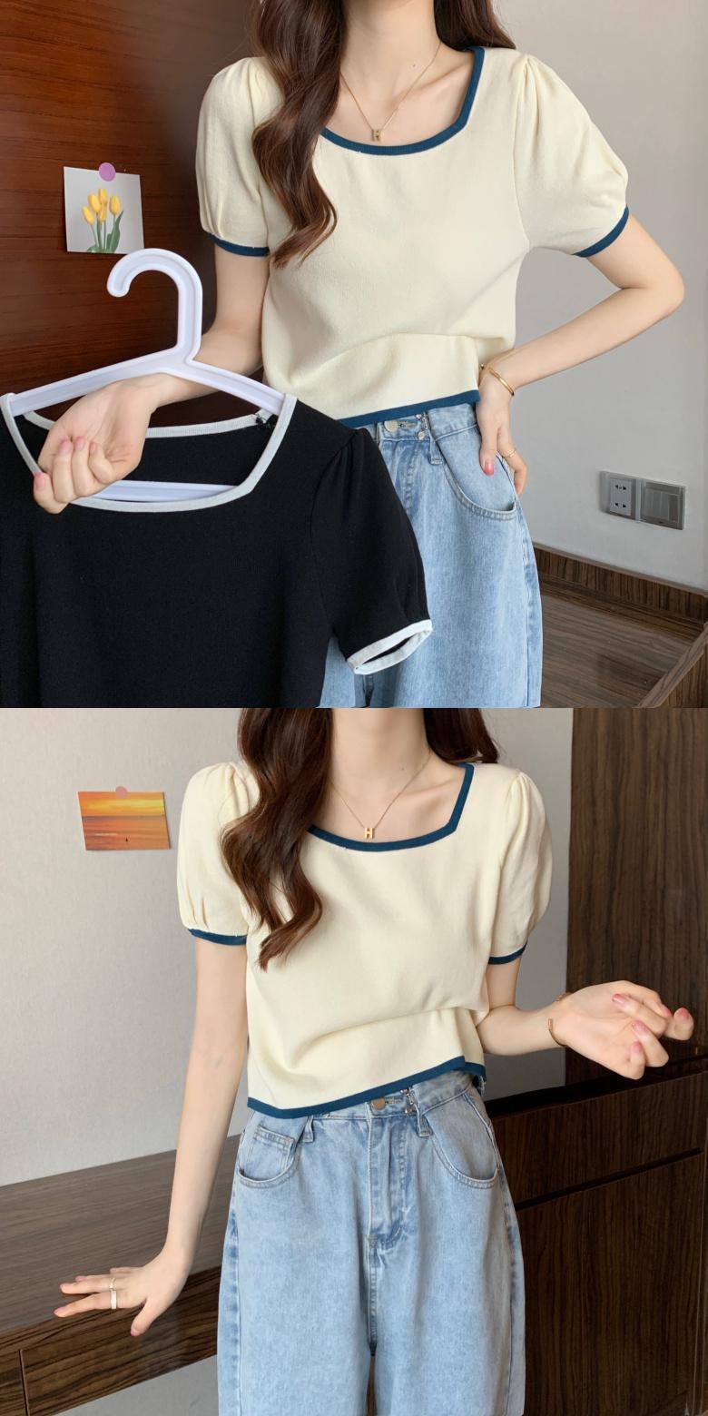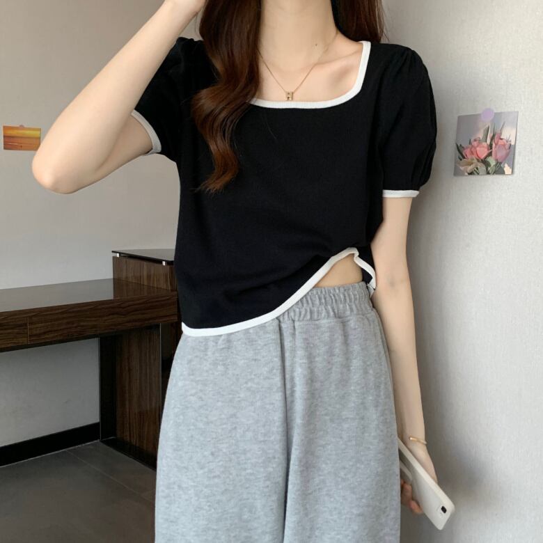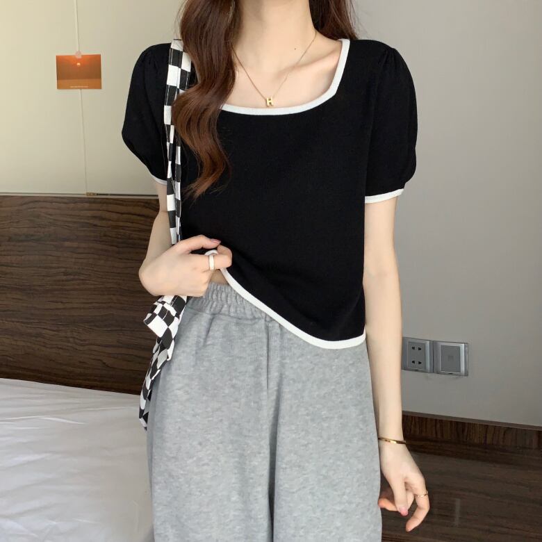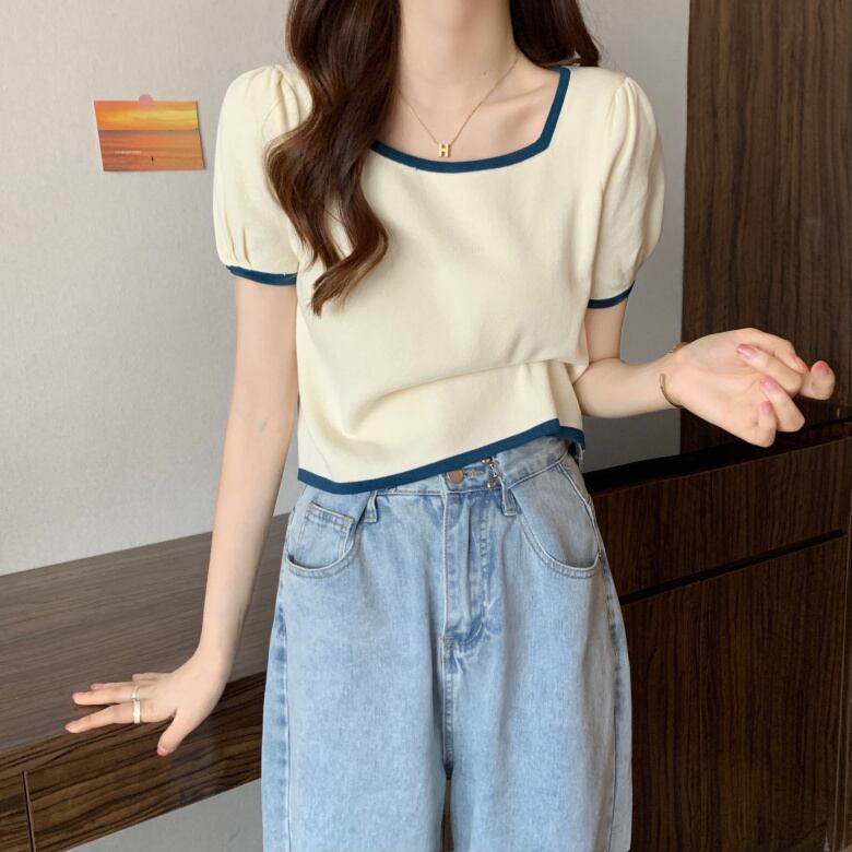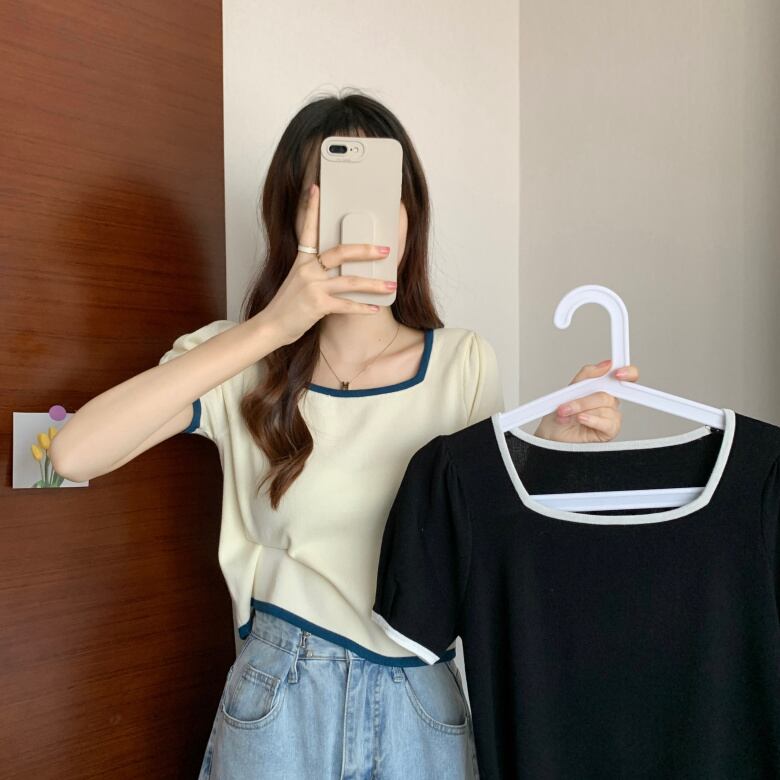 対照的な色のユニークな特別なフロント ショルダー半袖 t シャツ女性の 2022 年夏の新しいニッチなデザイン薄いショート トップ サマー 夏物 Tシャツ 7460018549139230 | framboise21