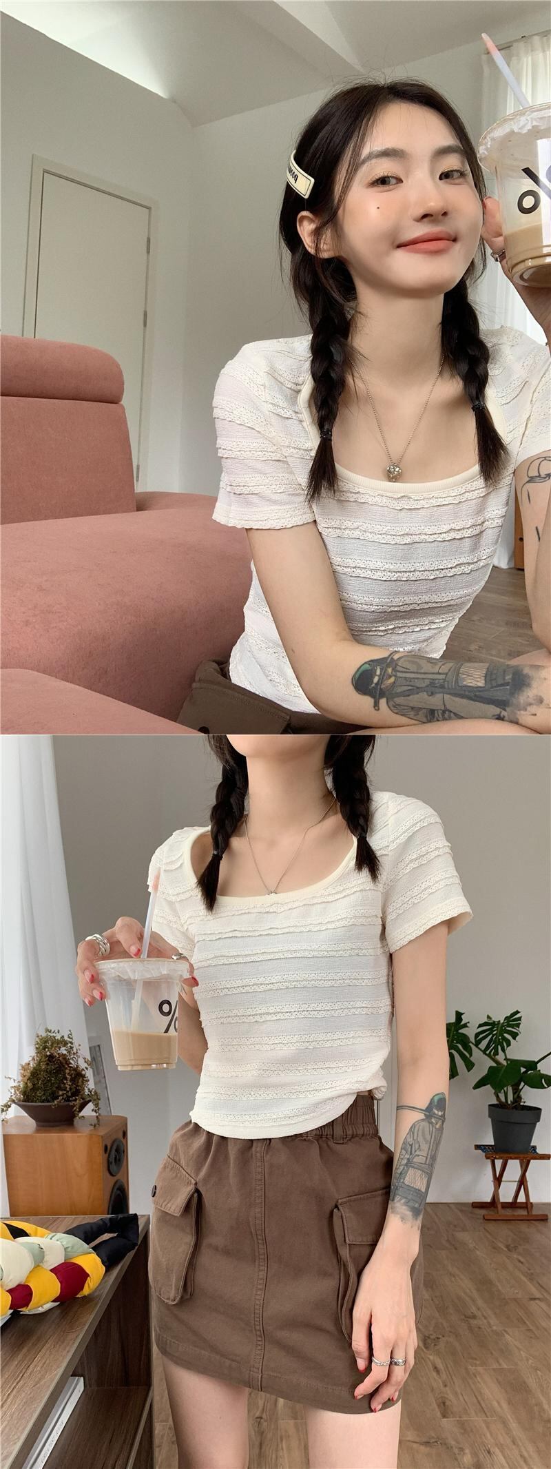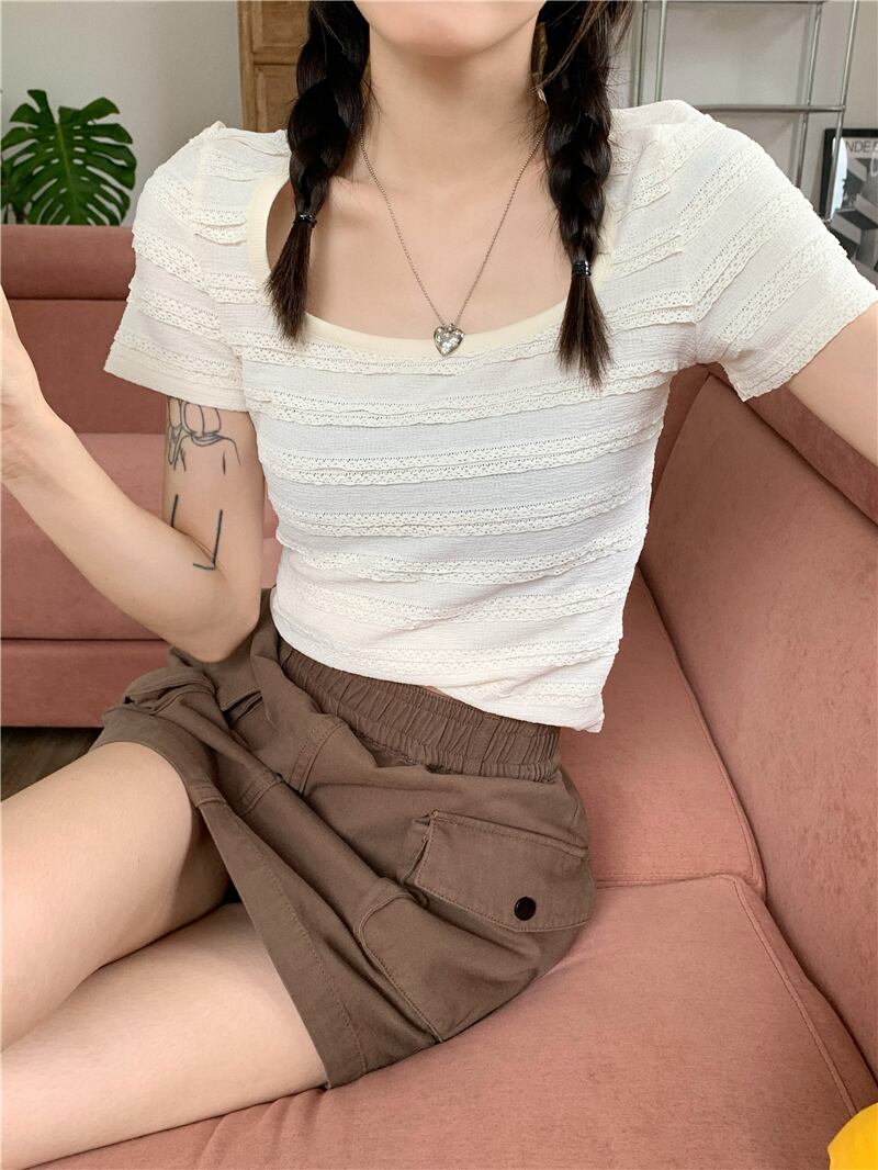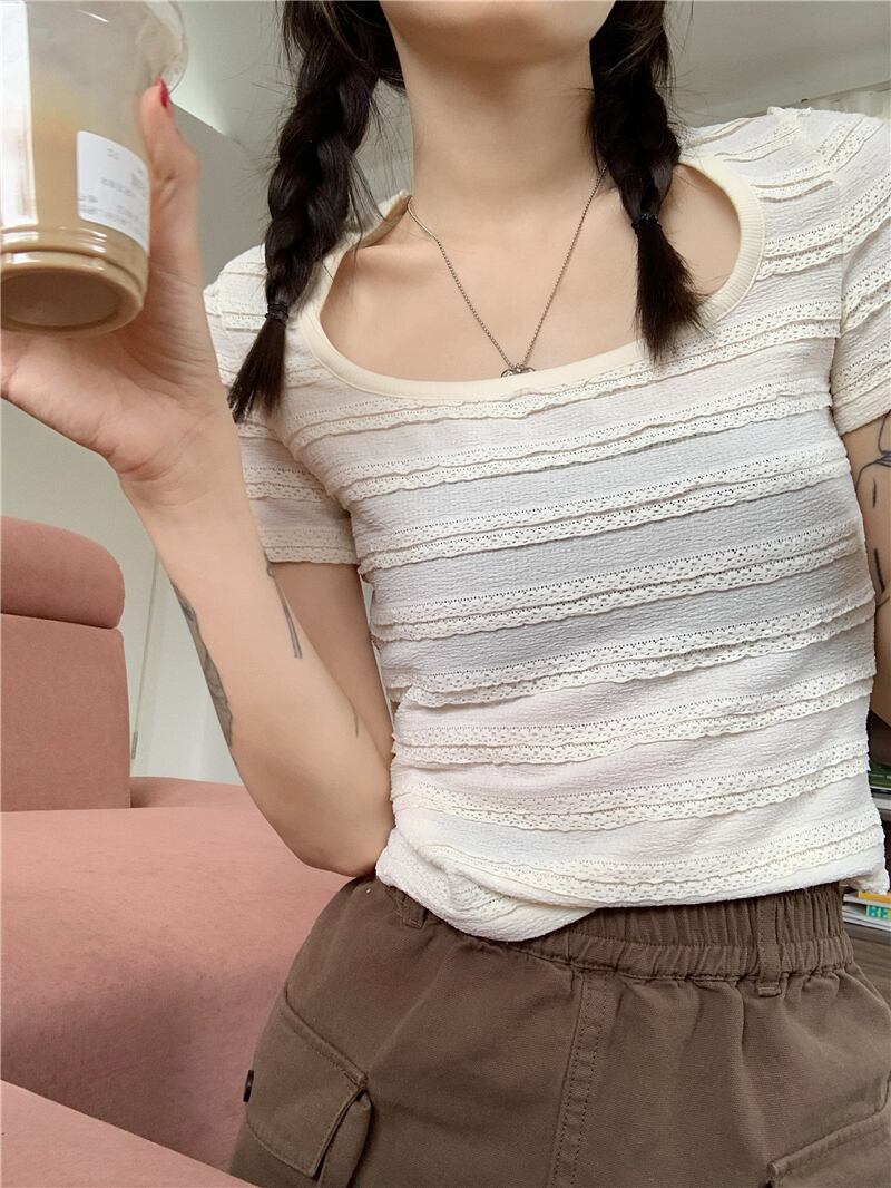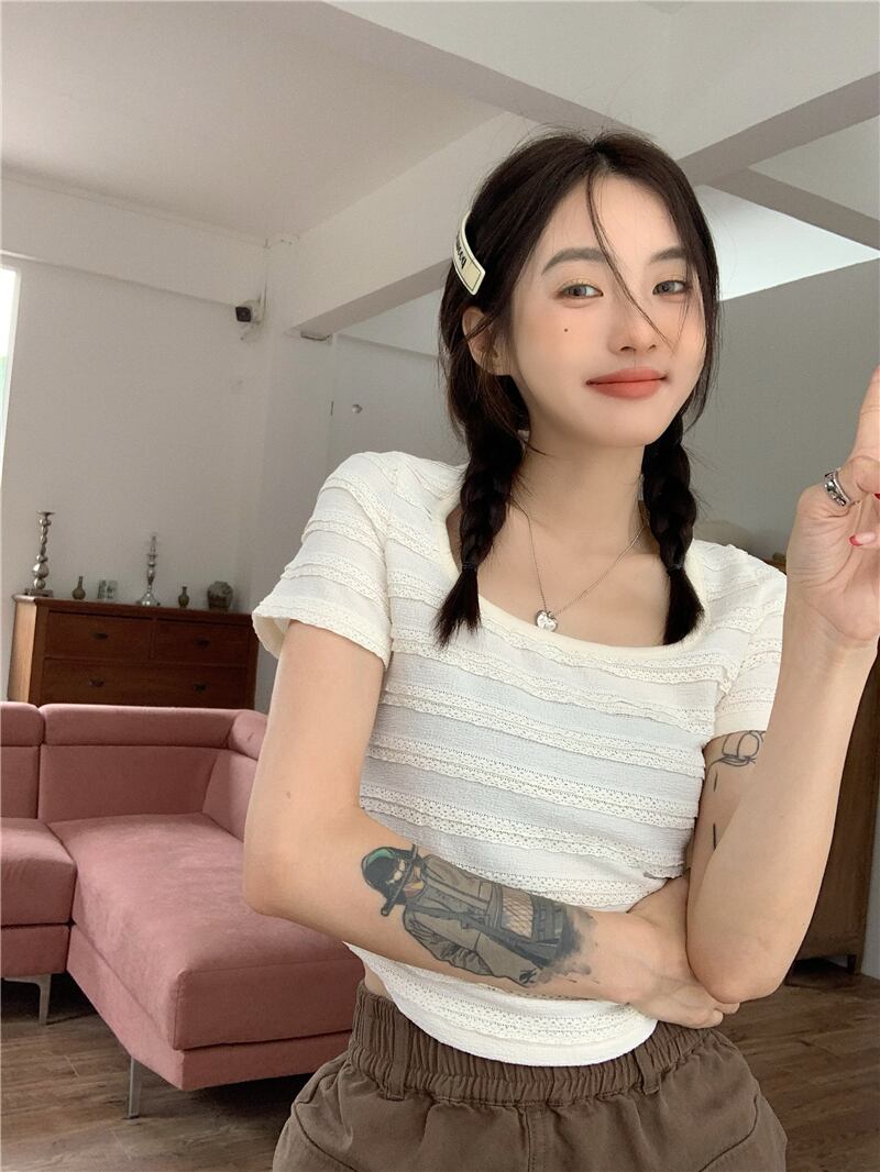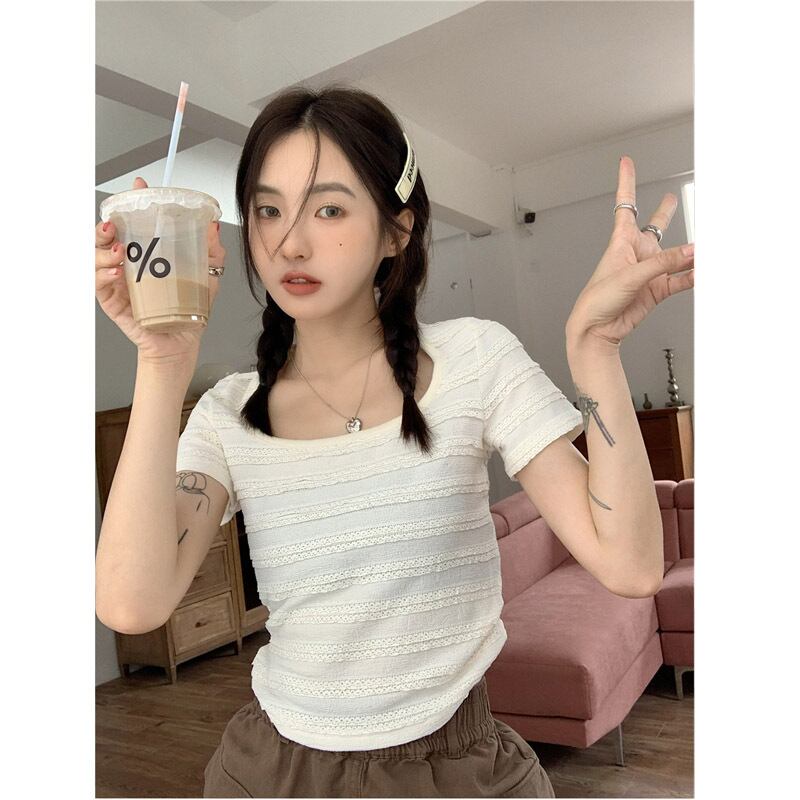 甘風レーススクエアカラー半袖Tシャツレディースサマーデザインセンスニッチ気質スリムショートトップ女性 大人ガーリー スウィート キュート カジュアル 夏物 スクウェア 7460079991427868 | framboise21