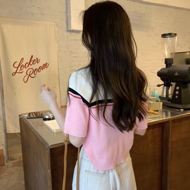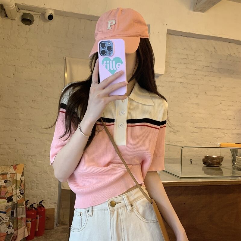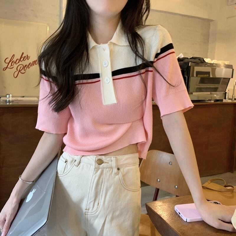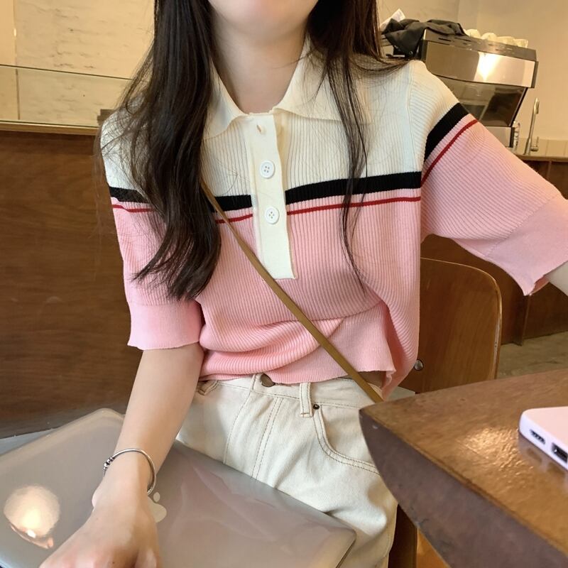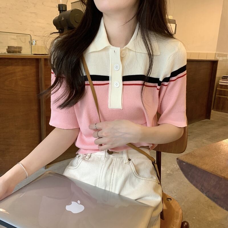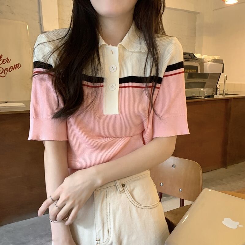 バージョン 薄手 ポロシャツ 夏物 洋風 薄手 半袖 アイスシルク セーター 甘め コントラストカラー トップス ワイウェア 大人ガーリー スウィート キュート カジュアル サマー 7460073600081545 | framboise21