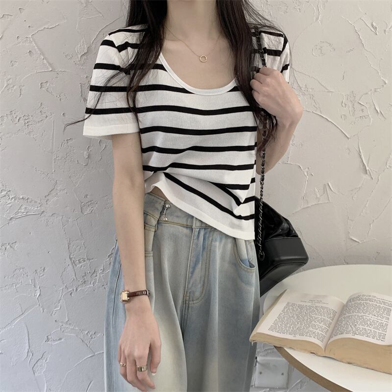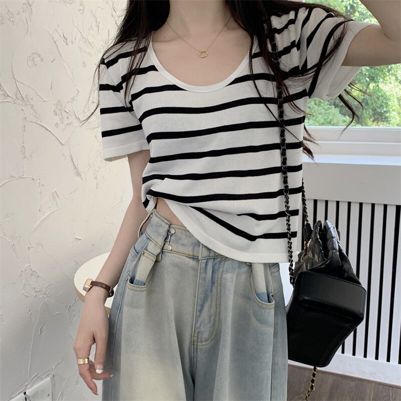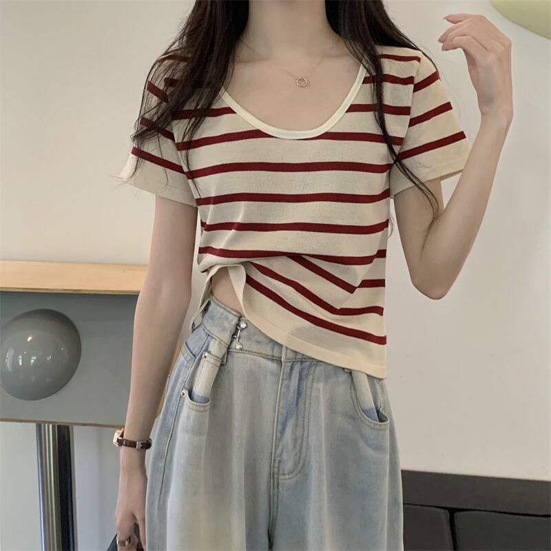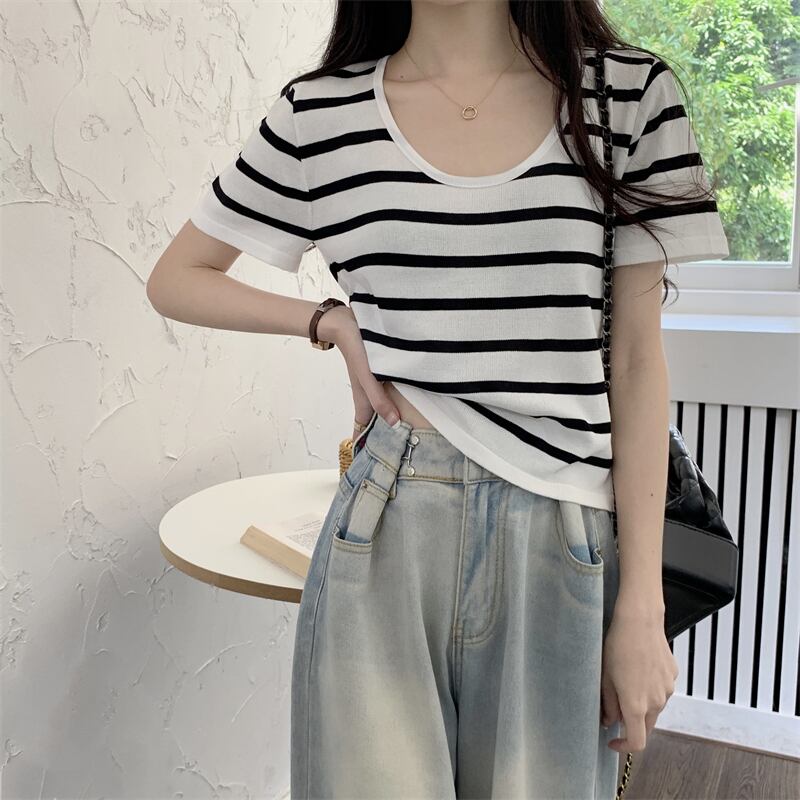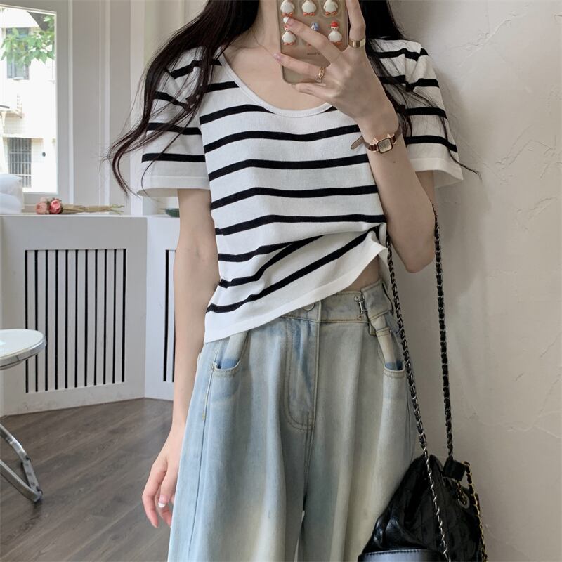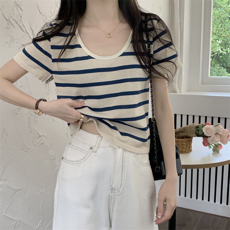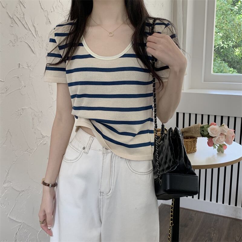 アイスシルク半袖フロントショルダー tシャツ女性の夏のフレンチ鎖骨ニッチ薄い eign スタイルユニークな短いストライプトップ ショート サマー 夏物 7460091771172075 | framboise21