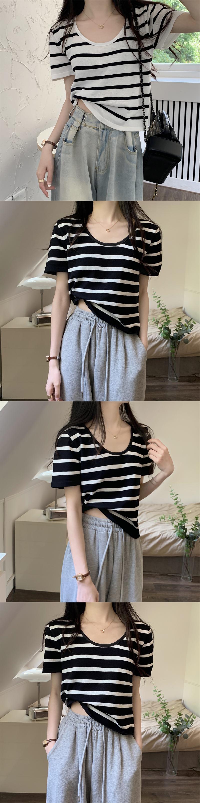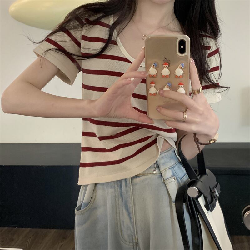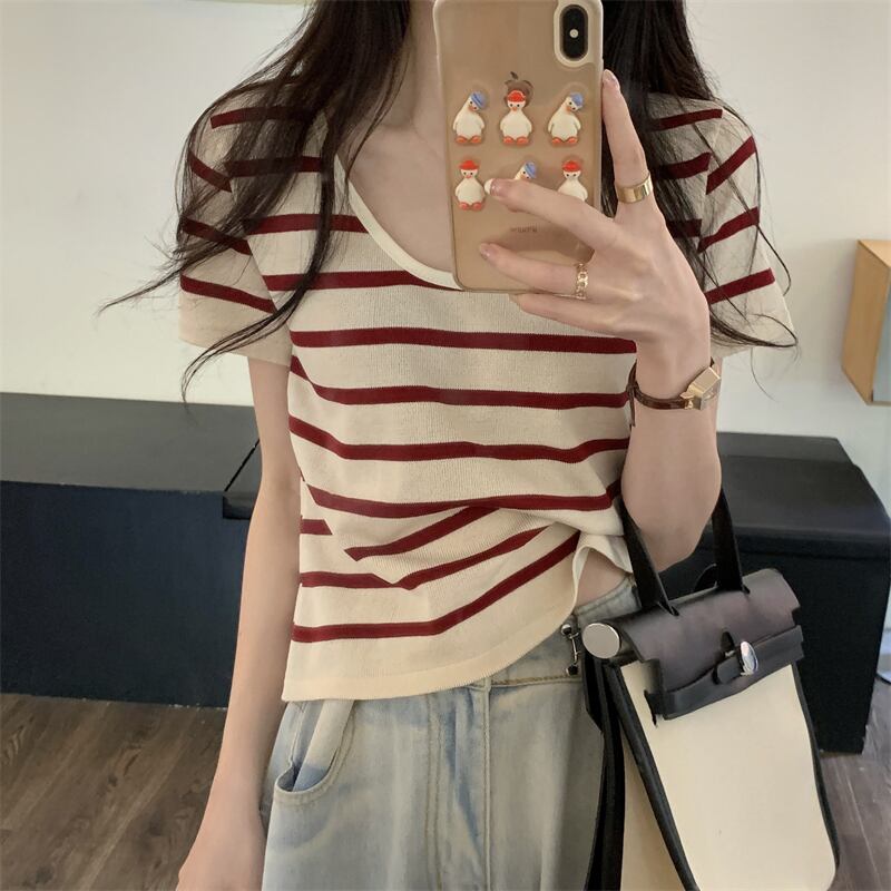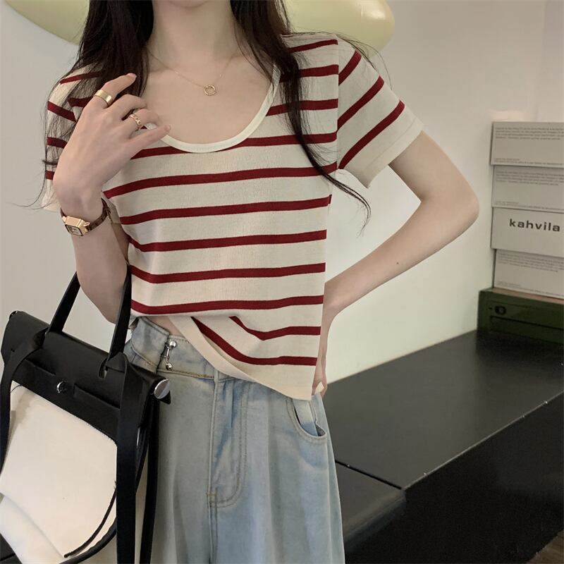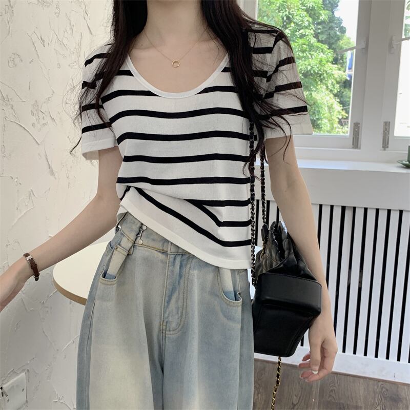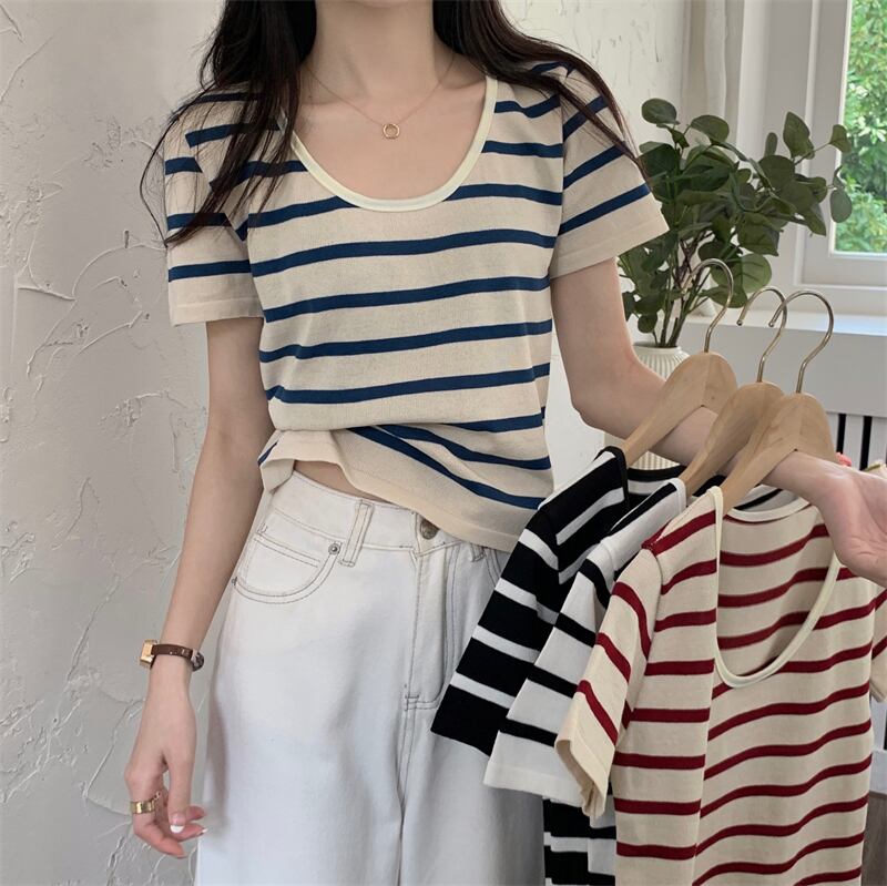アイスシルク半袖フロントショルダー tシャツ女性の夏のフレンチ鎖骨ニッチ薄い eign スタイルユニークな短いストライプトップ ショート サマー 夏物 7460091771172075 | framboise21