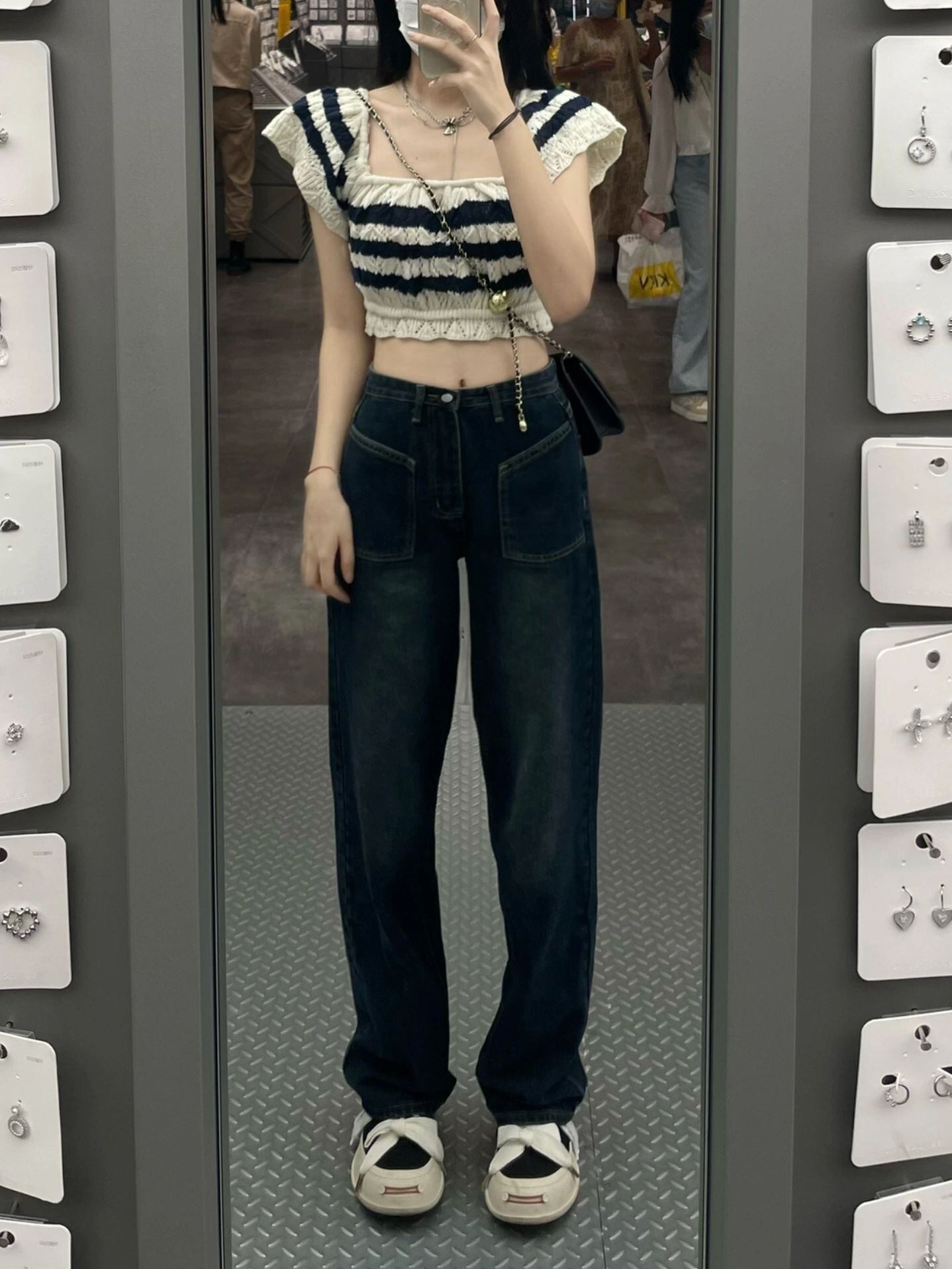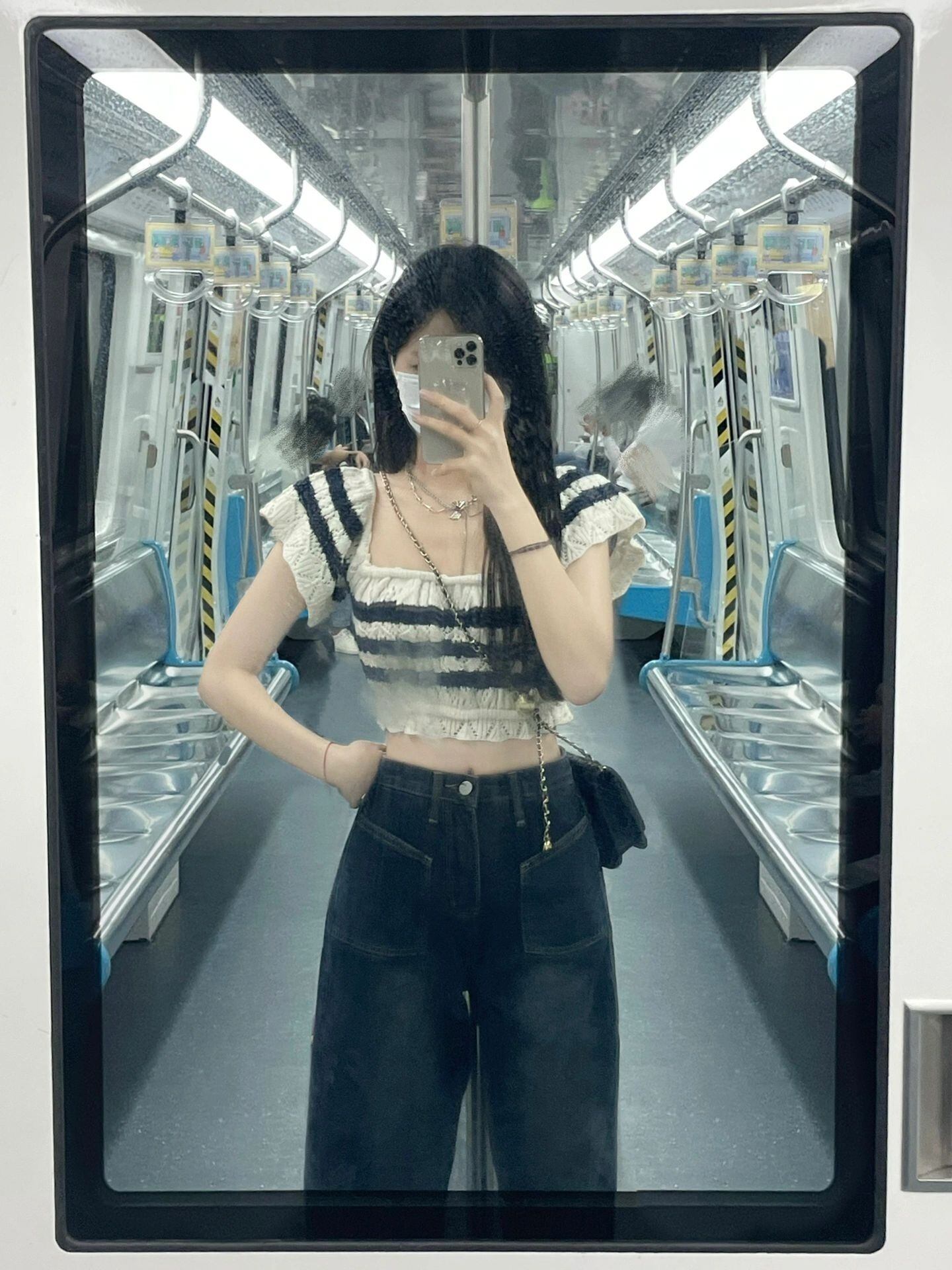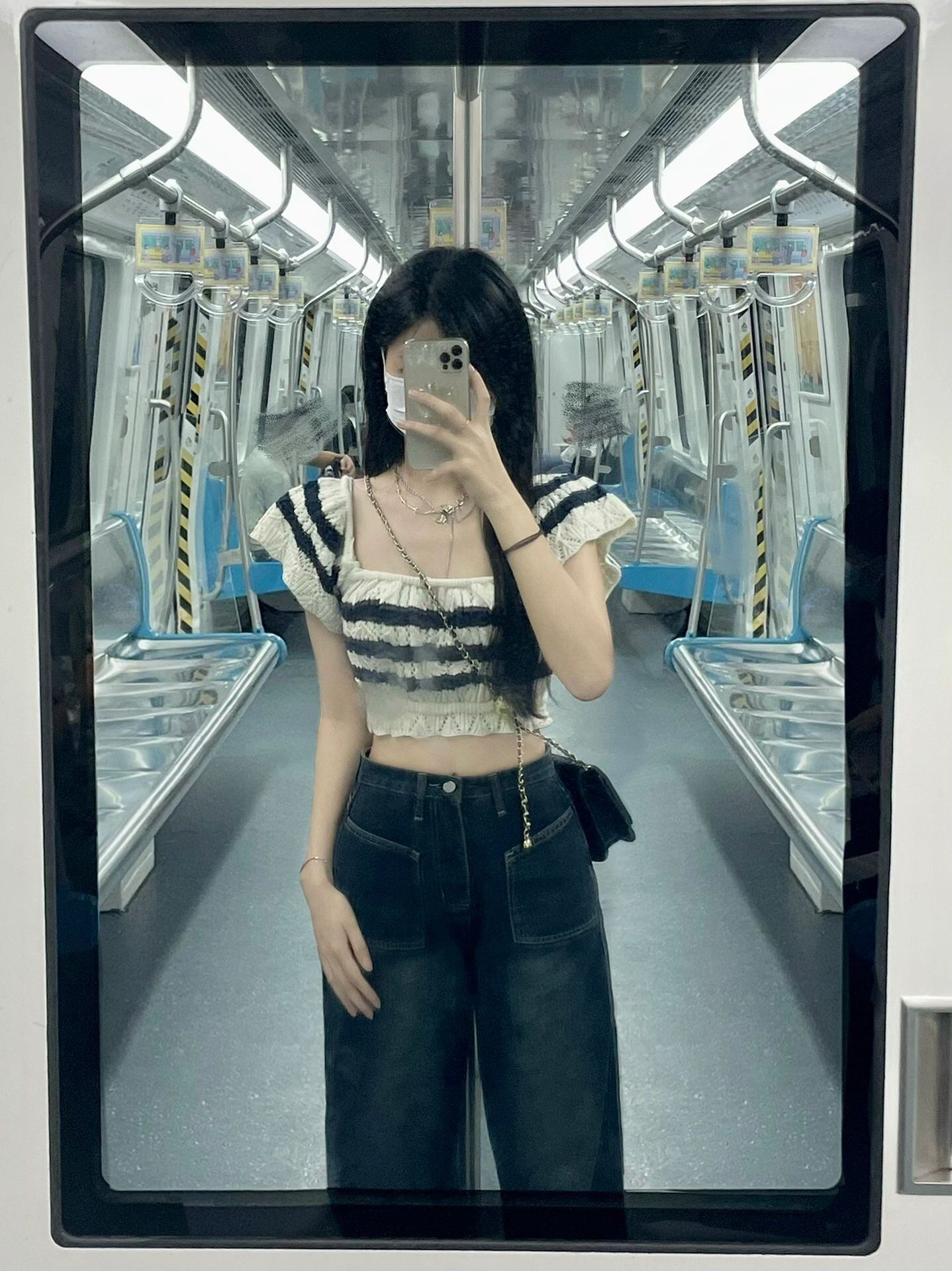 ストライプ ニット半袖レトロ フロント ショルダー t シャツ女性の 2022 年夏新しいショート トップ デザイン ニッチ サマー 夏物 Tシャツ 7460020754308055 | framboise21
