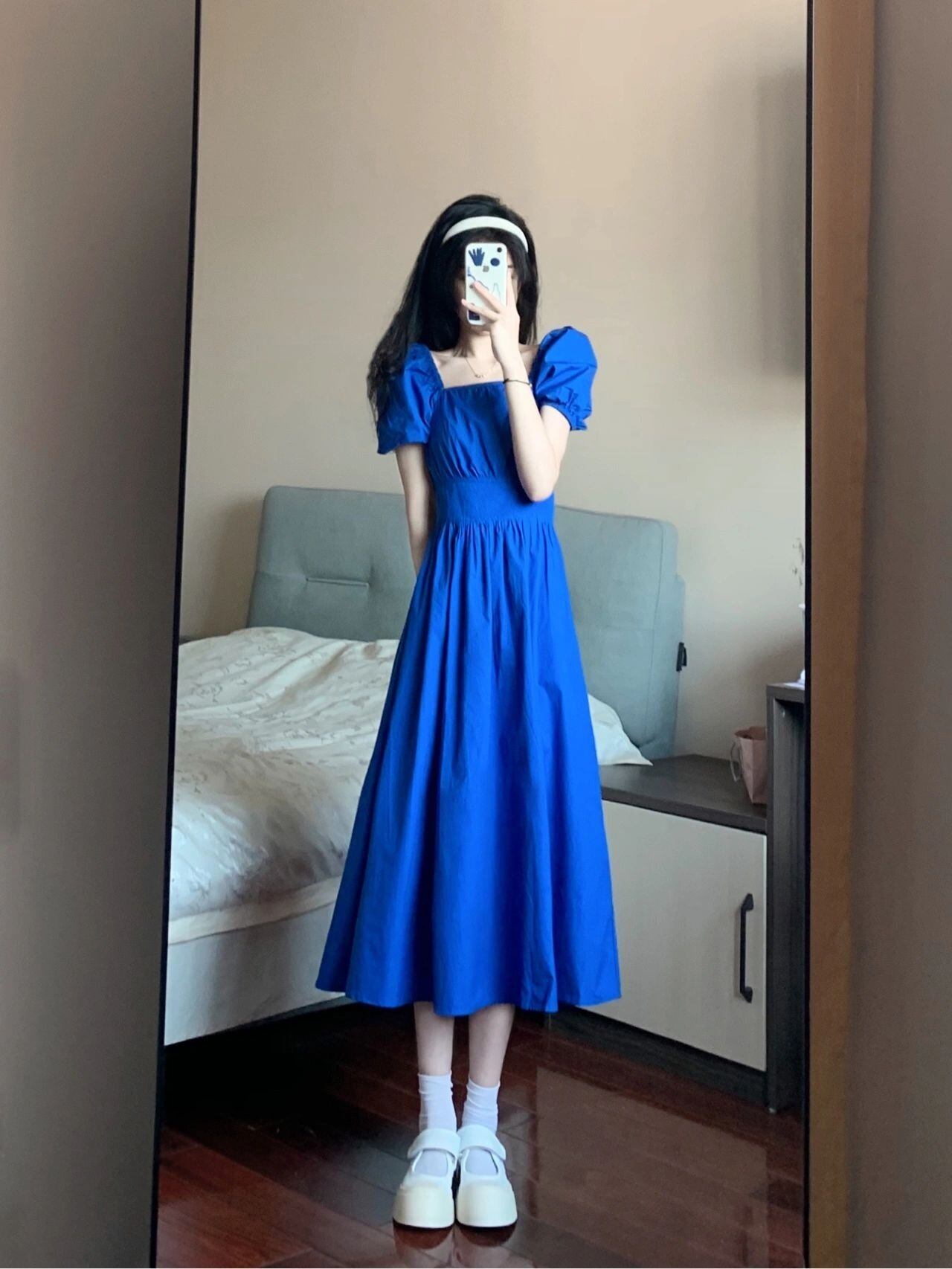 クラインブルースクエアカラードレスレディースサマーカレッジスタイルデザインセンスウエスト薄パフスリーブミドル丈スカート潮 夏物 スクウェア 7460099260052496 | framboise21