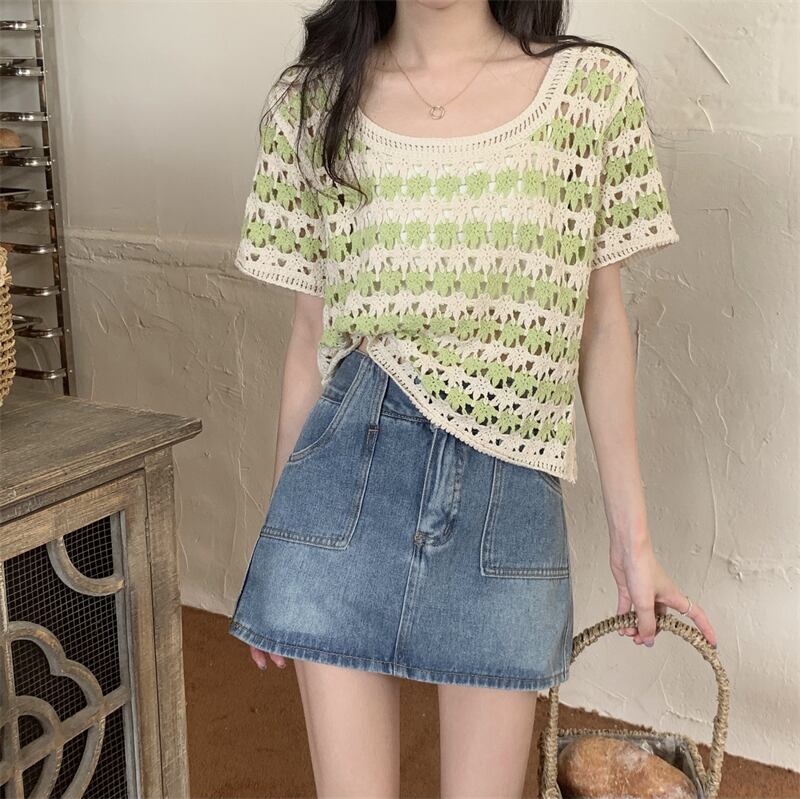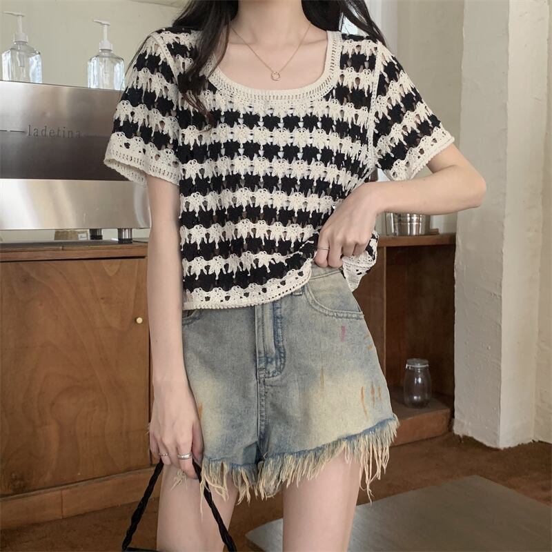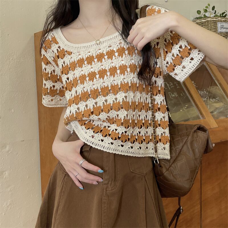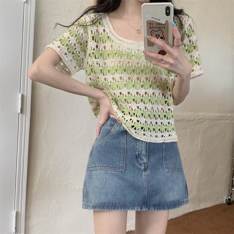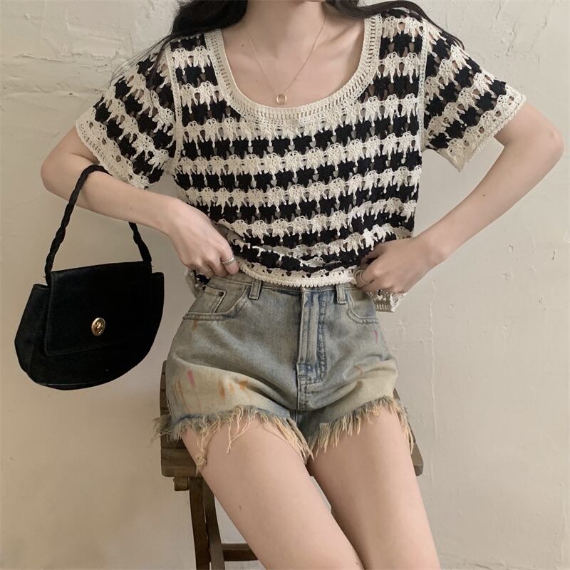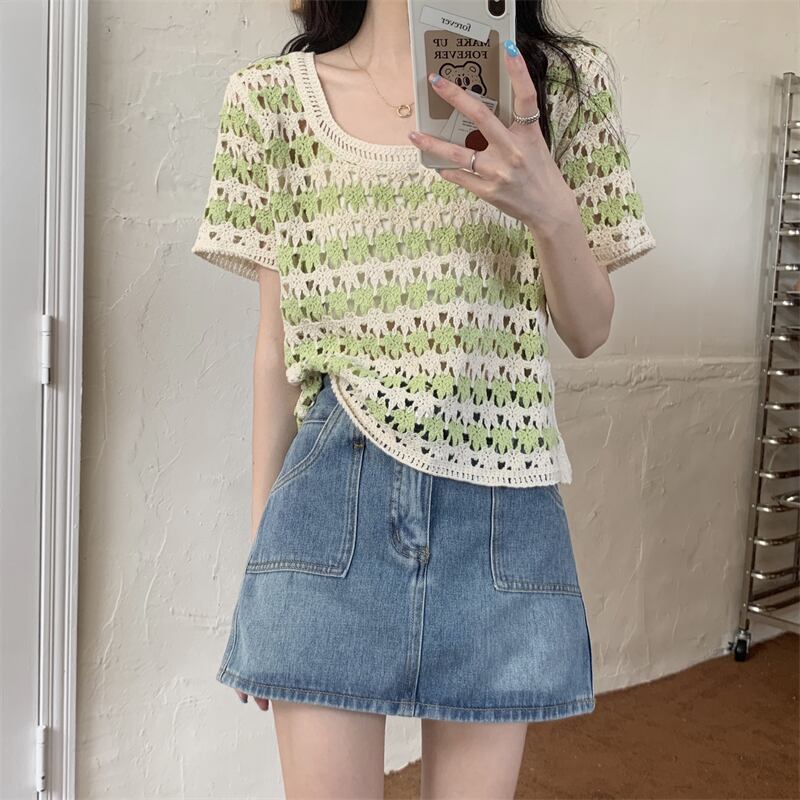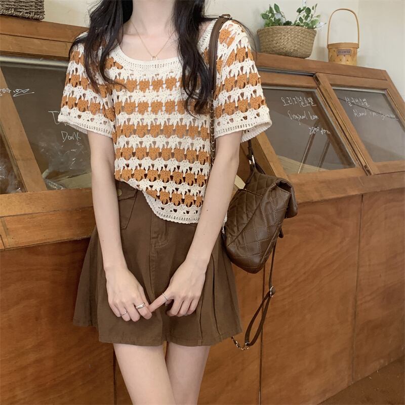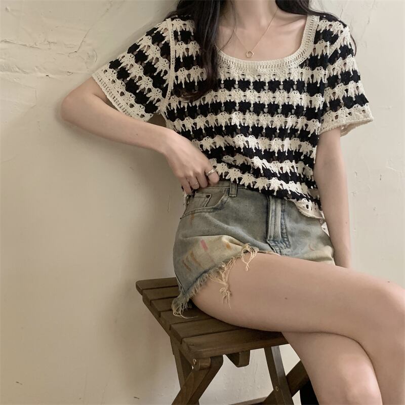 アメリカン レトロ ハイエンド スクエア カラー フロント ショルダー 中空 半袖 ニット Tシャツ レディース 夏 フレンチ シック ショート トップ サマー 夏物 スクウェア 746009141586595 | framboise21
