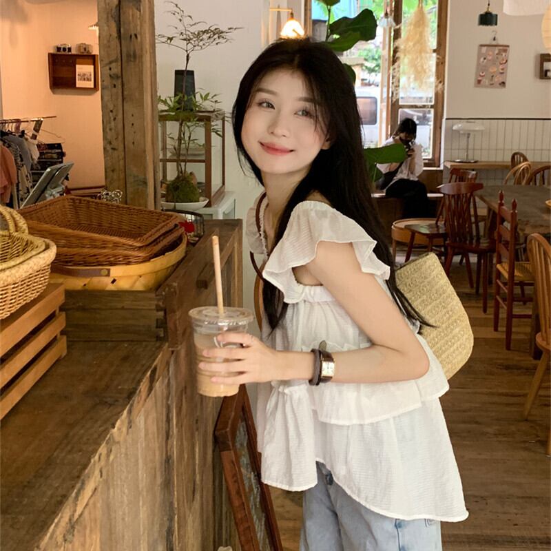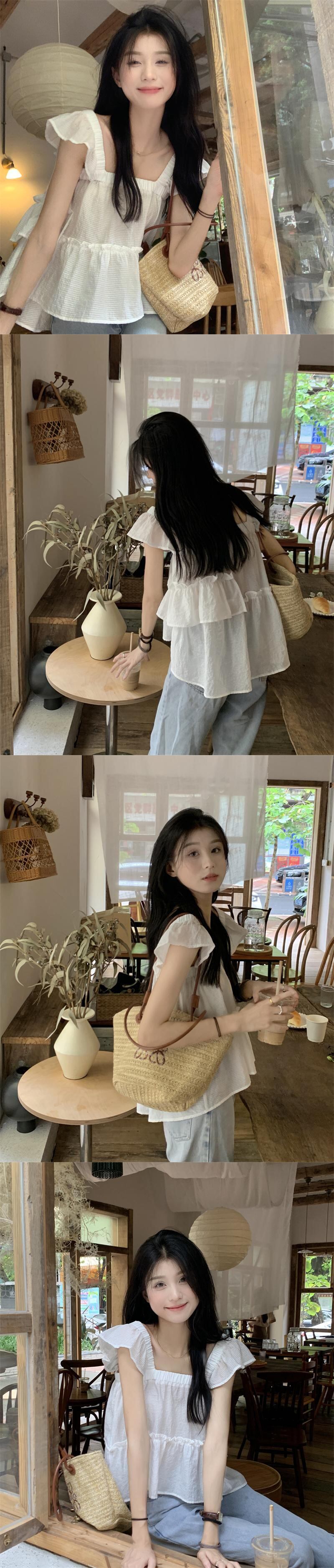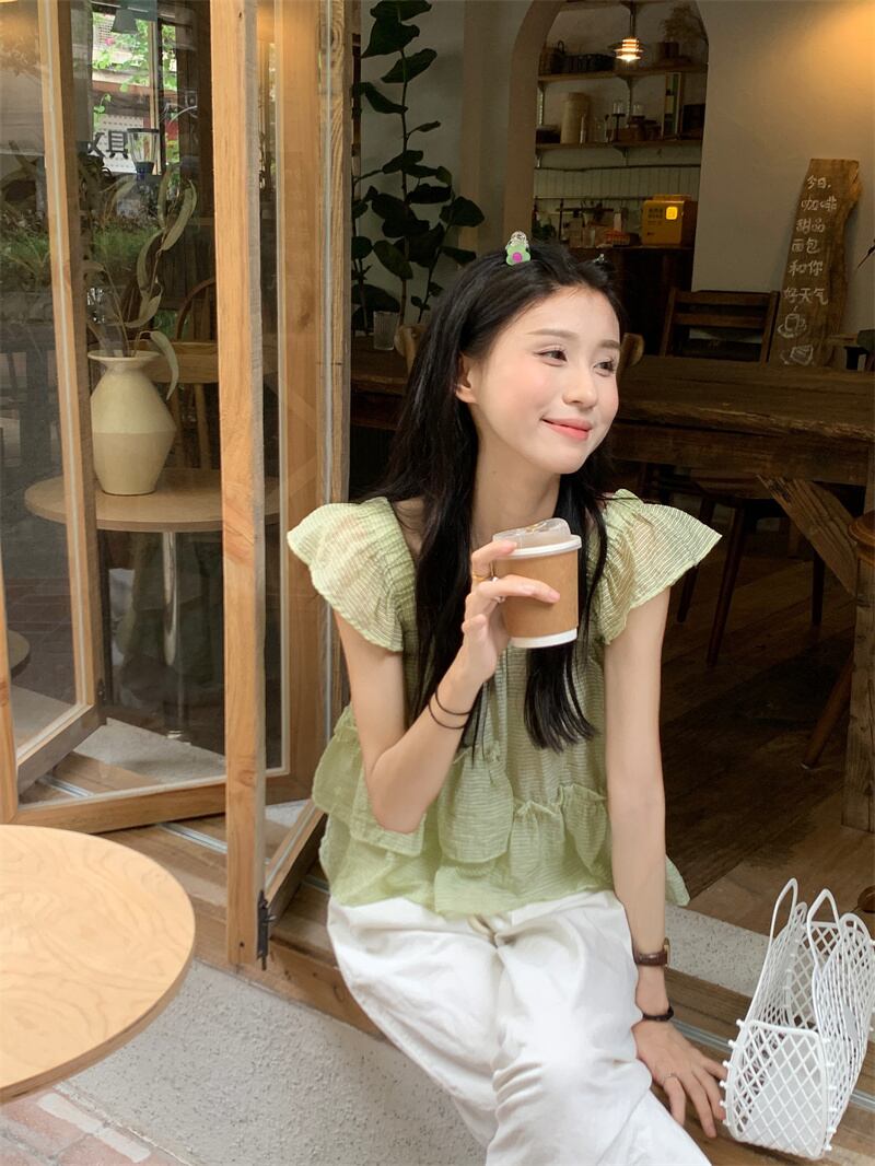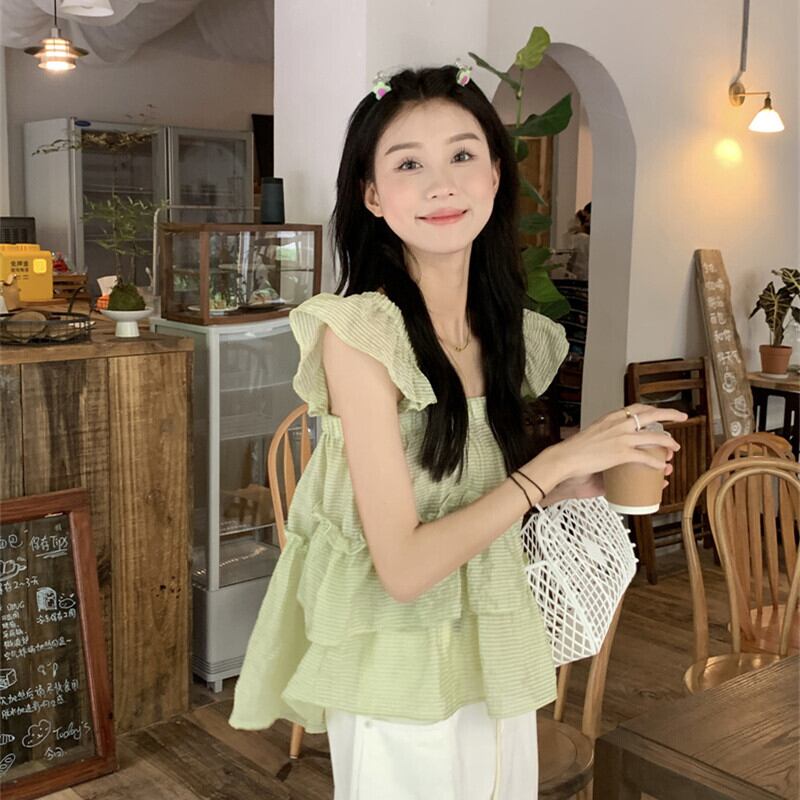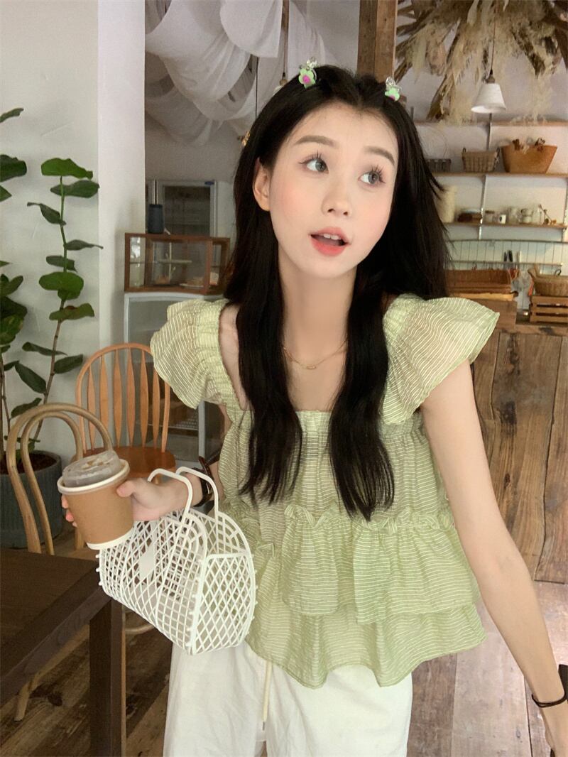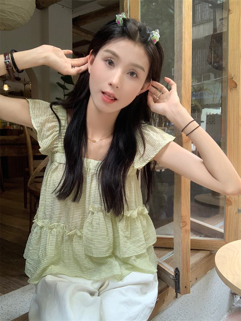 グリーンストライプスクエアネックシャツレディースサマーデザインセンスニッチフレンチスウィートベビーシャツ菌エッジフライングスリーブトップ 大人ガーリー キュート カジュアル 夏物 スクウェア 7460053791405778 | framboise21