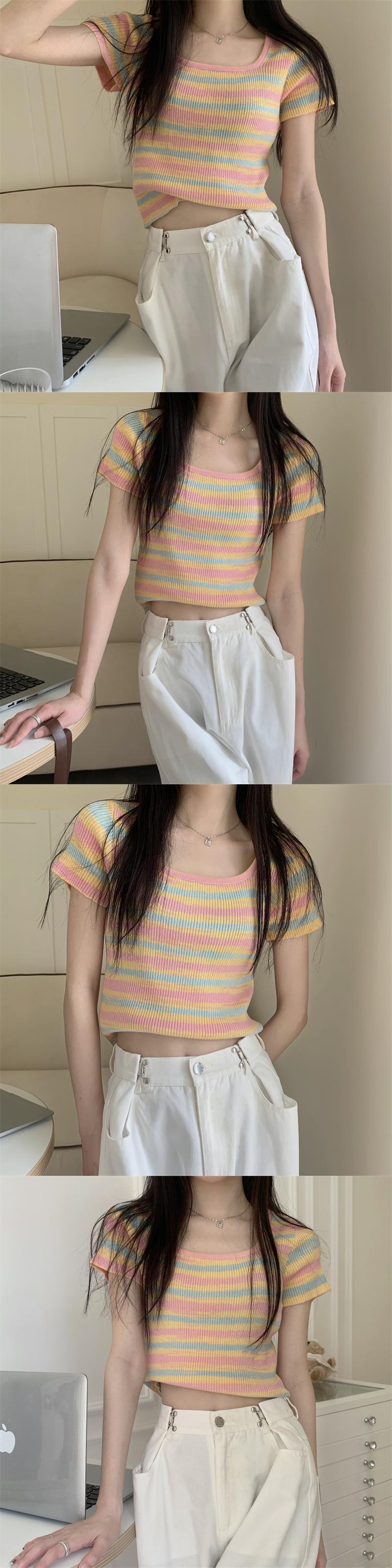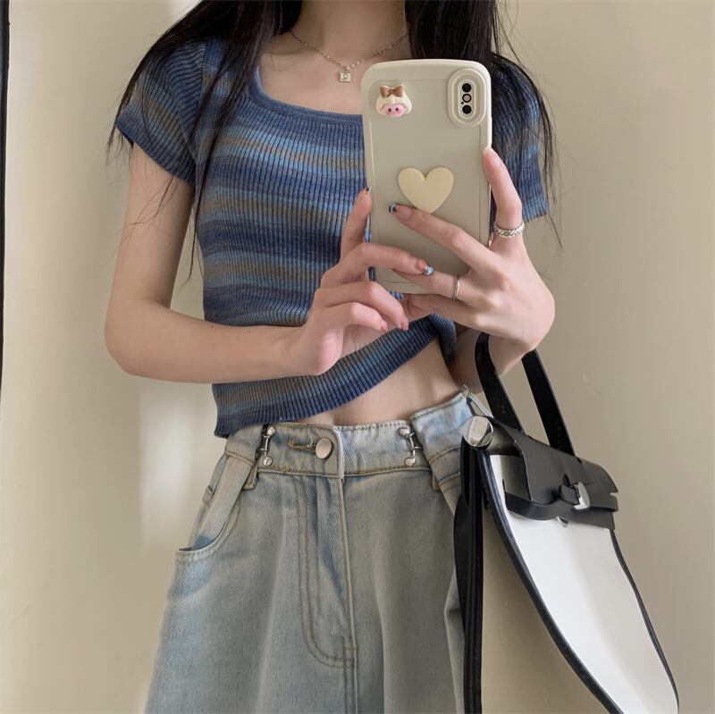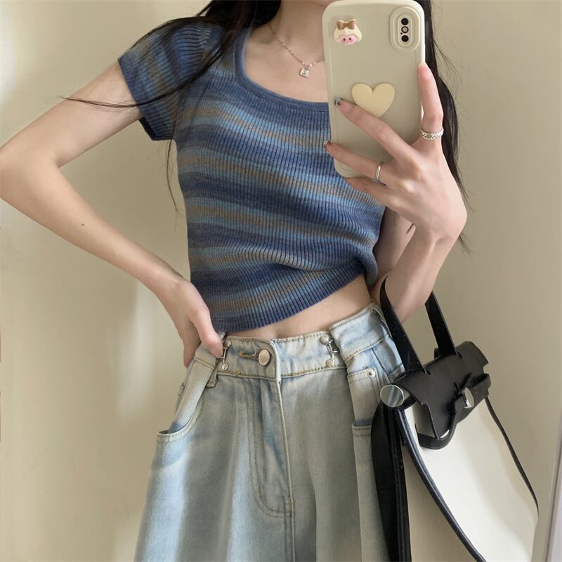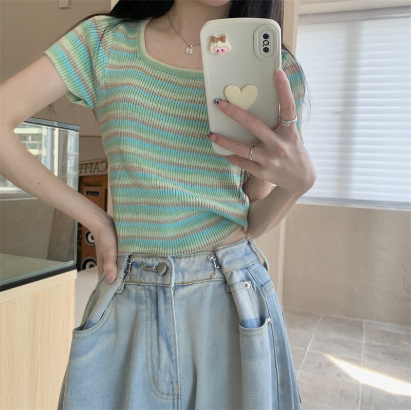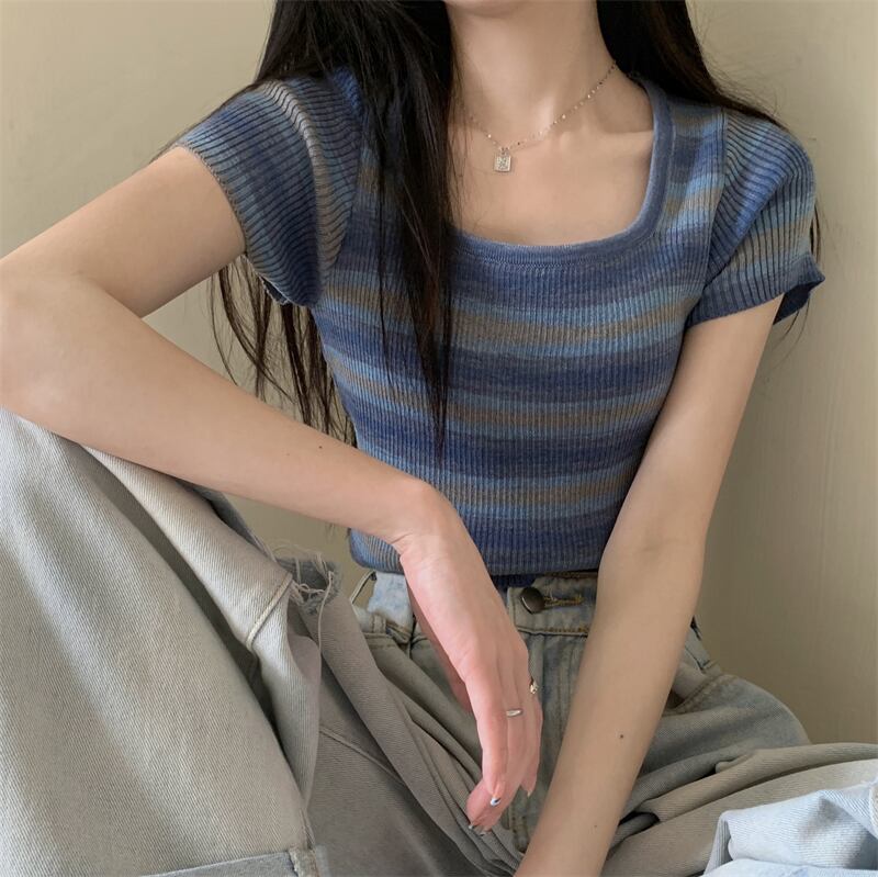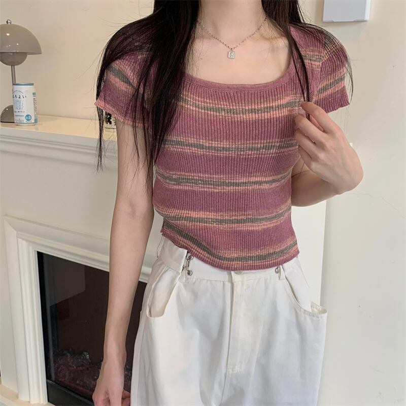 フレンチスクエアカラー鎖骨半袖Tシャツレディースサマーデザインニッチストライプニットフロントショルダーハイウエストショートトップ ハイウェスト 夏物 スクウェア 7460017639904187 | framboise21