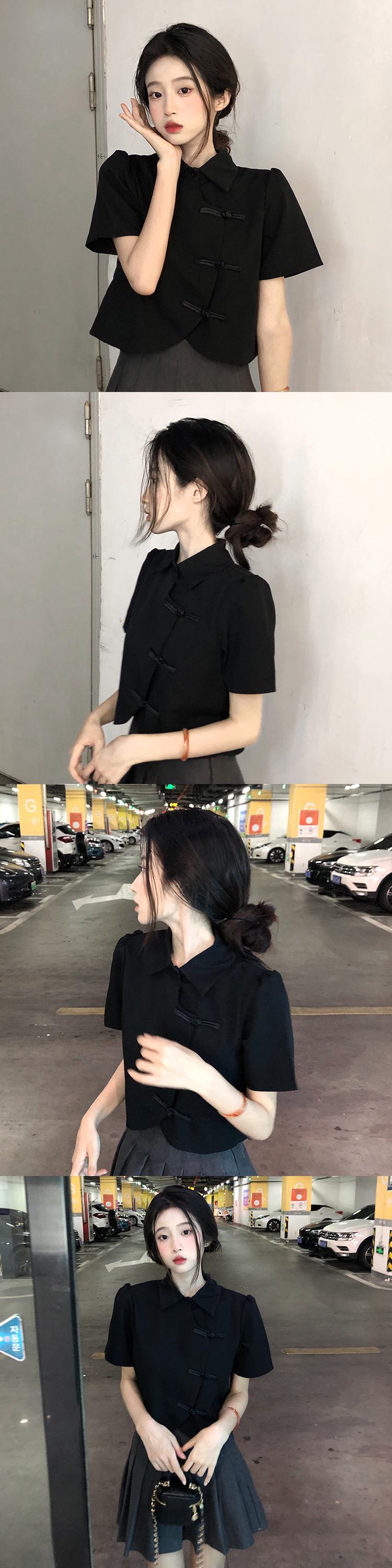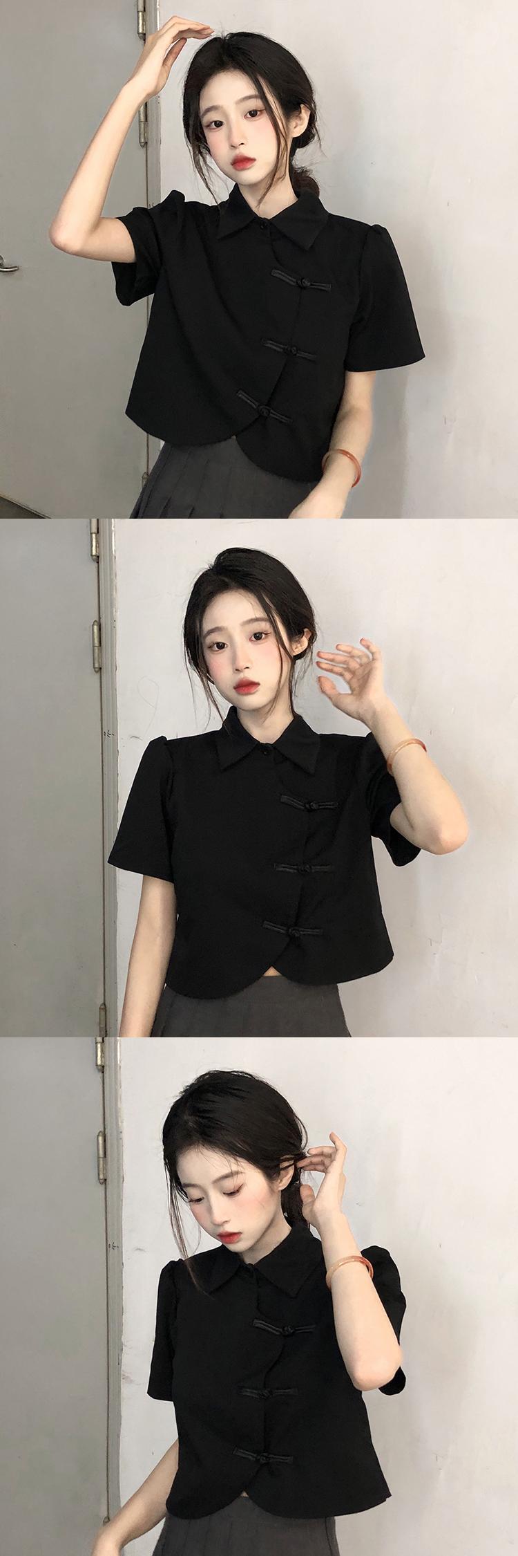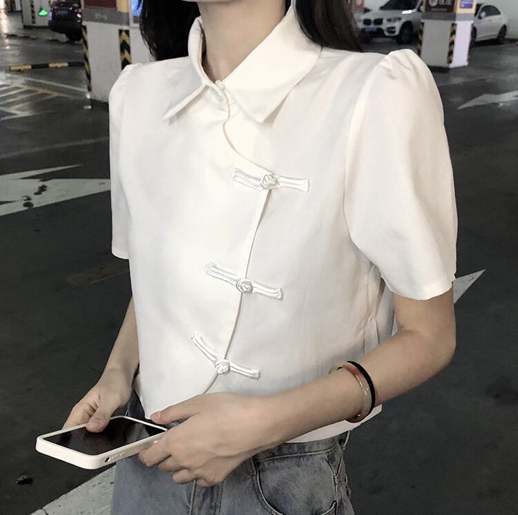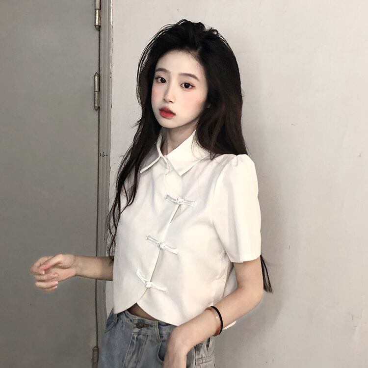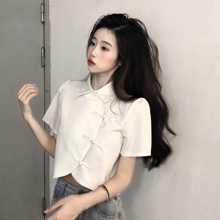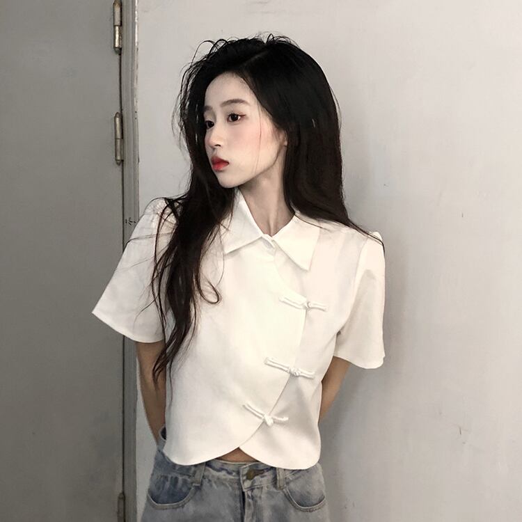 中国風の白い半袖シャツの女性の夏のデザインの小さな不規則なボタンの甘くてスパイシーなスリムなショートトップ ホワイト 大人ガーリー スウィート キュート カジュアル サマー 夏物 7460094573264606 | framboise21