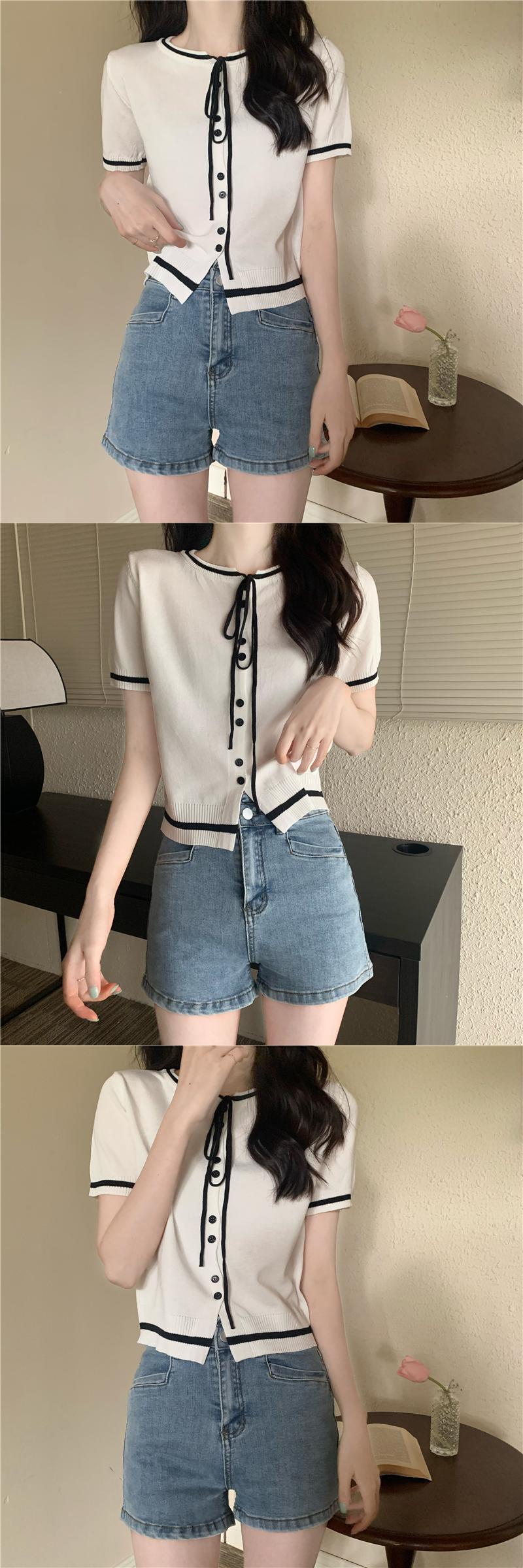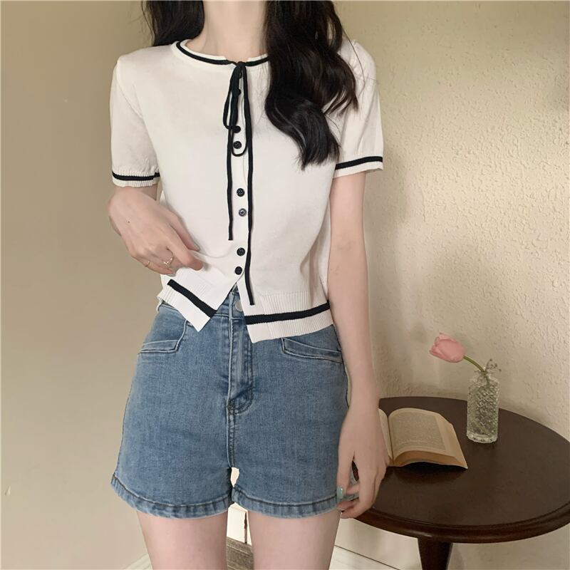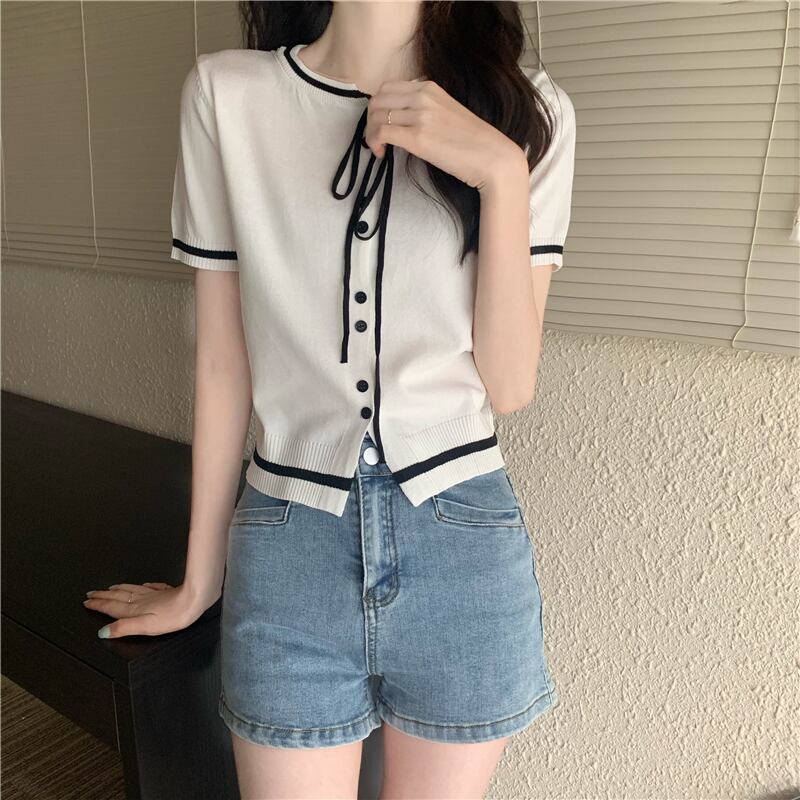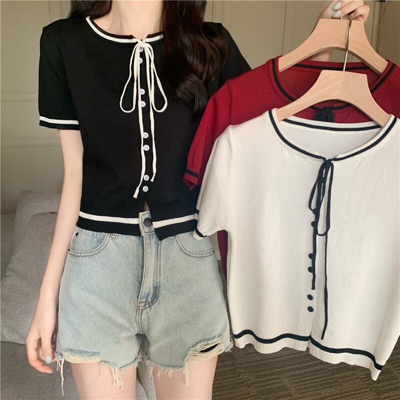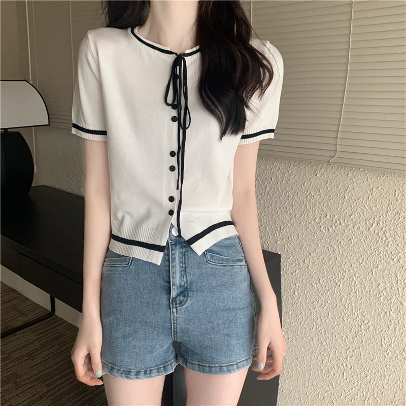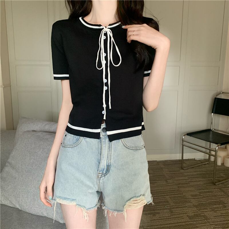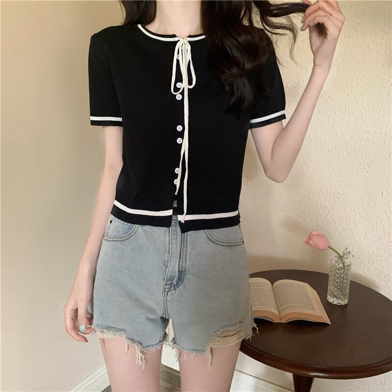 2022 新しい夏の女性の小さな香りスタイルラウンドネックネクタイトップ気質コントラストカラーショート半袖ニットセータートレンド ハーフスリーブ サマー 夏物 Oネック 746009639234259 | framboise21
