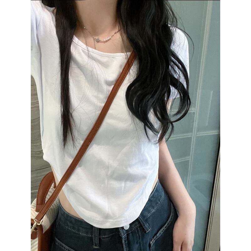 白 半袖 tシャツ レディース 夏 綿 変則 デザイン センス 小さめ 細身 スリム スクエアカラー フロントショルダー トップス ホワイト コットン サマー 夏物 スクウェア 7460017563201470 | framboise21