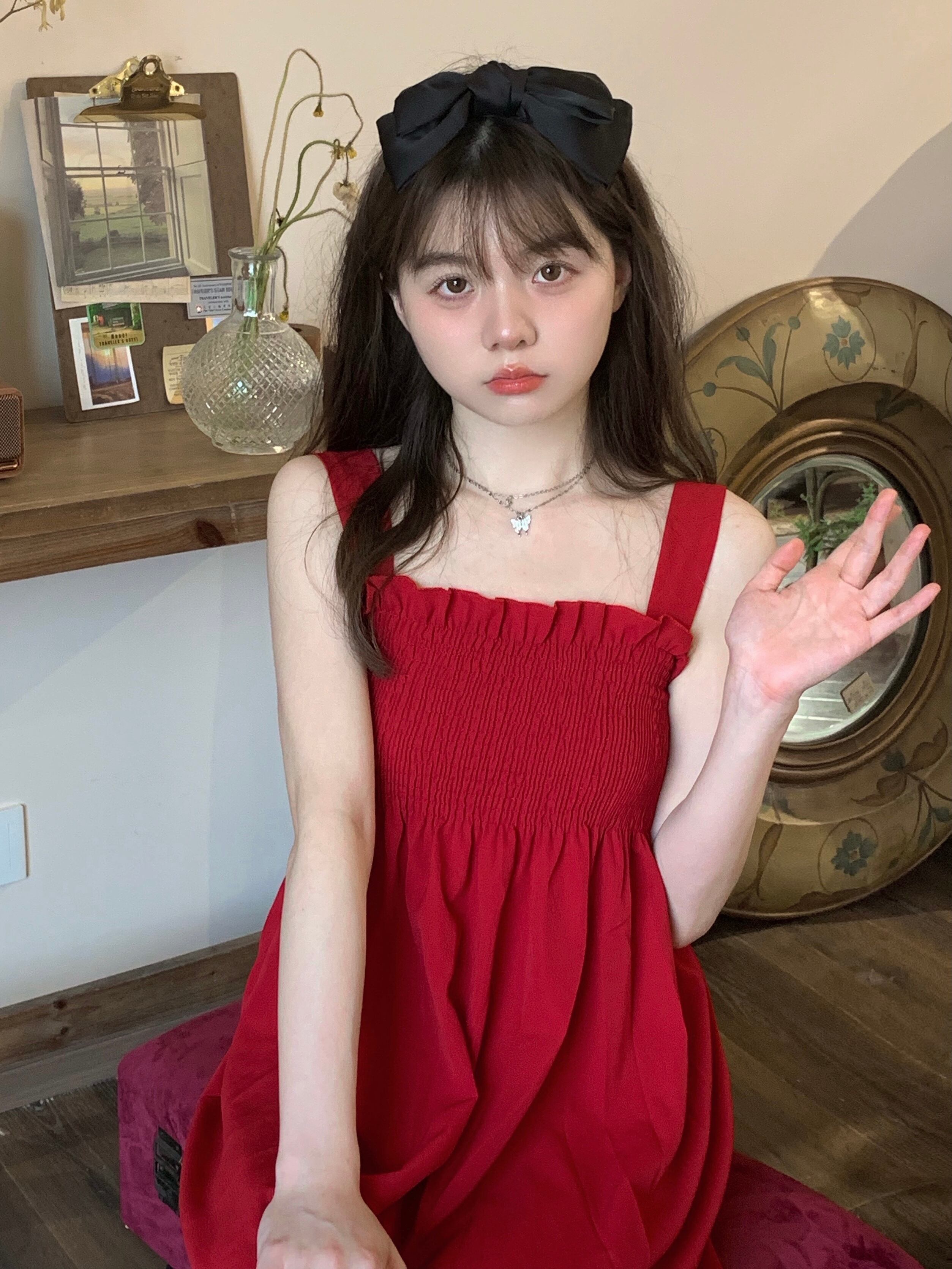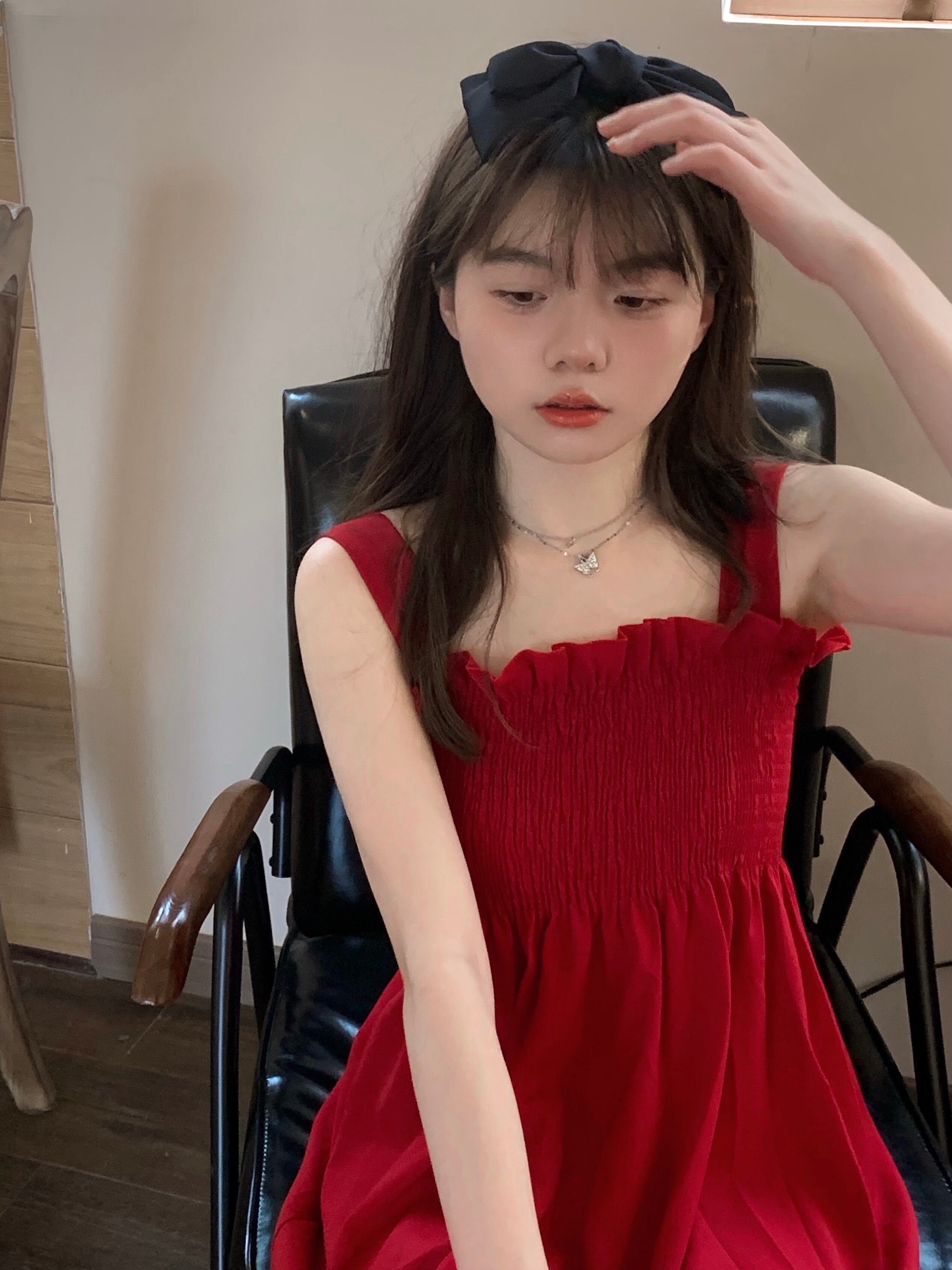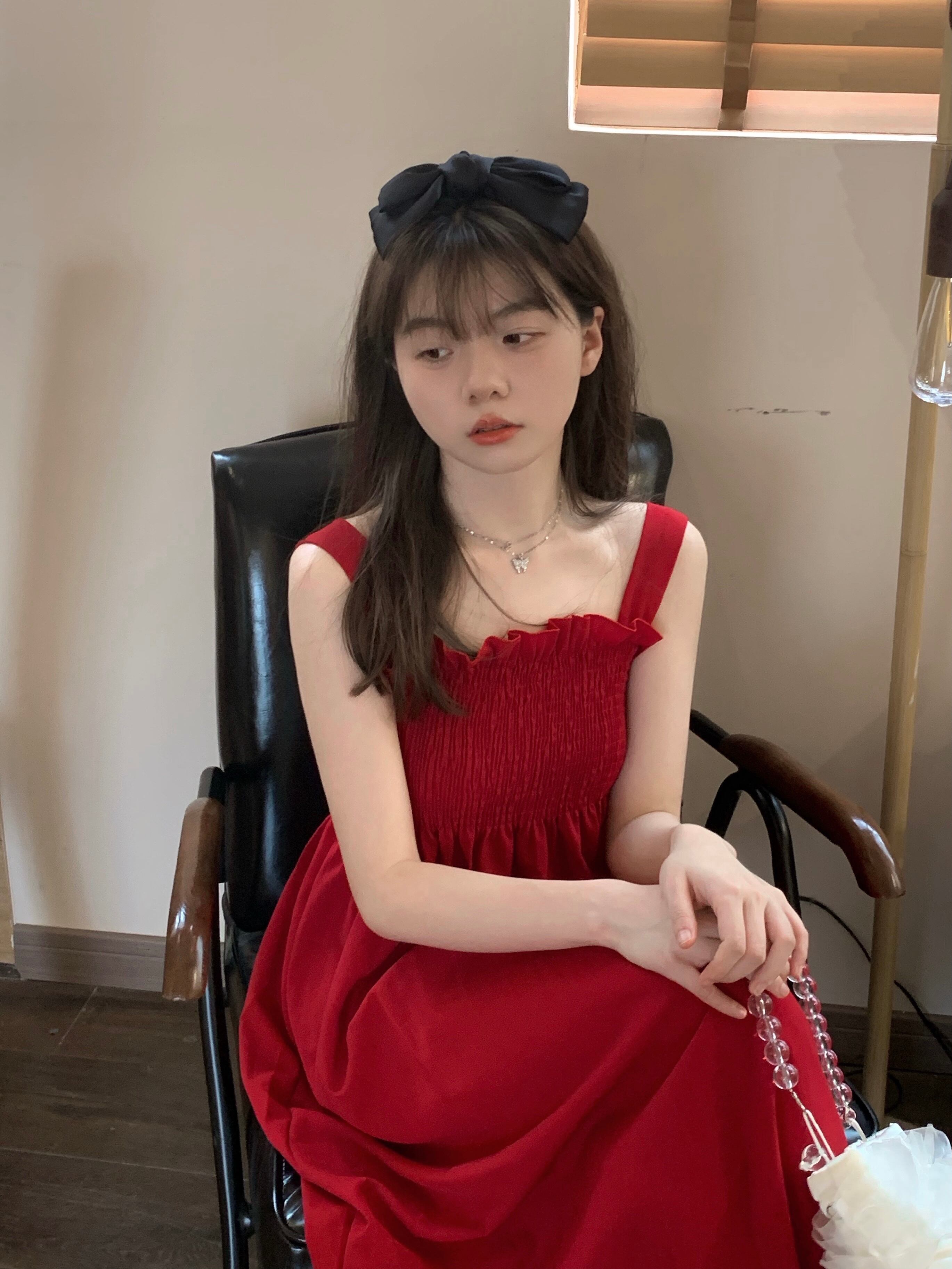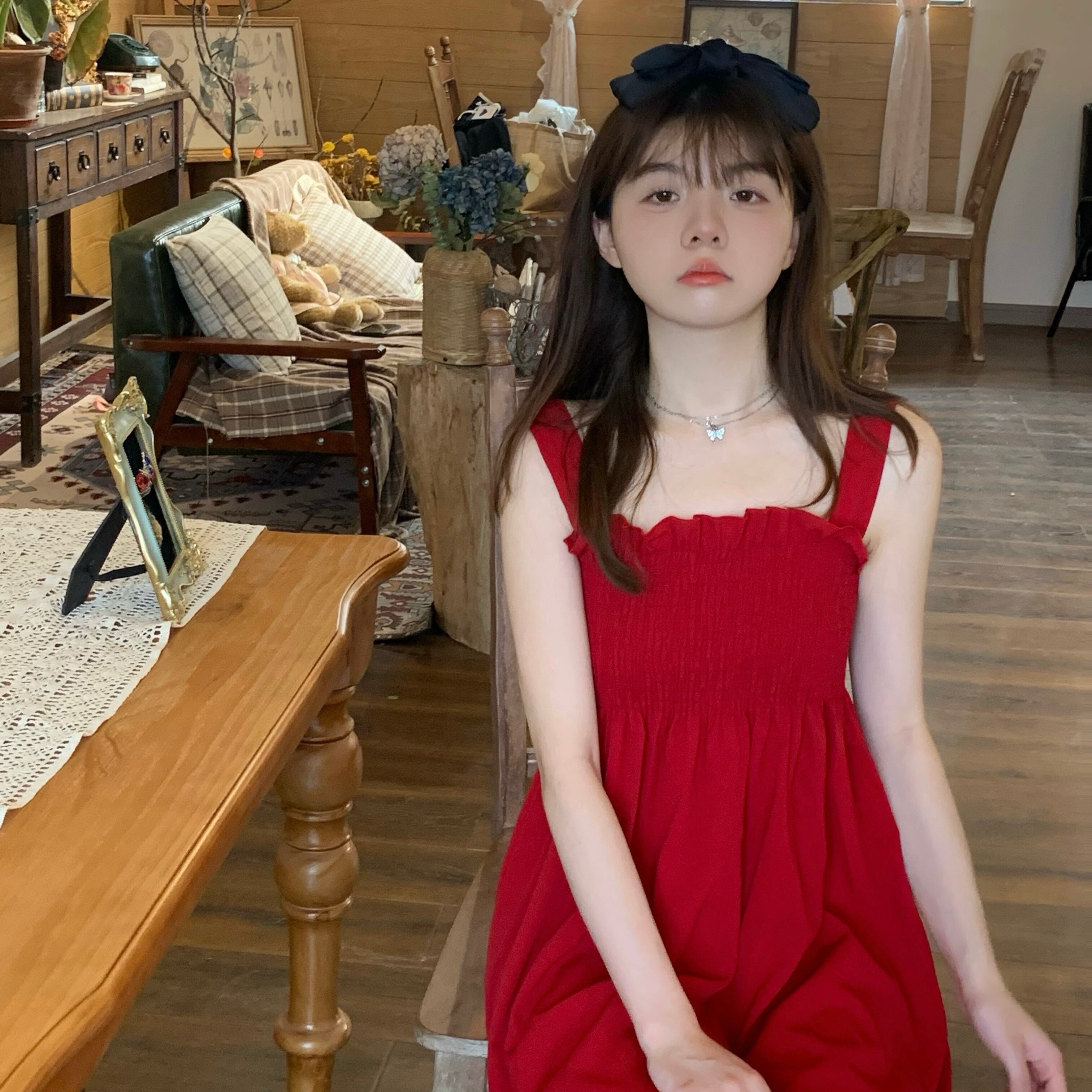 香港スタイルの赤いドレス夏 2022 新しいワンショルダー ストラップ フレンチ シックな見事な赤いスカート小さなロング スカート レッド サマー 夏物 7460046957528215 | framboise21