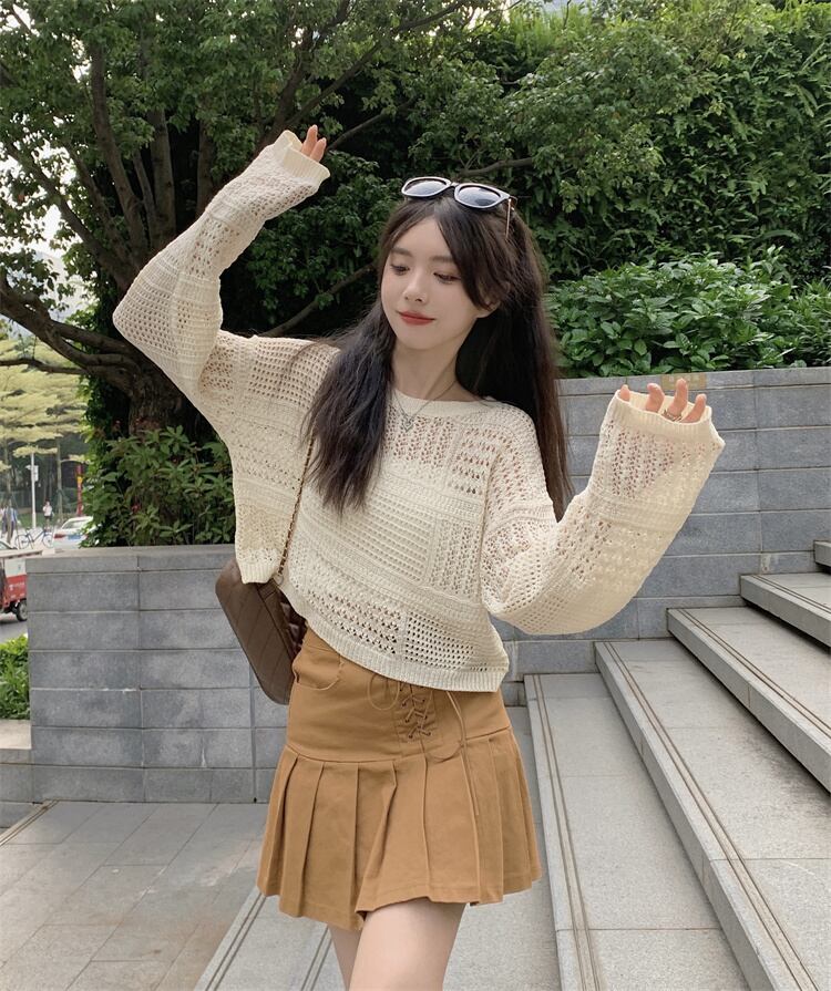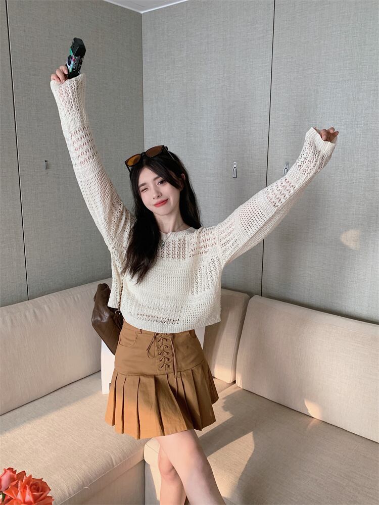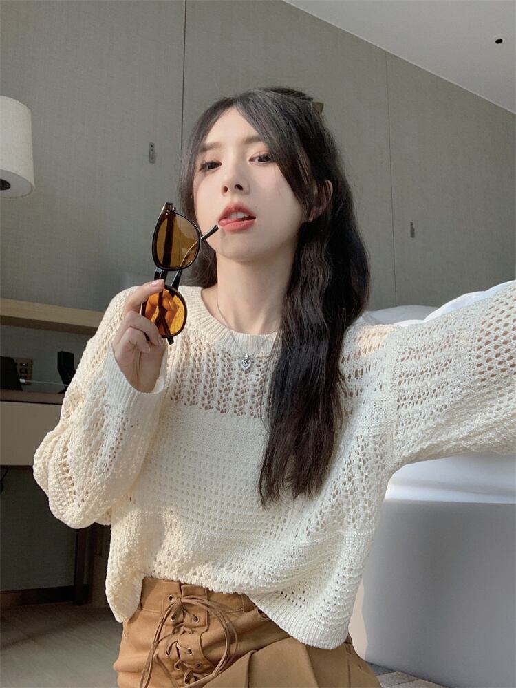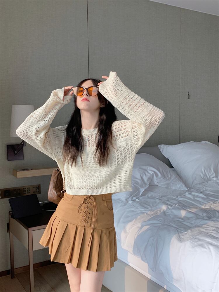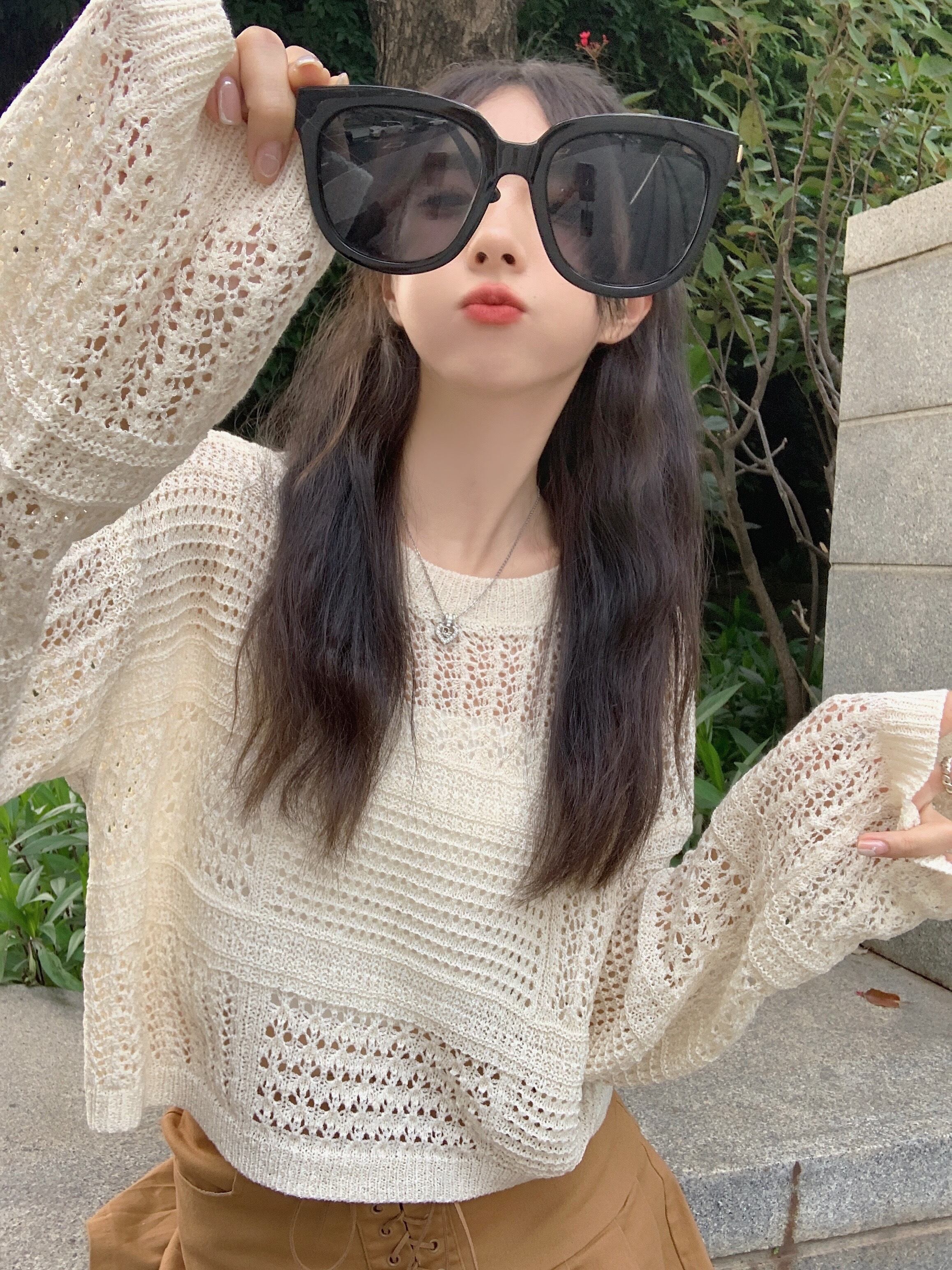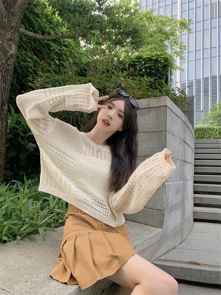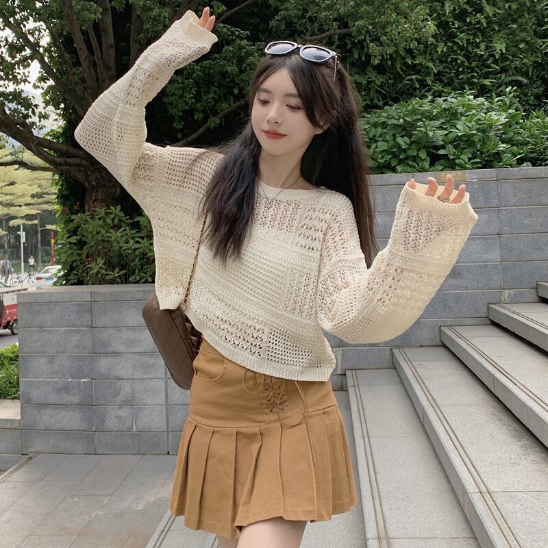 スウィートスパイスガールズレトロレイヤードブラウス中空アウト長袖ニットショートトップ女性の夏の小さな日焼け止めシャツ ロング レッド 大人ガーリー キュート カジュアル サマー 夏物 7460045188961693 | framboise21