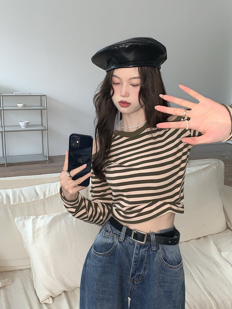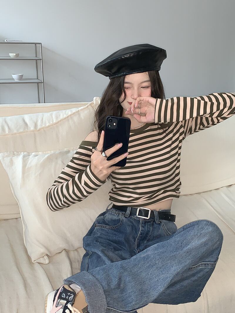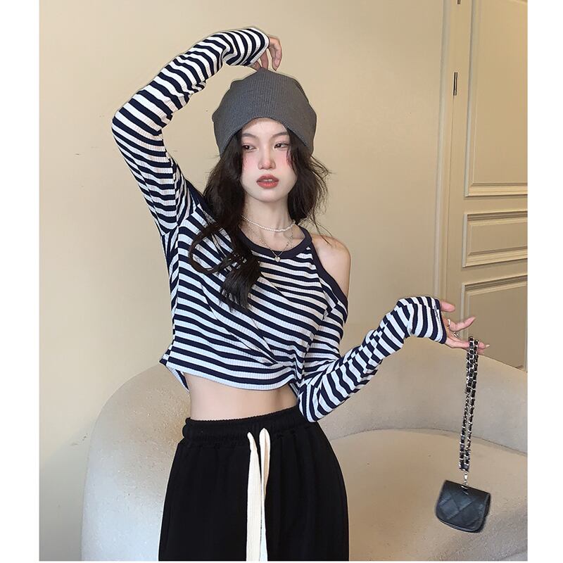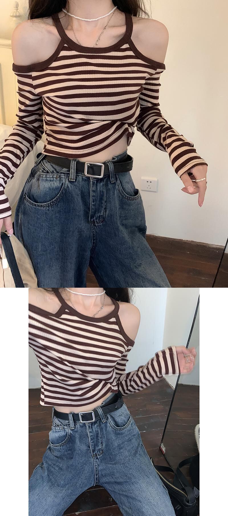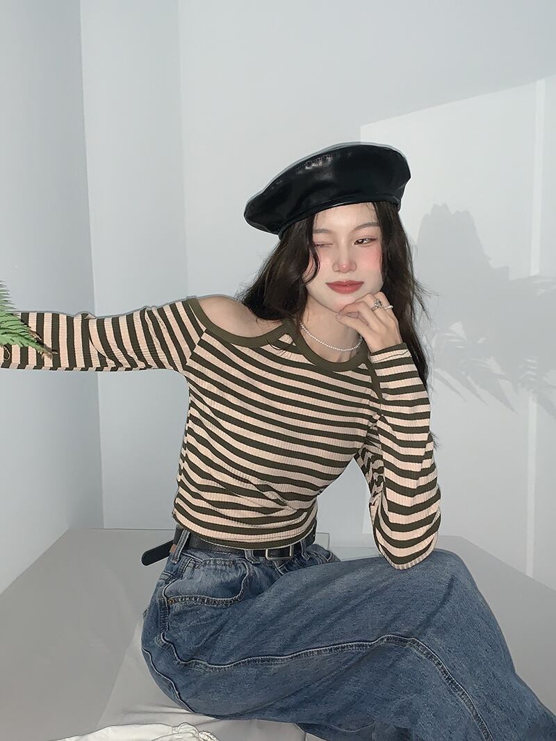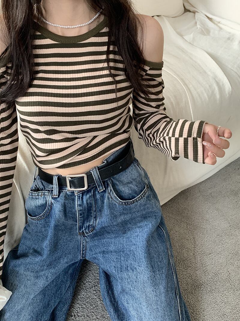 オフショルダー ストライプ 長袖 Tシャツ レディース 秋口 スリムフィット 薄手インナー ボトムス シャツ デザイン ショートトップ ロング オータム 秋物 7460028746770917 | framboise21