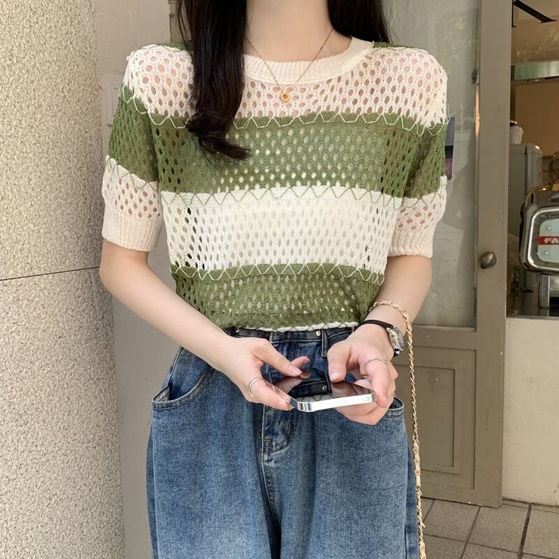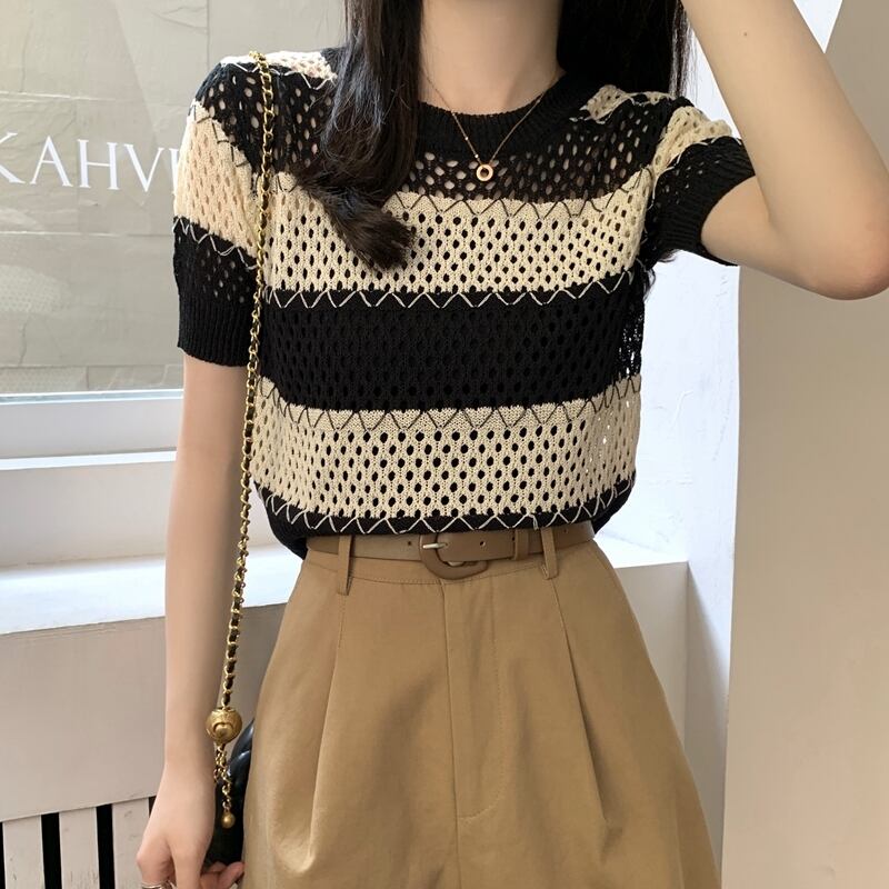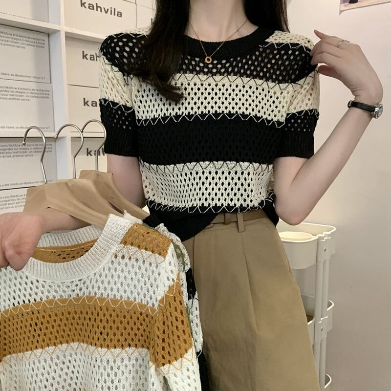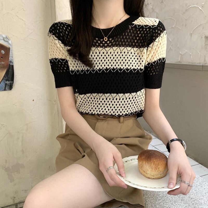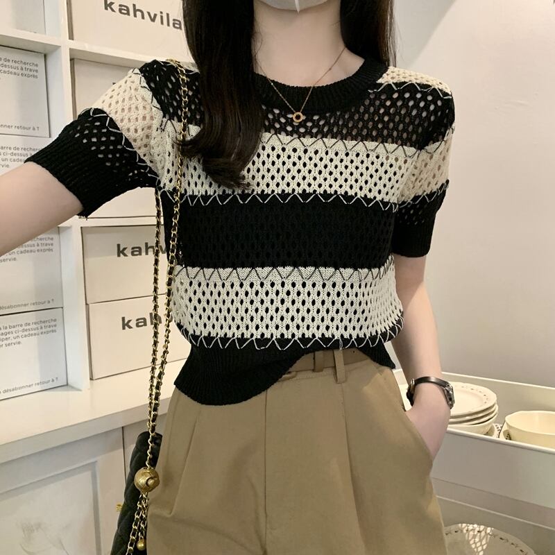 黒と白のストライプのフロント ショルダー半袖 t シャツ女性の夏の中空アイス シルク ニット セーター ユニークな小さなトップ ショート タイド ホワイト ブラック サマー 夏物 Tシャツ 7460088864467397 | framboise21