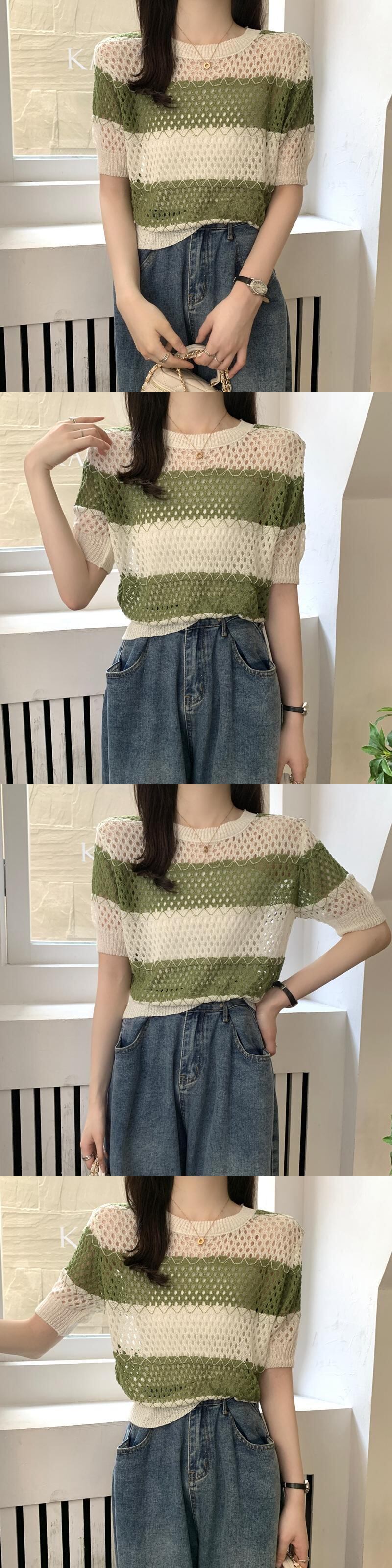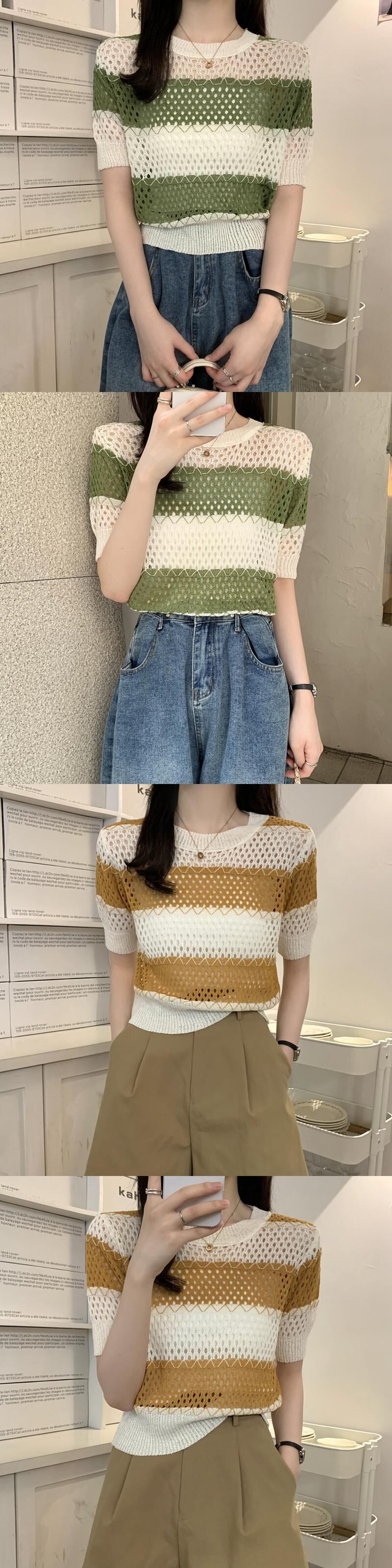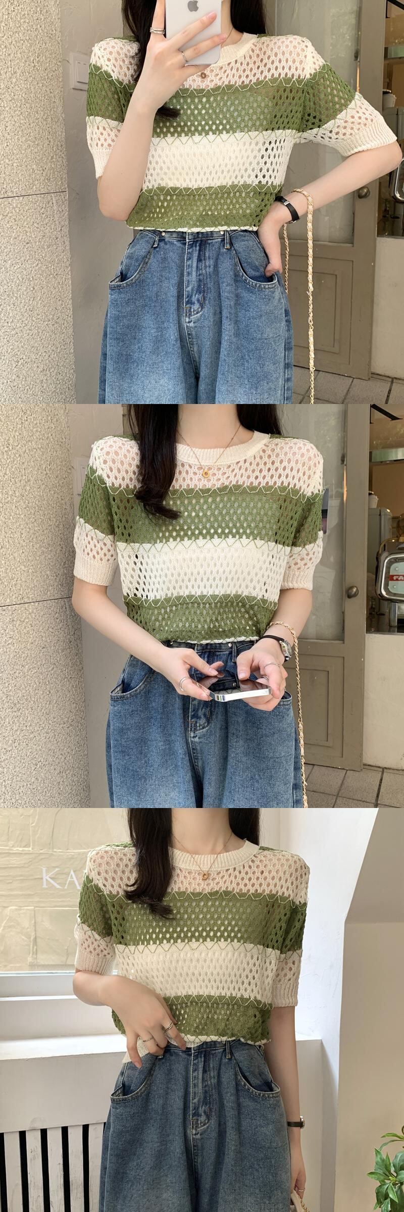 黒と白のストライプのフロント ショルダー半袖 t シャツ女性の夏の中空アイス シルク ニット セーター ユニークな小さなトップ ショート タイド ホワイト ブラック サマー 夏物 Tシャツ 7460088864467397 | framboise21