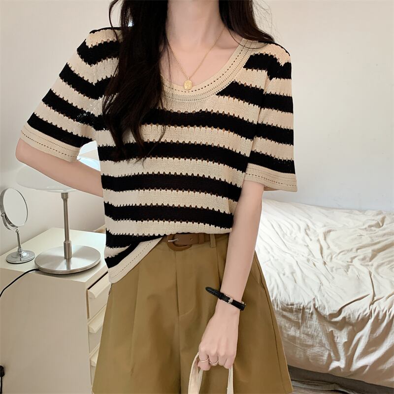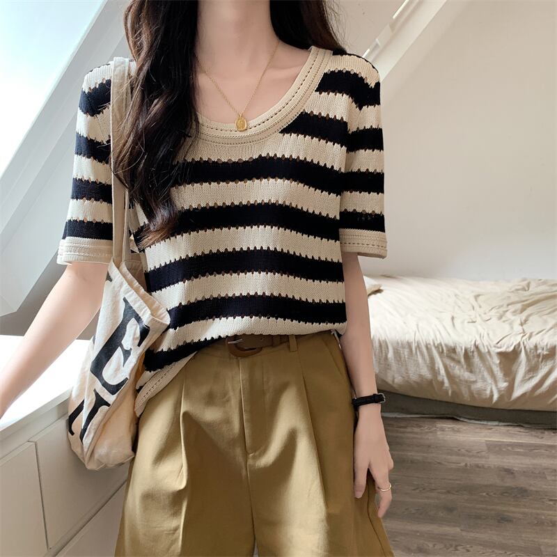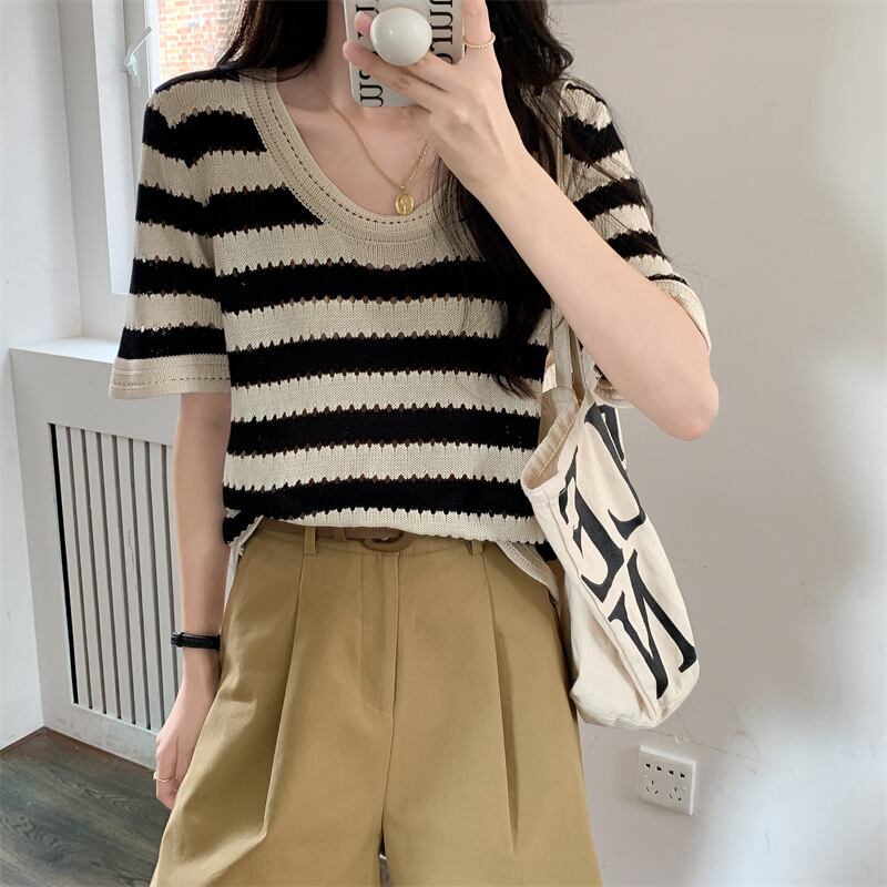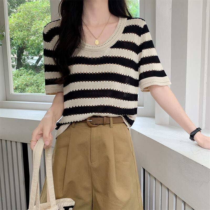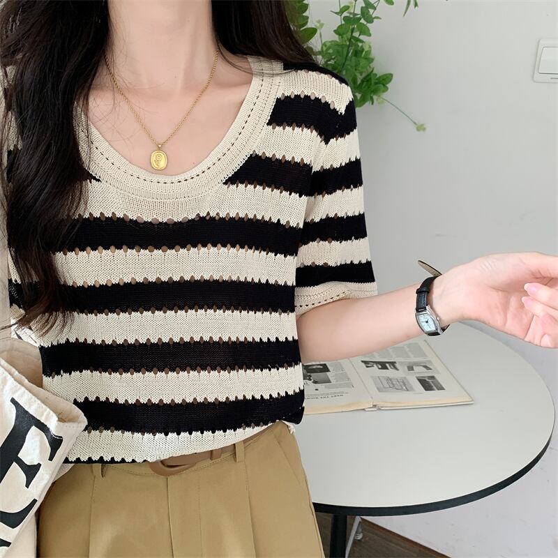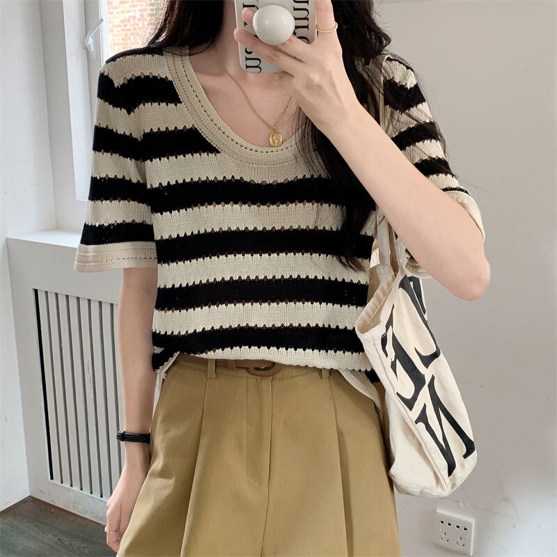 ルーズ半袖ストライプ t シャツ女性イン潮夏フロント ショルダー アメリカン レトロ ローネック アイス シルク ニット セーター中空トップ サマー 夏物 Tシャツ 746006178008134 | framboise21