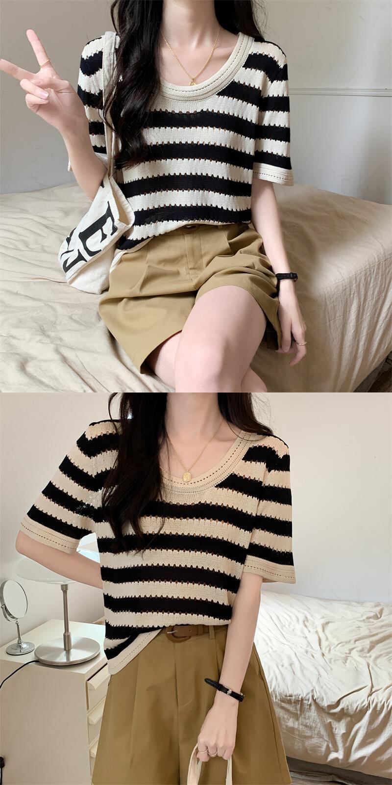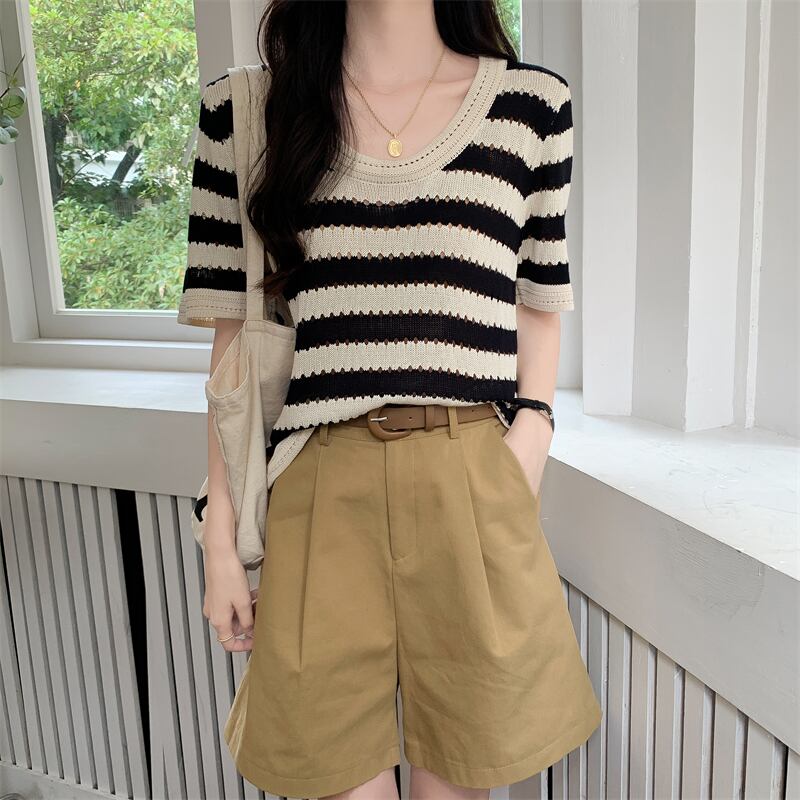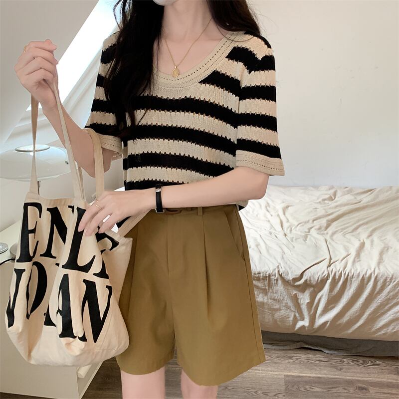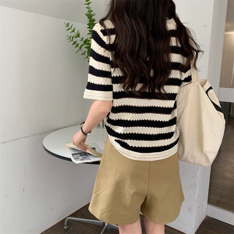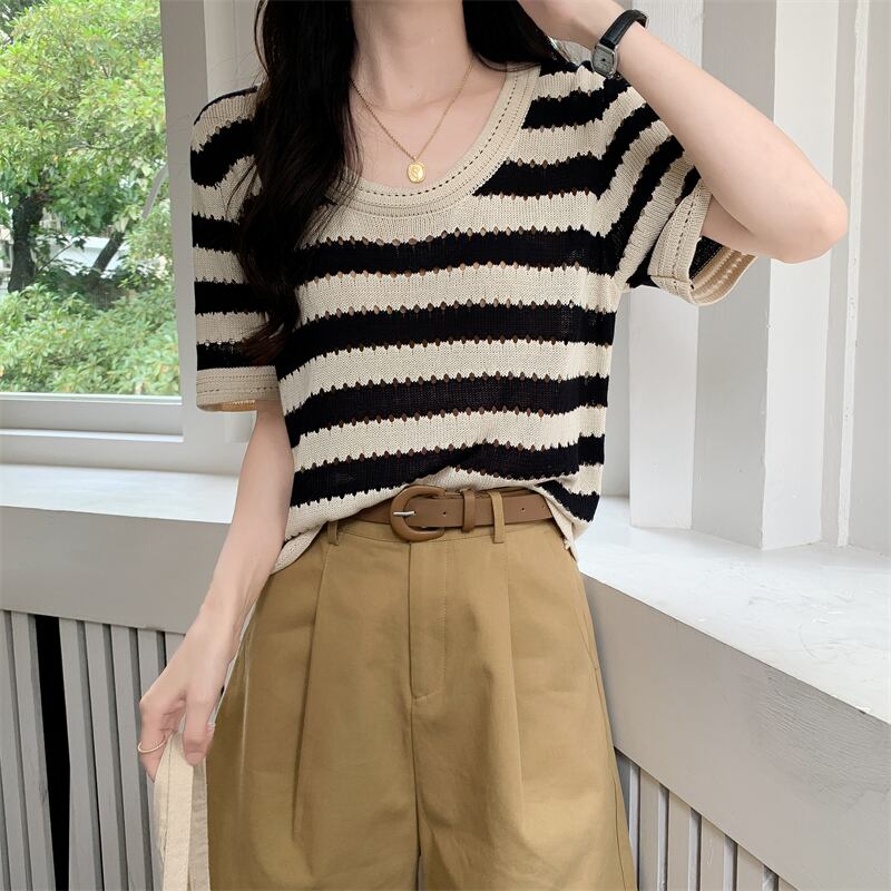 ルーズ半袖ストライプ t シャツ女性イン潮夏フロント ショルダー アメリカン レトロ ローネック アイス シルク ニット セーター中空トップ サマー 夏物 Tシャツ 746006178008134 | framboise21