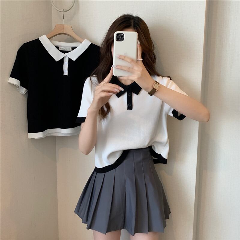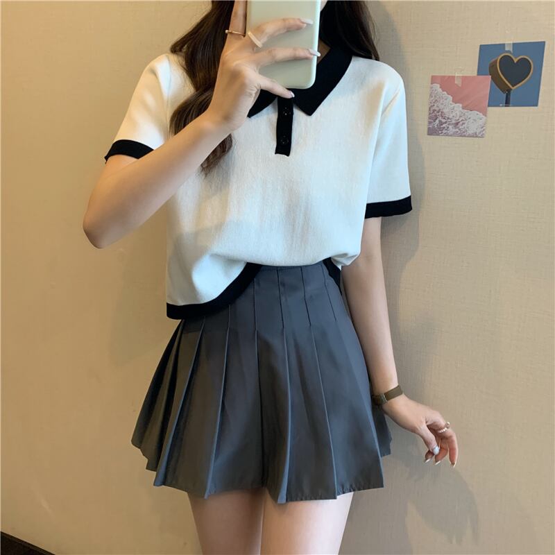 ポロ襟 Tシャツ 半袖 レディース 夏 小さめ フレグランス アイスシルク ニット 2022年新作 フロントショルダー シック ショートトップ サマー 夏物 7460054508457948 | framboise21