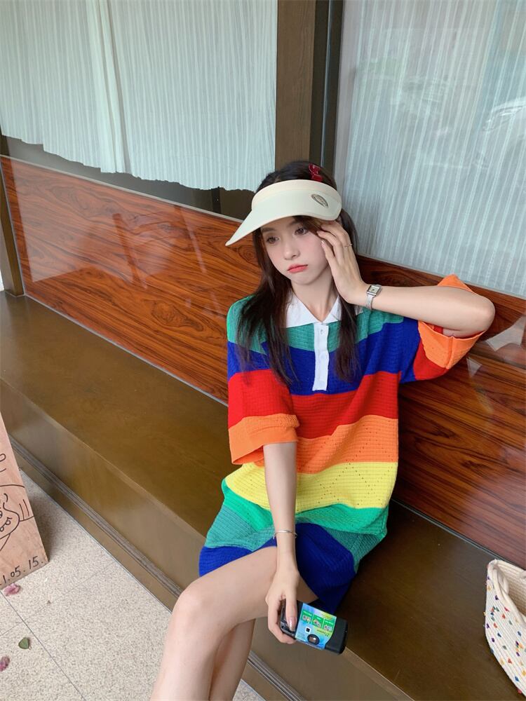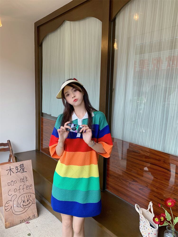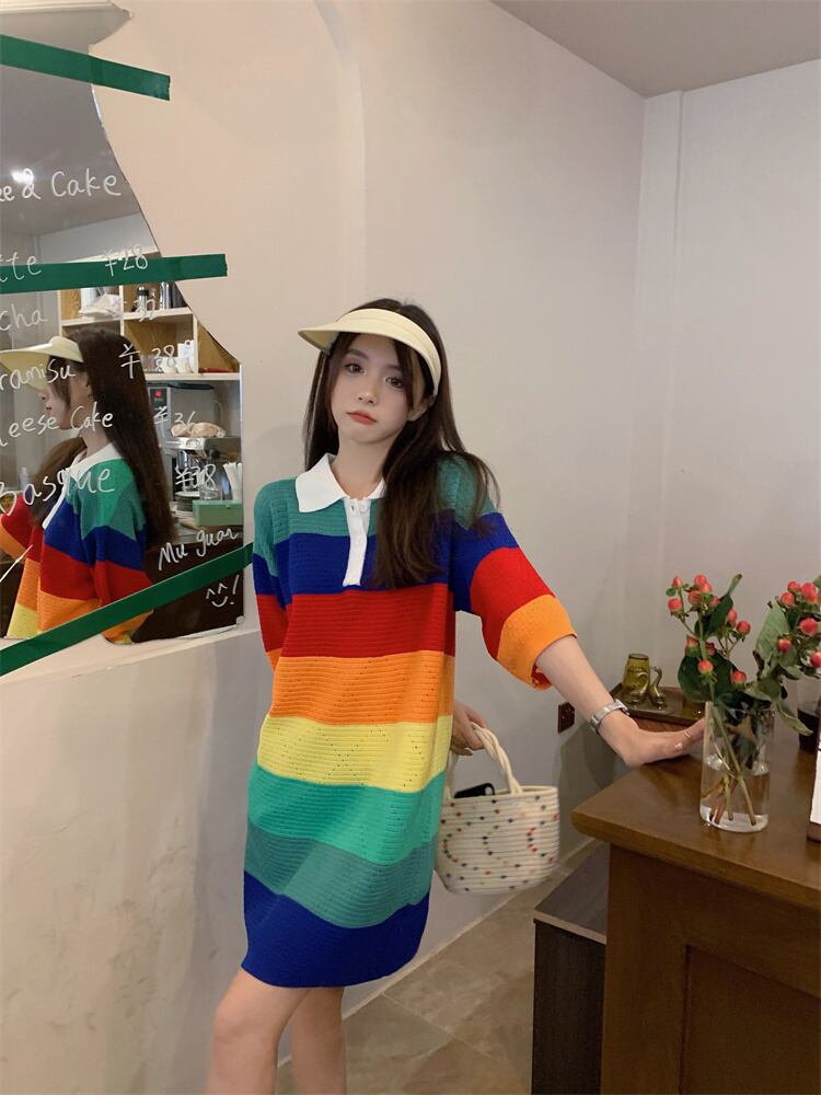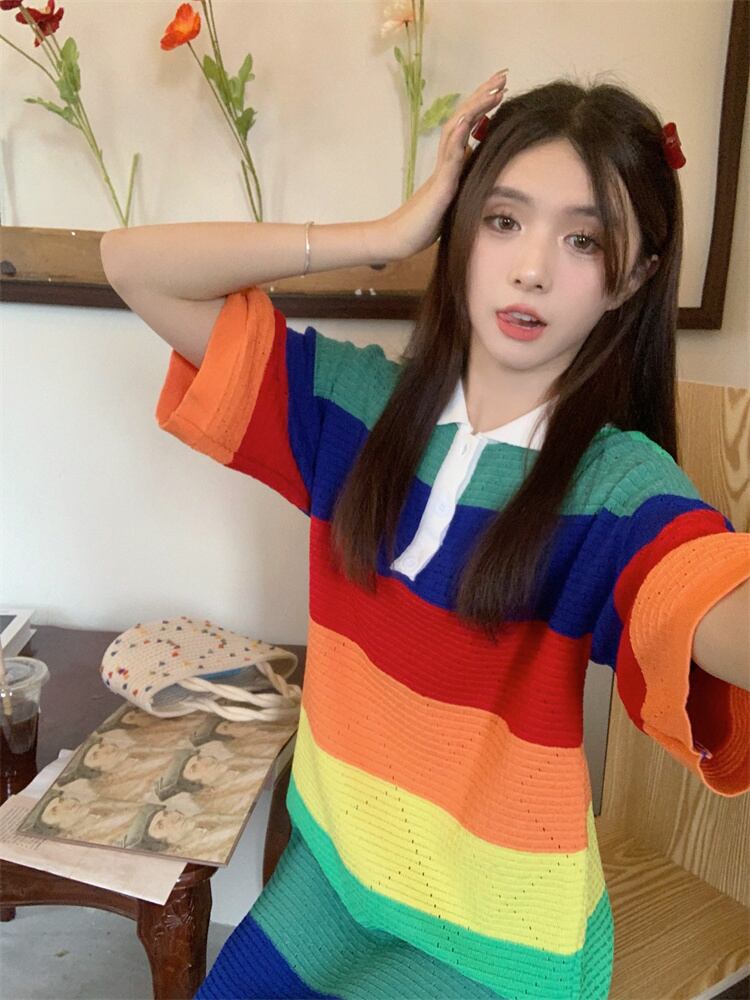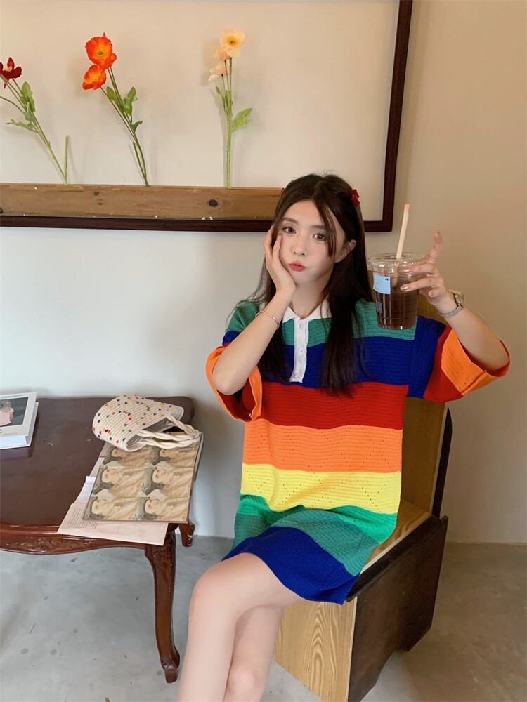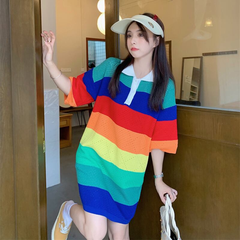 レインボーストライプ 半袖 Tシャツ レディース デザインセンス ニッチ ボトムス 抜けトップス ミドル丈 ポロシャツ ワンピ 夏 サマー 夏物 7460082927334291 | framboise21