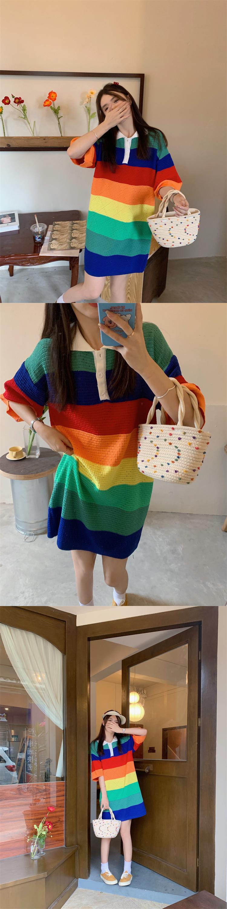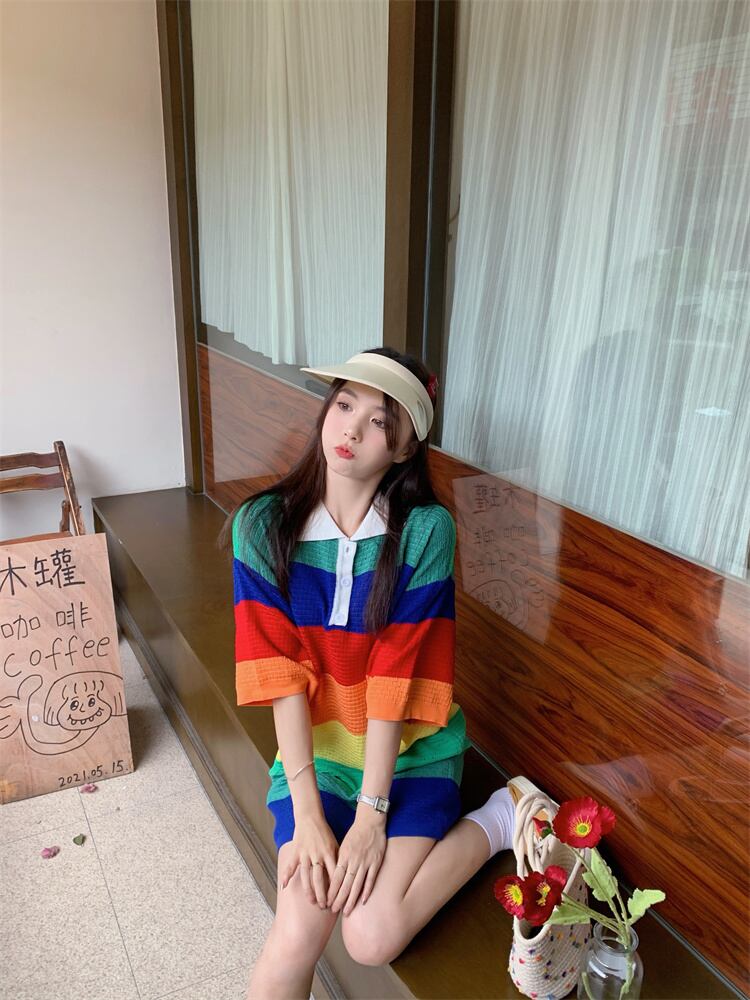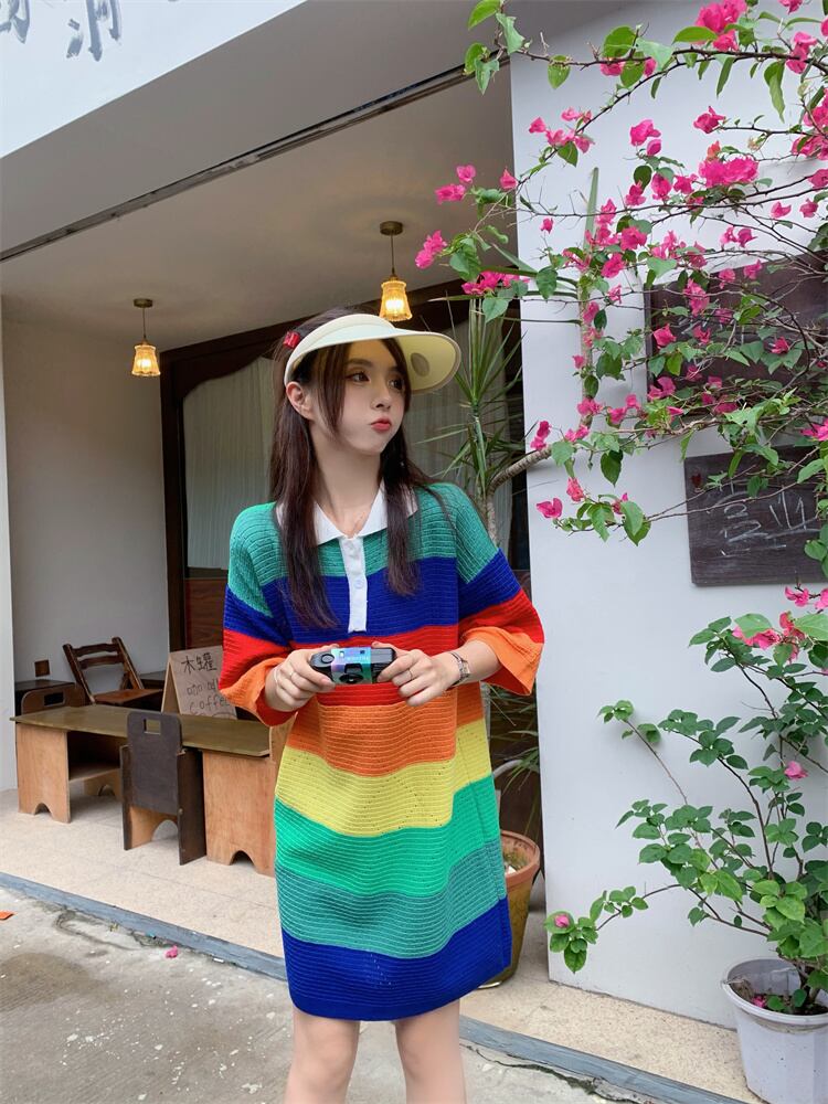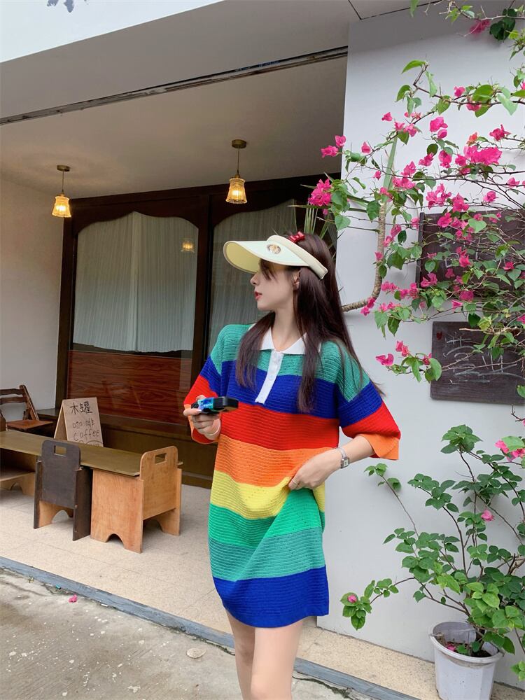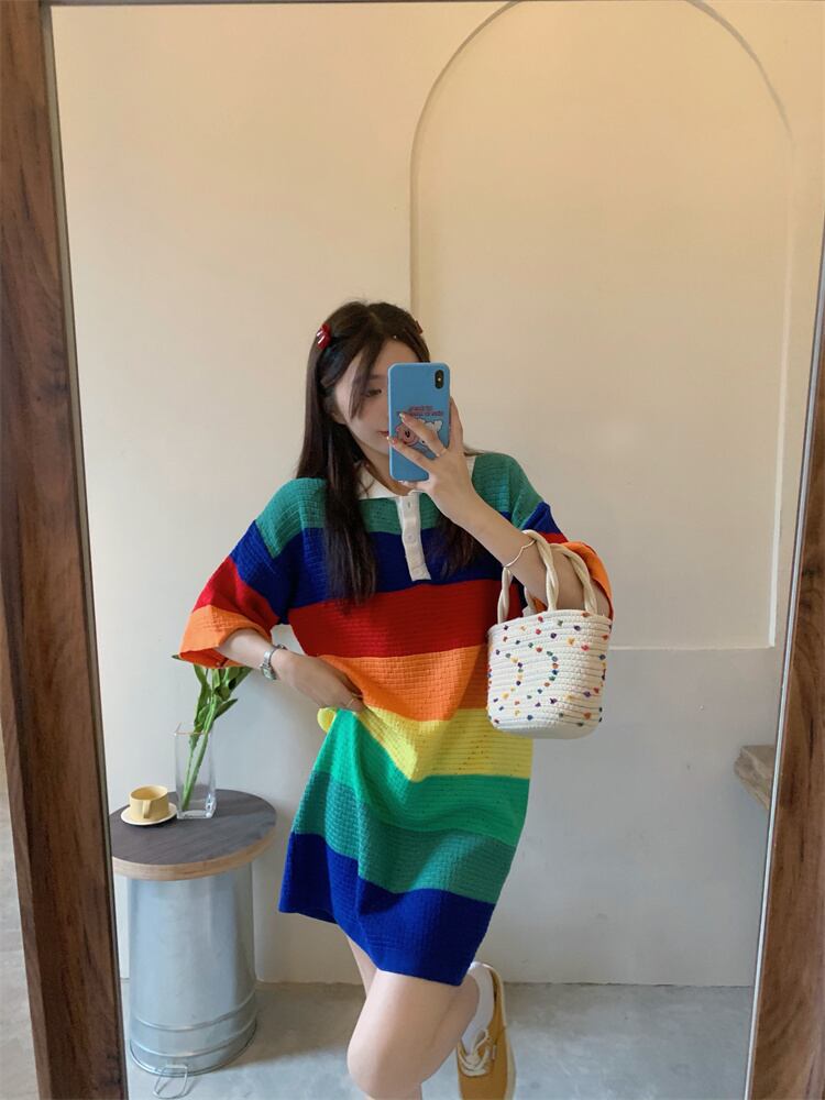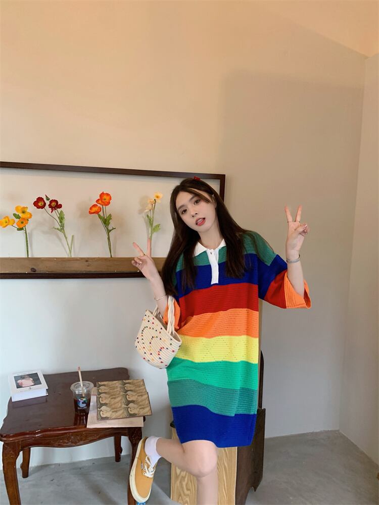 レインボーストライプ 半袖 Tシャツ レディース デザインセンス ニッチ ボトムス 抜けトップス ミドル丈 ポロシャツ ワンピ 夏 サマー 夏物 7460082927334291 | framboise21