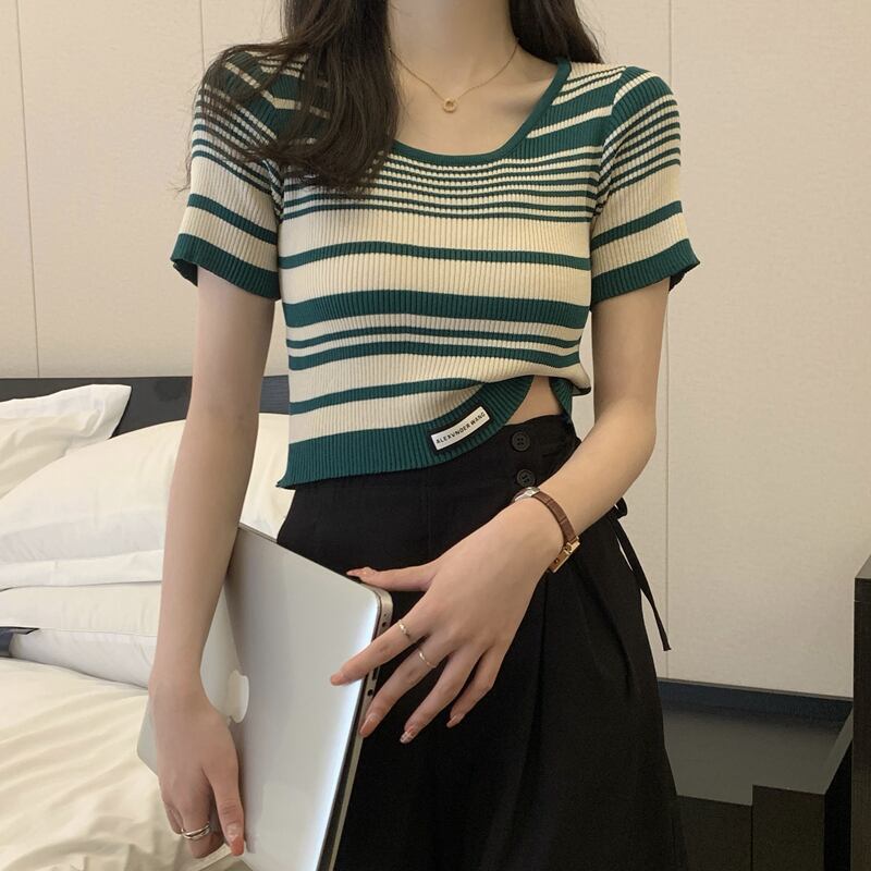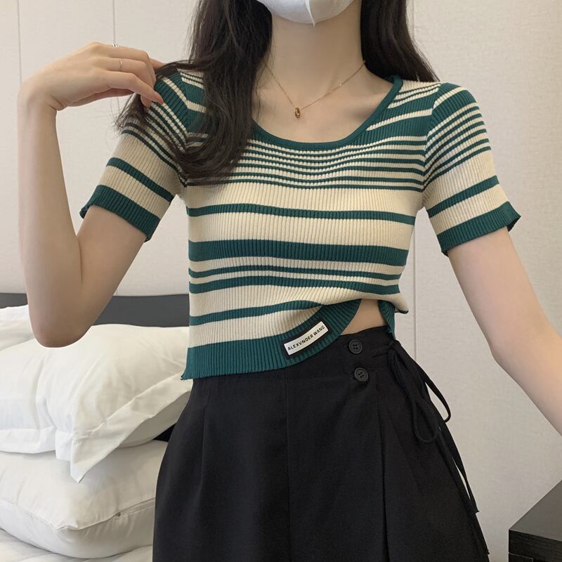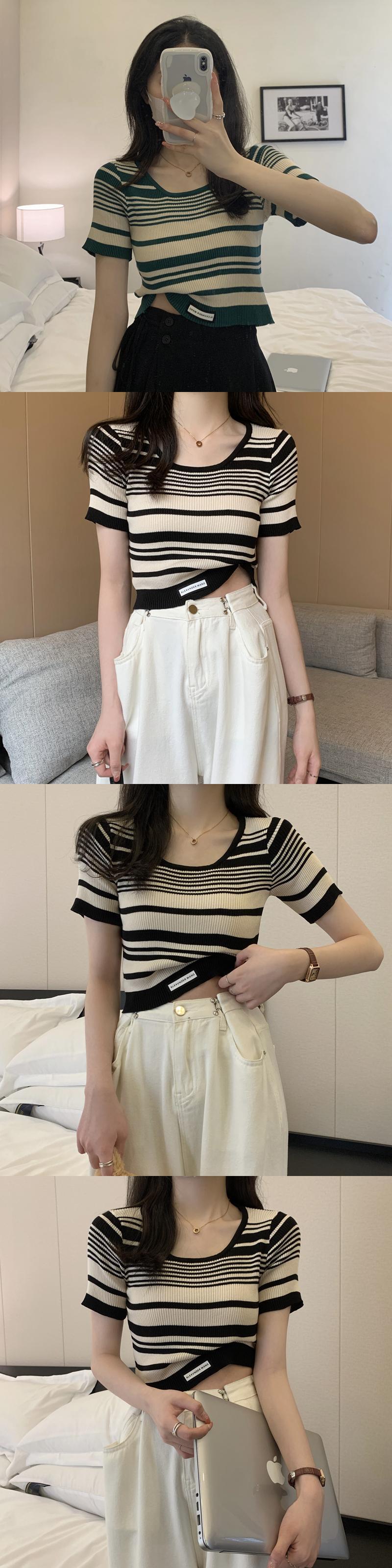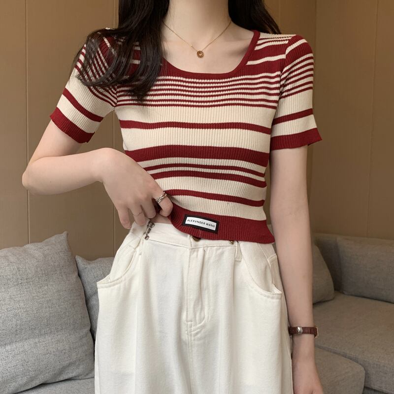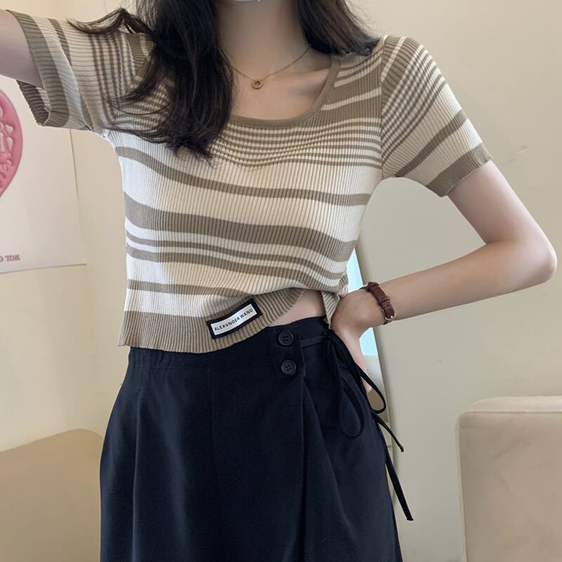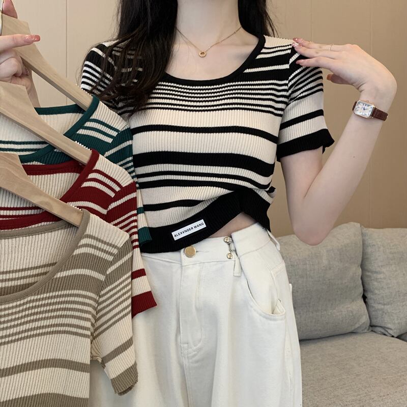 ワイドパンツ トップス 夏 小さめ トールウエスト タイト ストライプ ニット Tシャツ レディース ショート エイン スタイル カードウエスト 小さめシャツ サマー 夏物 7460077603218542 | framboise21