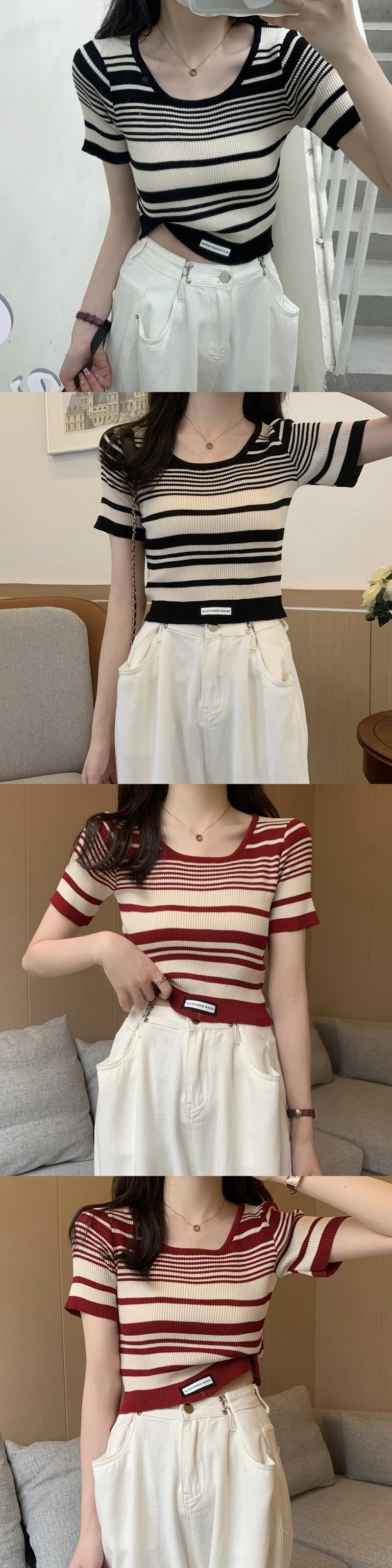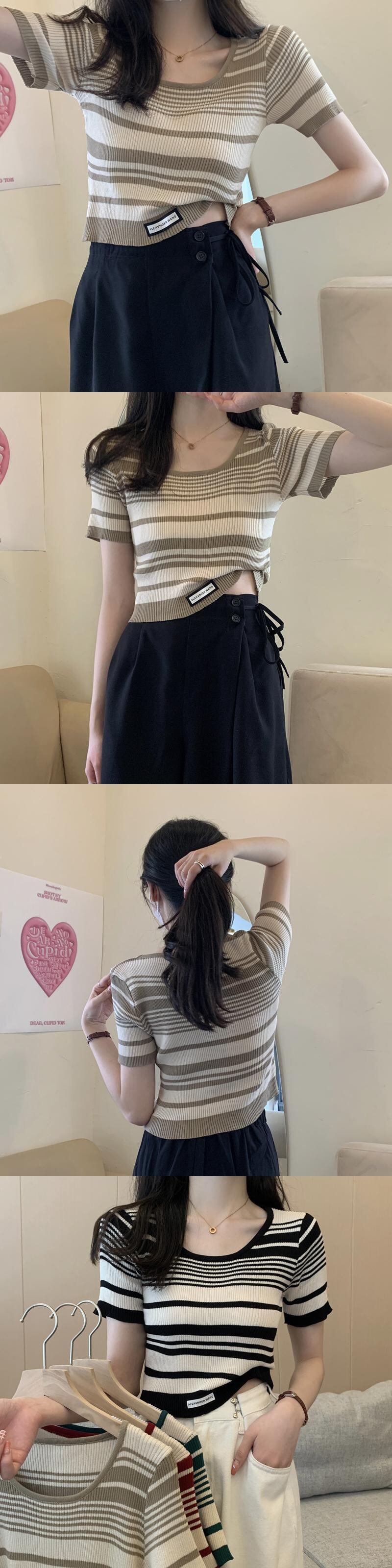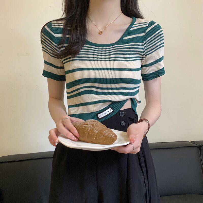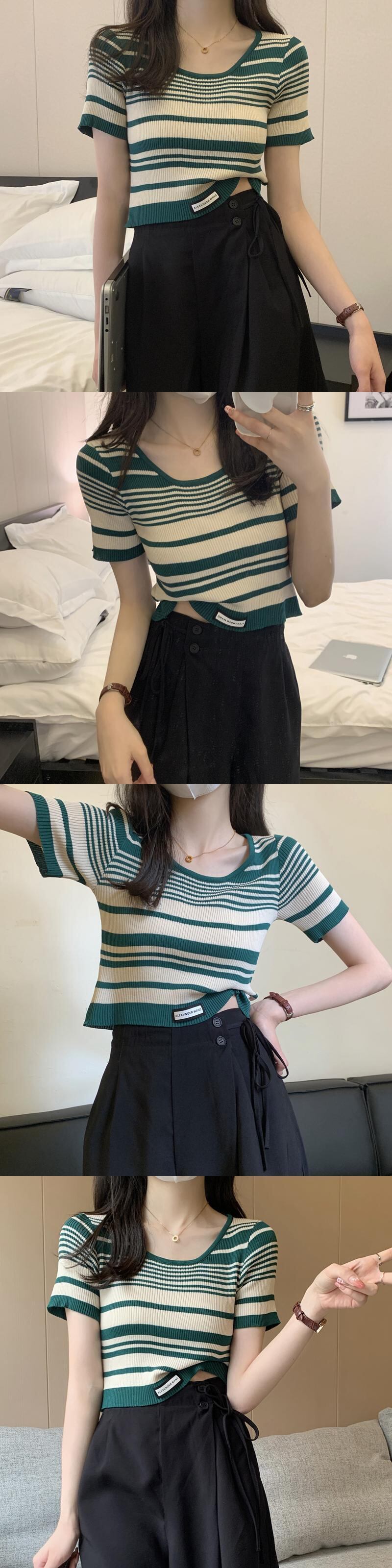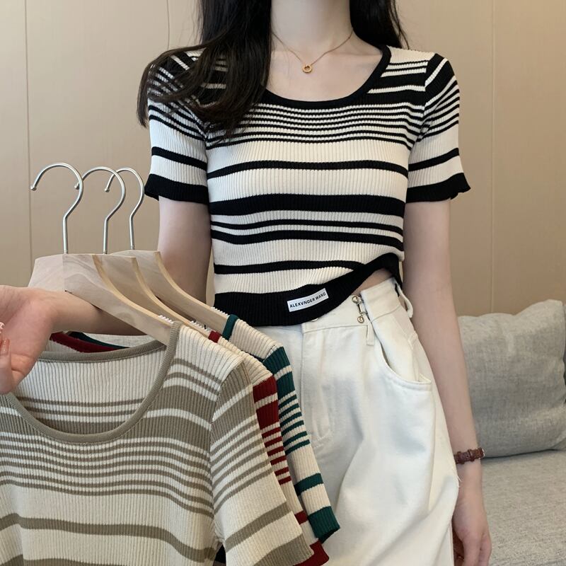 ワイドパンツ トップス 夏 小さめ トールウエスト タイト ストライプ ニット Tシャツ レディース ショート エイン スタイル カードウエスト 小さめシャツ サマー 夏物 7460077603218542 | framboise21