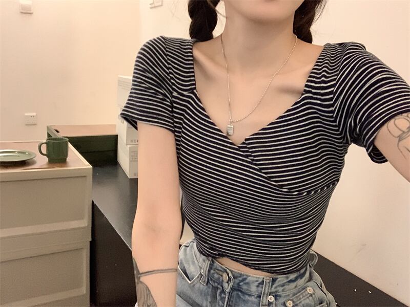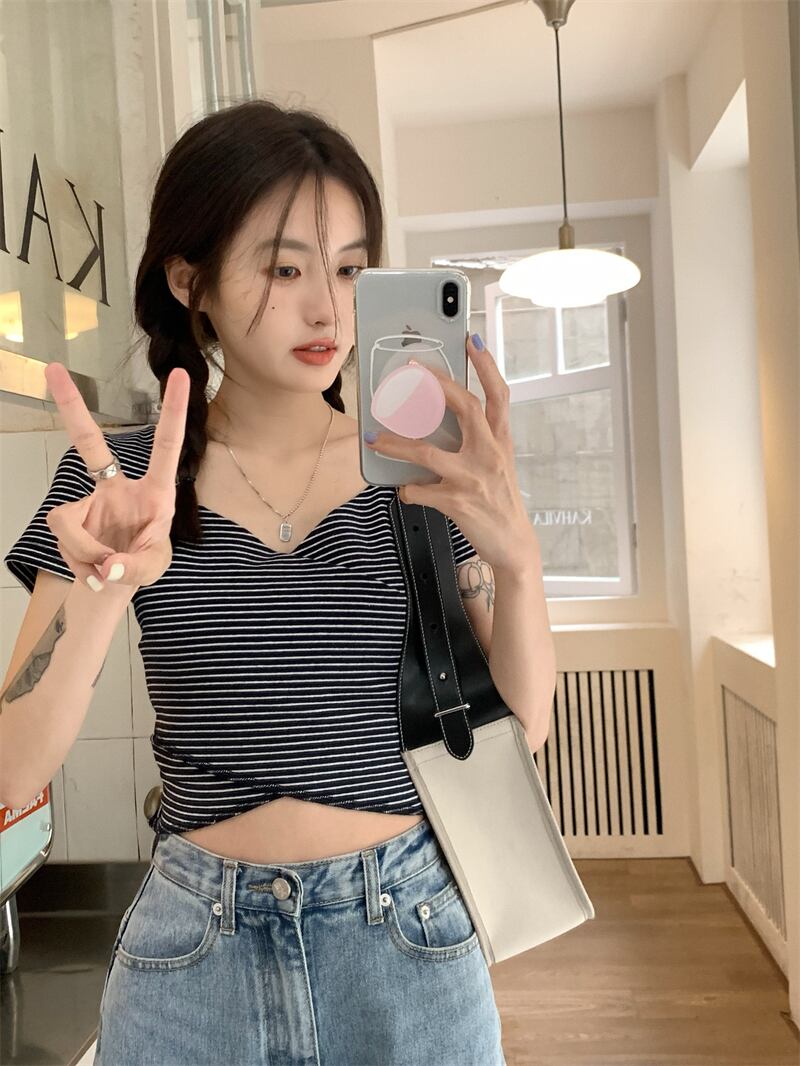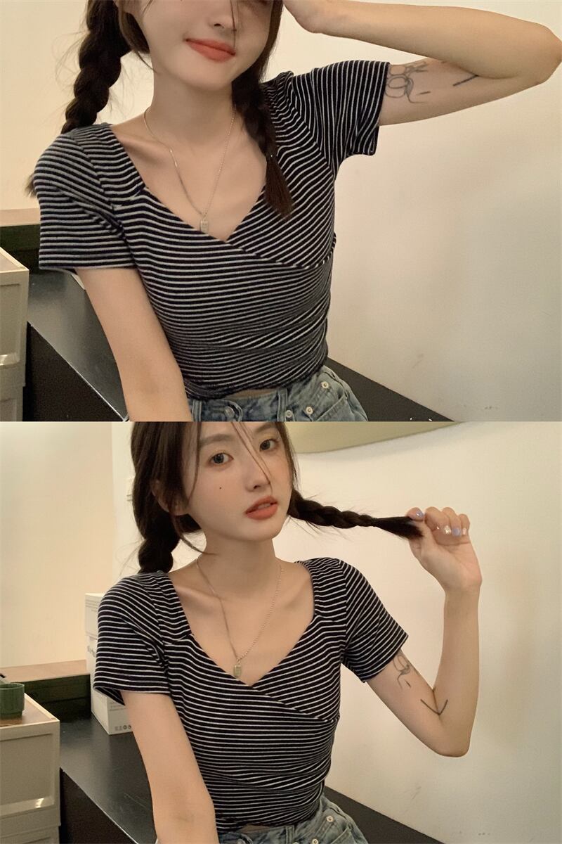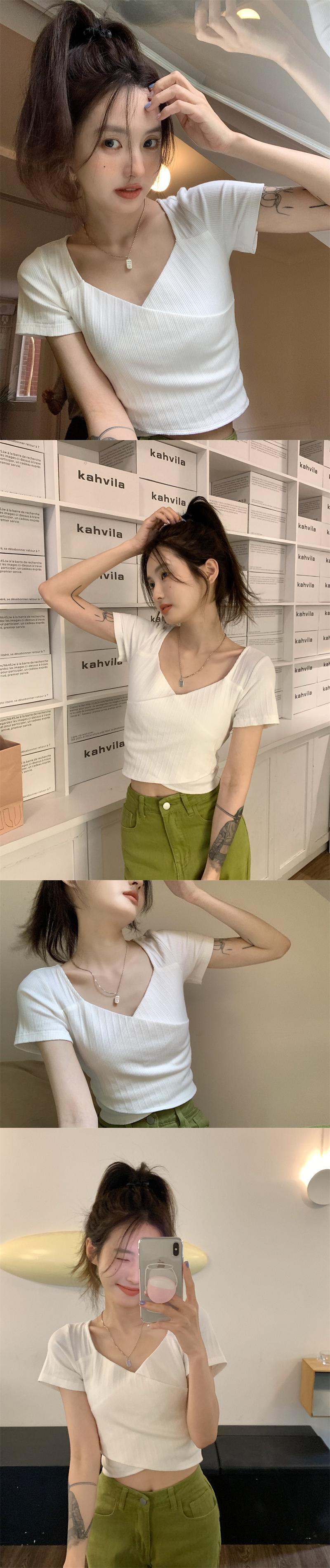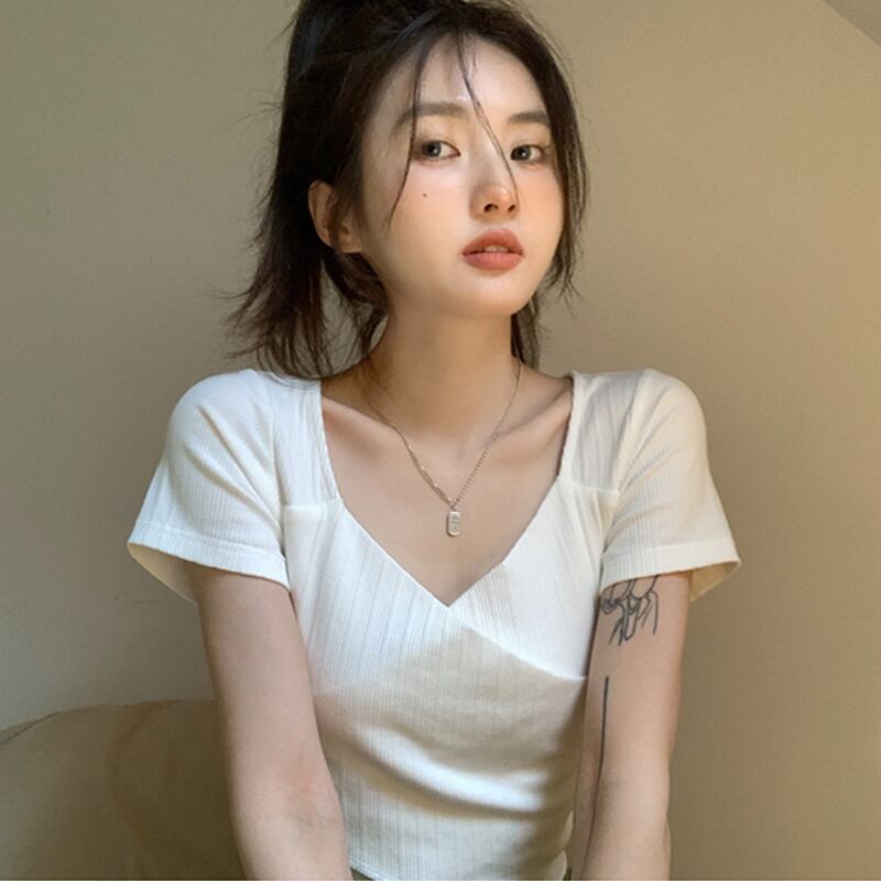 ホワイト Vネック フロントショルダー 半袖 Tシャツ レディース 夏 ハイウエスト ショート 甘辛 個性的 甘美 スモールトップ 夏 ハイウェスト 大人ガーリー スウィート キュート カジュアル サマー 夏物 7460017685544050 | framboise21