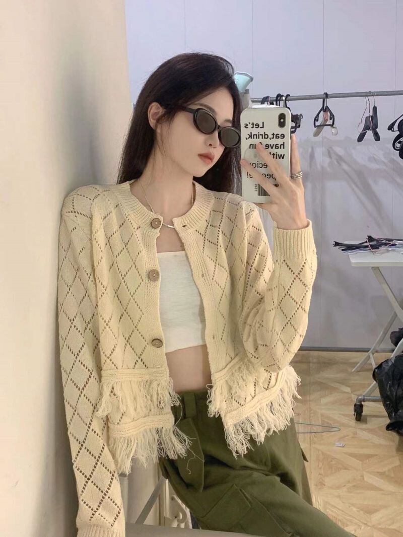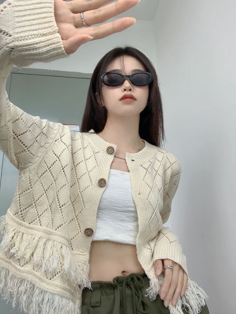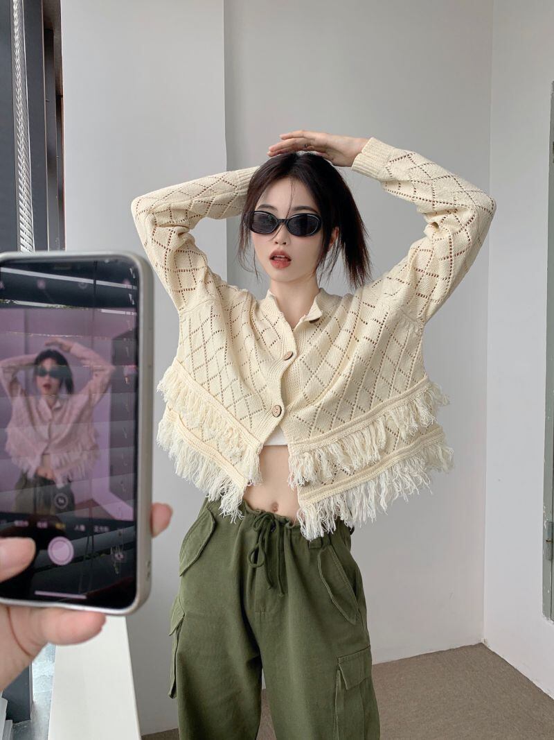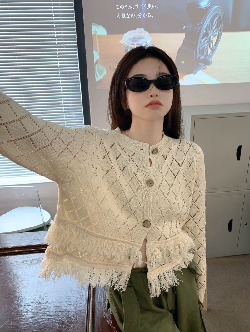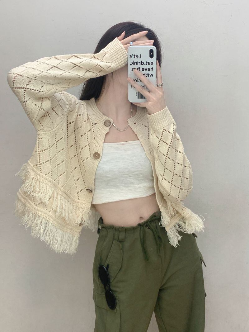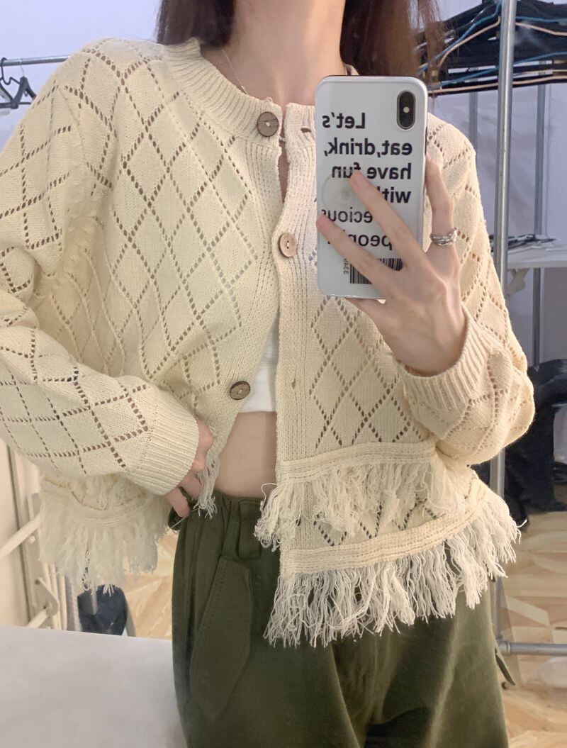 ニットセーターカーディガンレディース秋冬2022新作ルーズアウターウェア中空レイヤードフリンジコートショートトップ レッド オータム 秋物 ウィンター 冬物 746002010833413 | framboise21