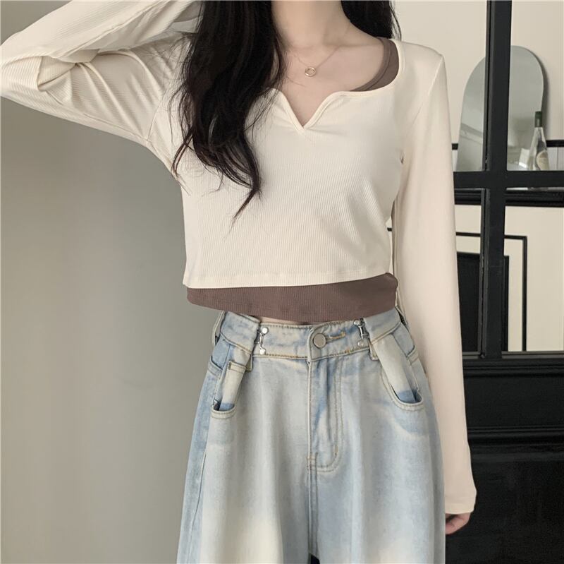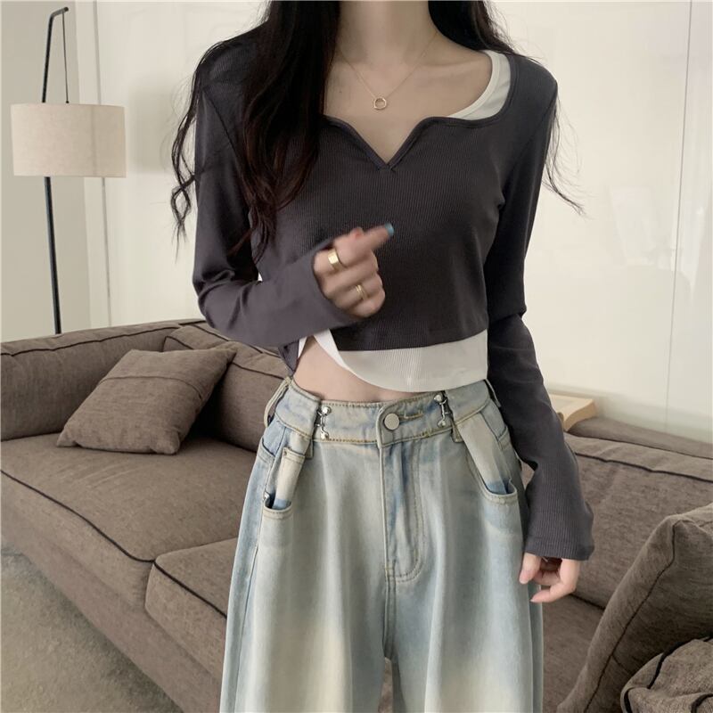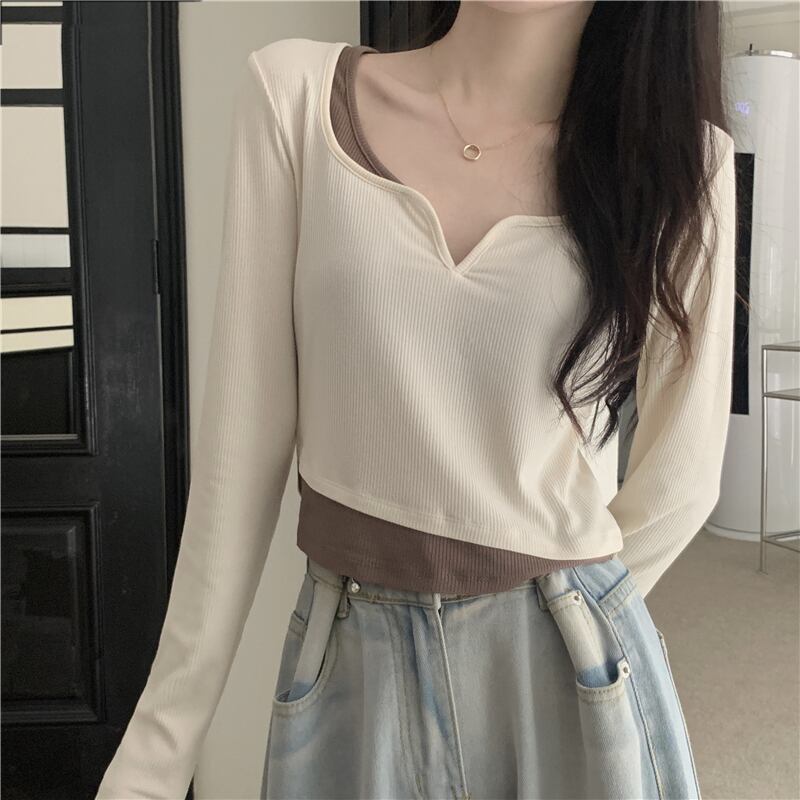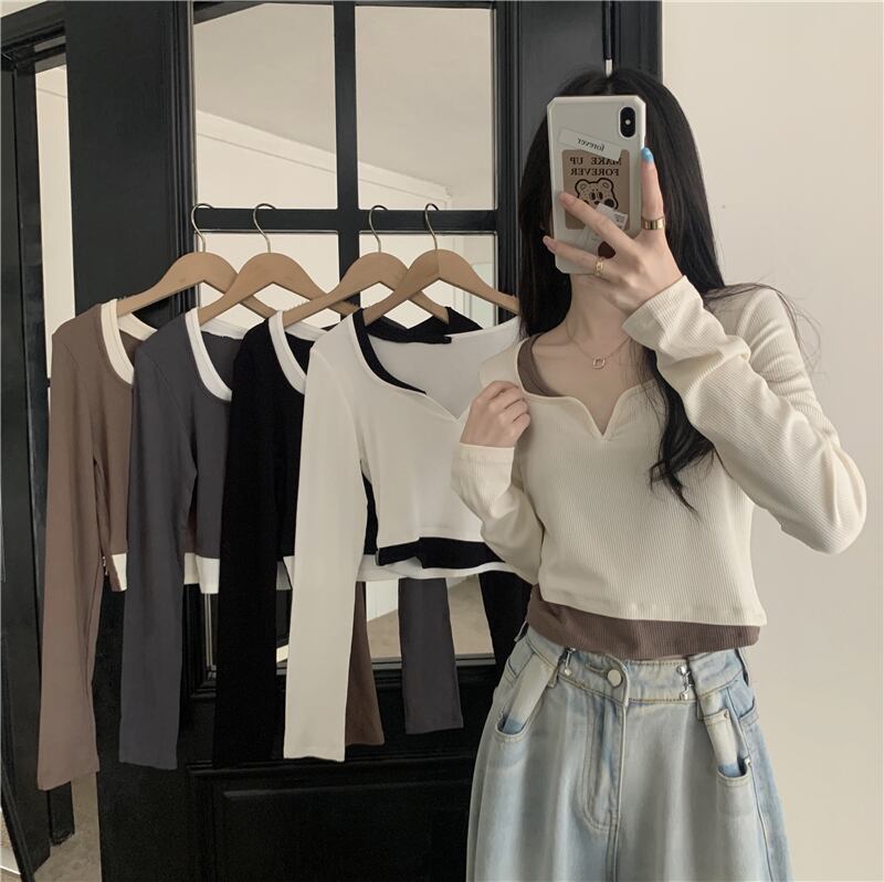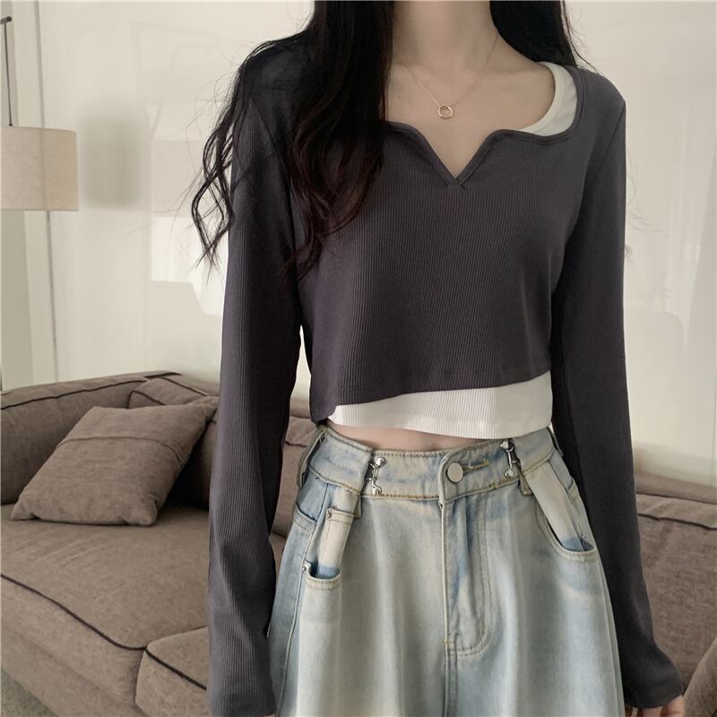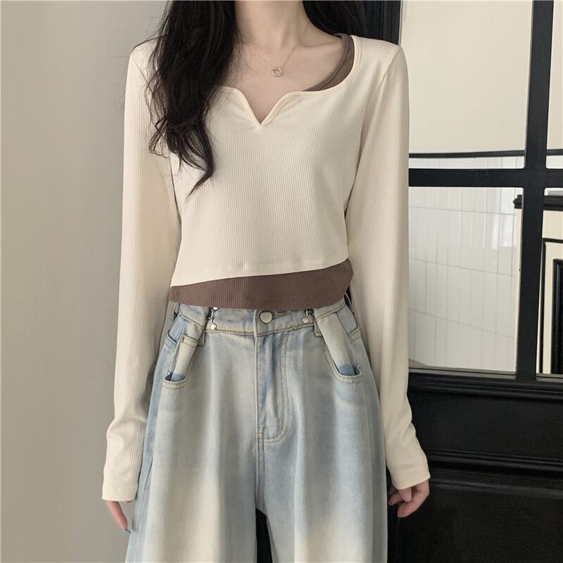 フェイク ツーピース 長袖 トップス レディース 秋 ショート tシャツ コントラストカラーのVネック ボトムス シャツを組み合わせたeignスタイルのデザイン ロング オータム 秋物 746007798746031 | framboise21