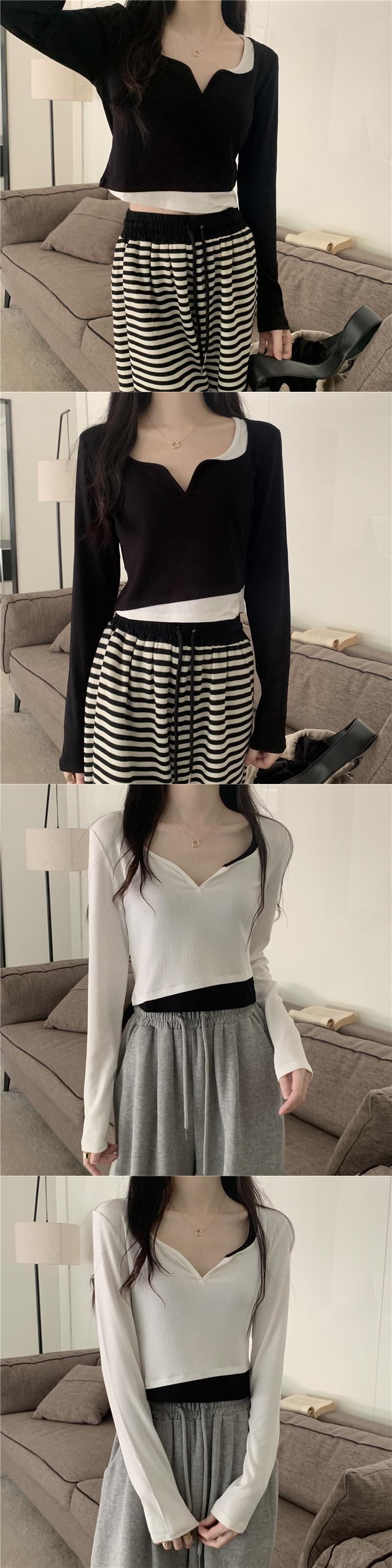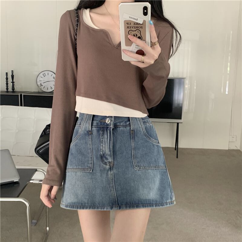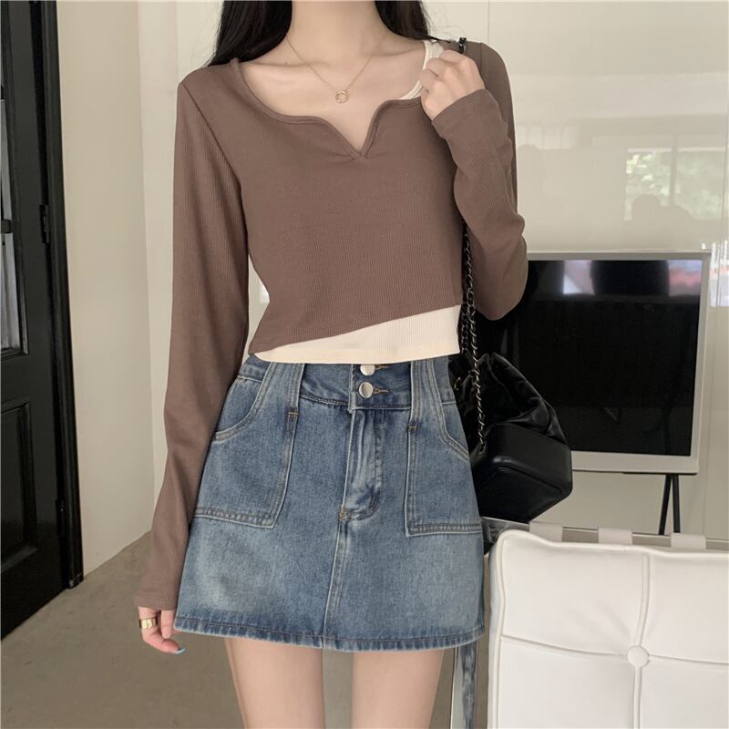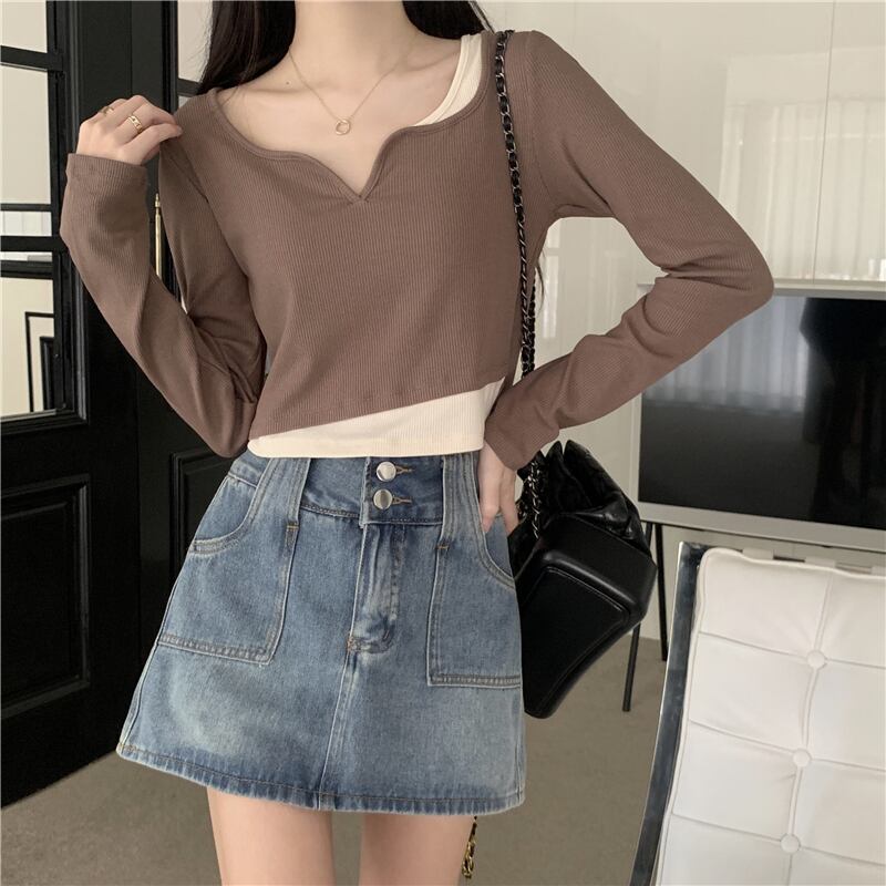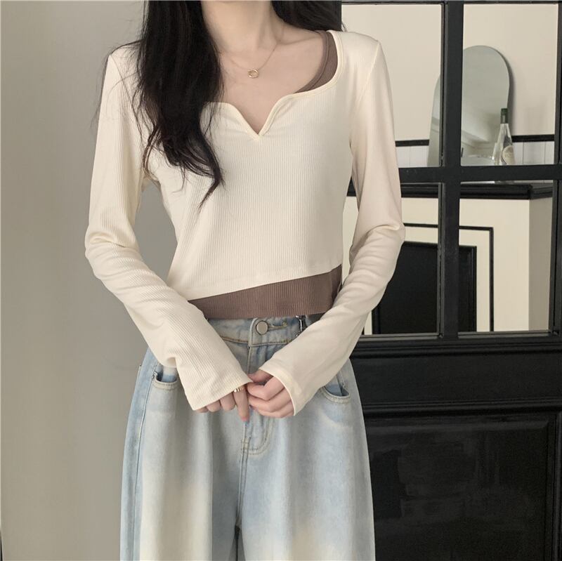フェイク ツーピース 長袖 トップス レディース 秋 ショート tシャツ コントラストカラーのVネック ボトムス シャツを組み合わせたeignスタイルのデザイン ロング オータム 秋物 746007798746031 | framboise21