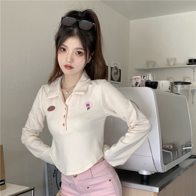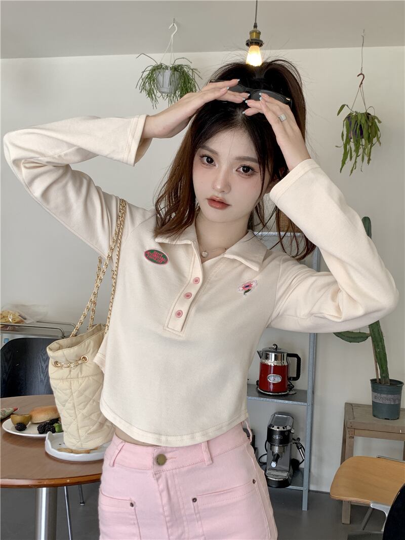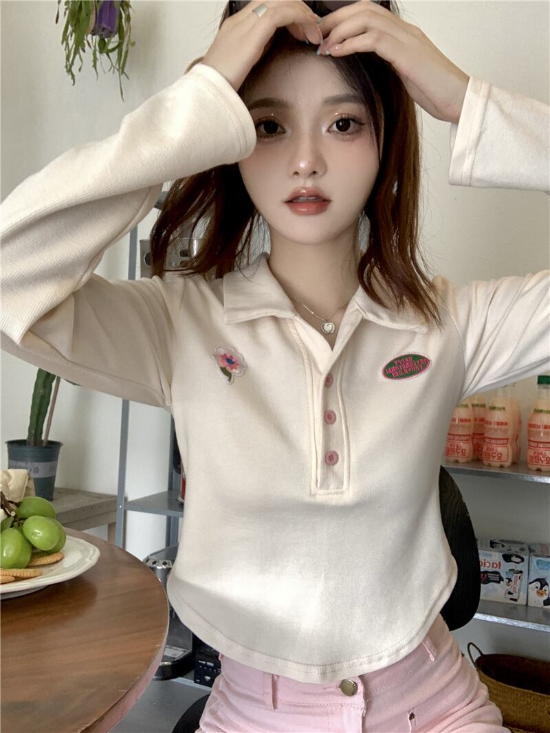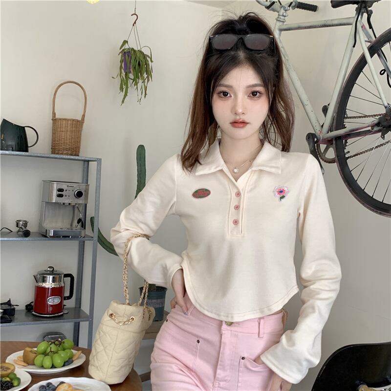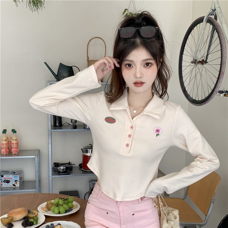 2022年秋の新作スウィート長袖レディーストップデザインウエスタンスタイルカーブショートポロカラーボトムTシャツ ロング 大人ガーリー キュート カジュアル オータム 秋物 7460090591483965 | framboise21