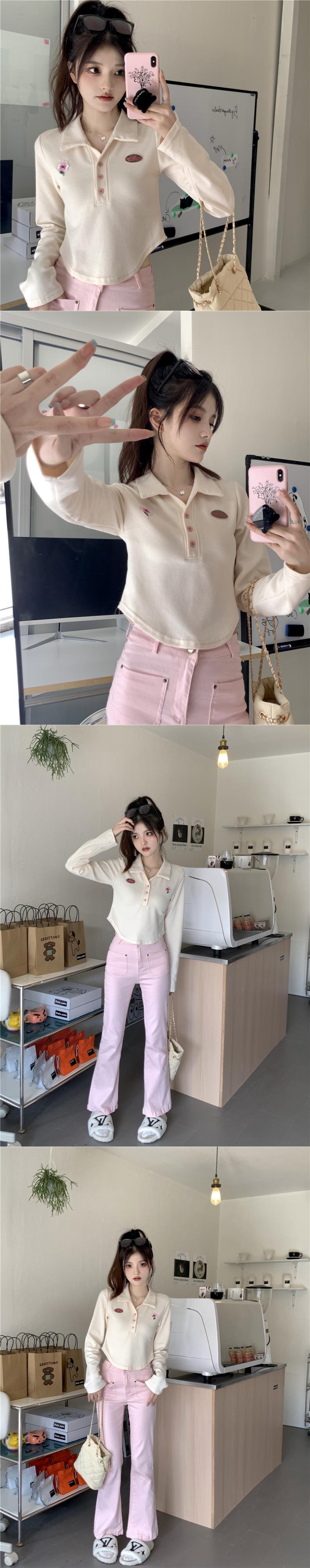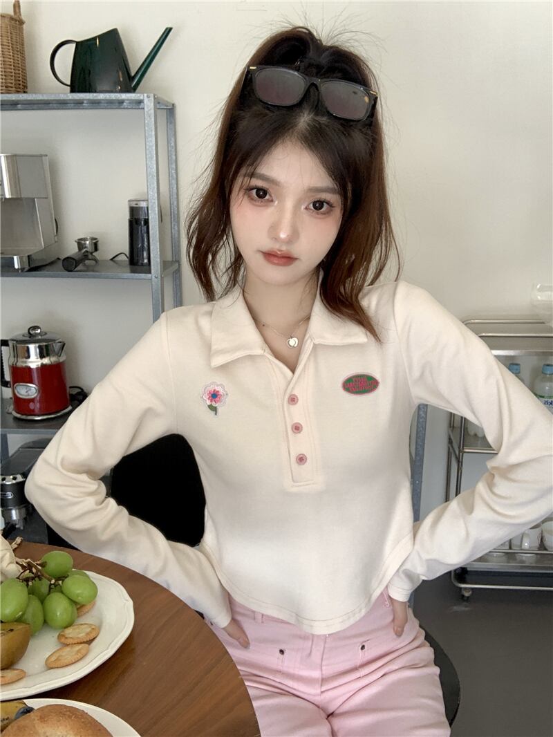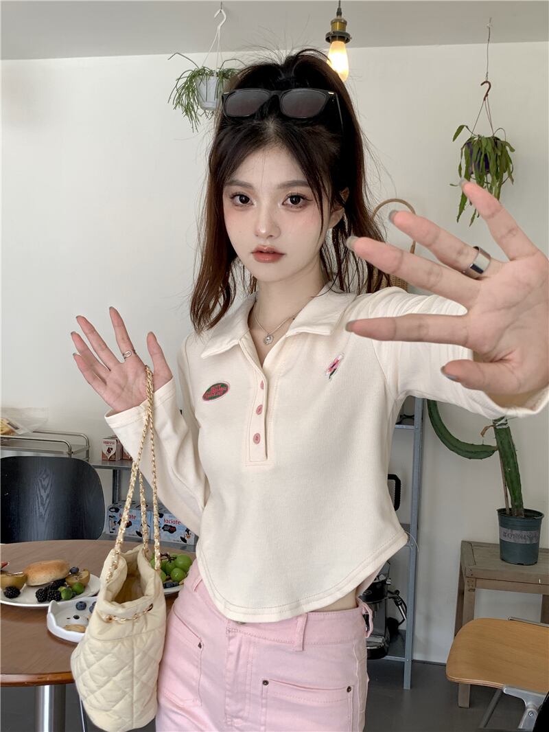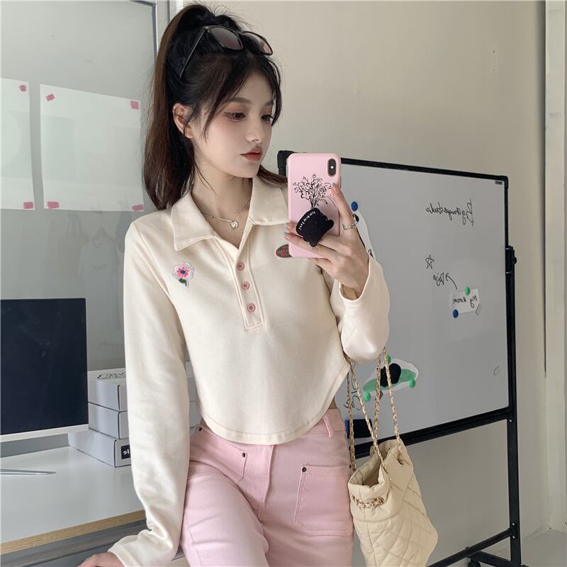 2022年秋の新作スウィート長袖レディーストップデザインウエスタンスタイルカーブショートポロカラーボトムTシャツ ロング 大人ガーリー キュート カジュアル オータム 秋物 7460090591483965 | framboise21