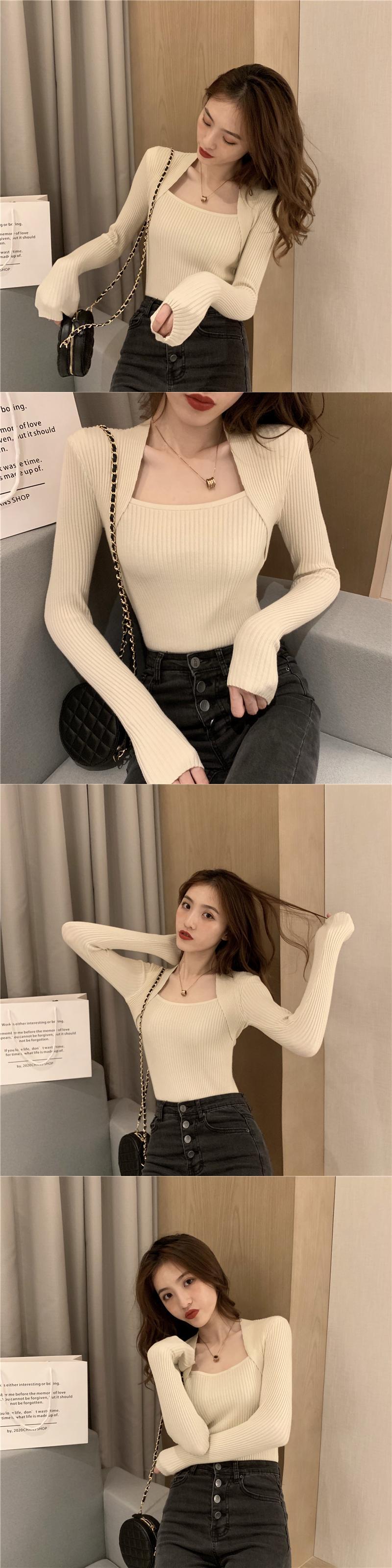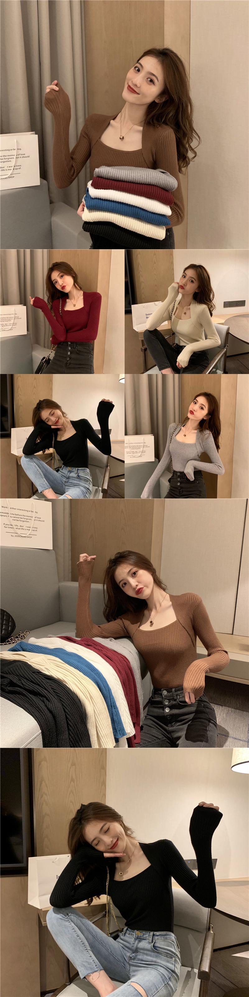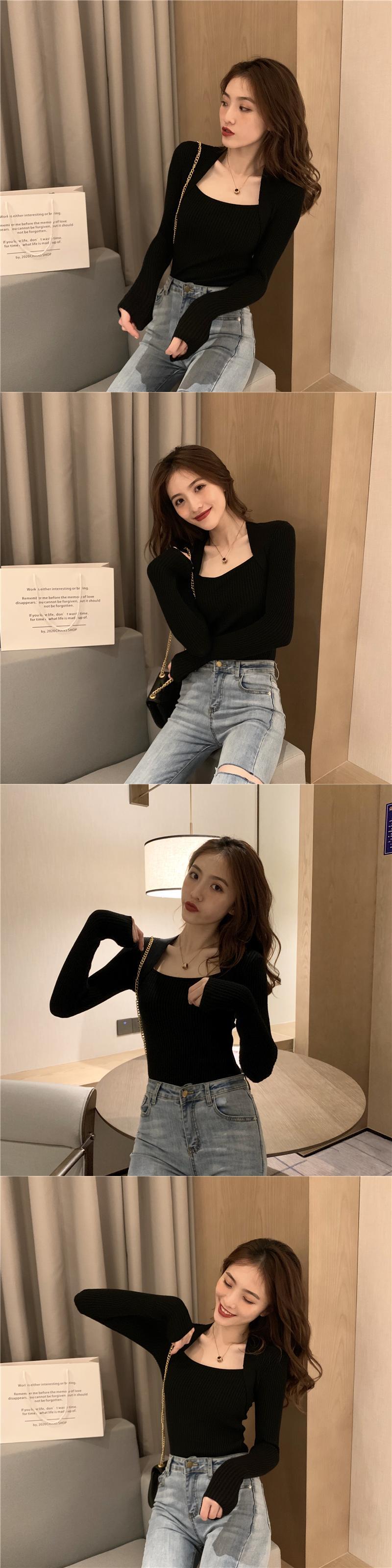 黒のボトムス シャツの女性の秋と冬のニット スクエア ネック セーター、eign スタイル、スリム フィット露出鎖骨長袖トップ ロング ブラック オータム 秋物 ウィンター 冬物 スクウェア 7460078669839858 | framboise21