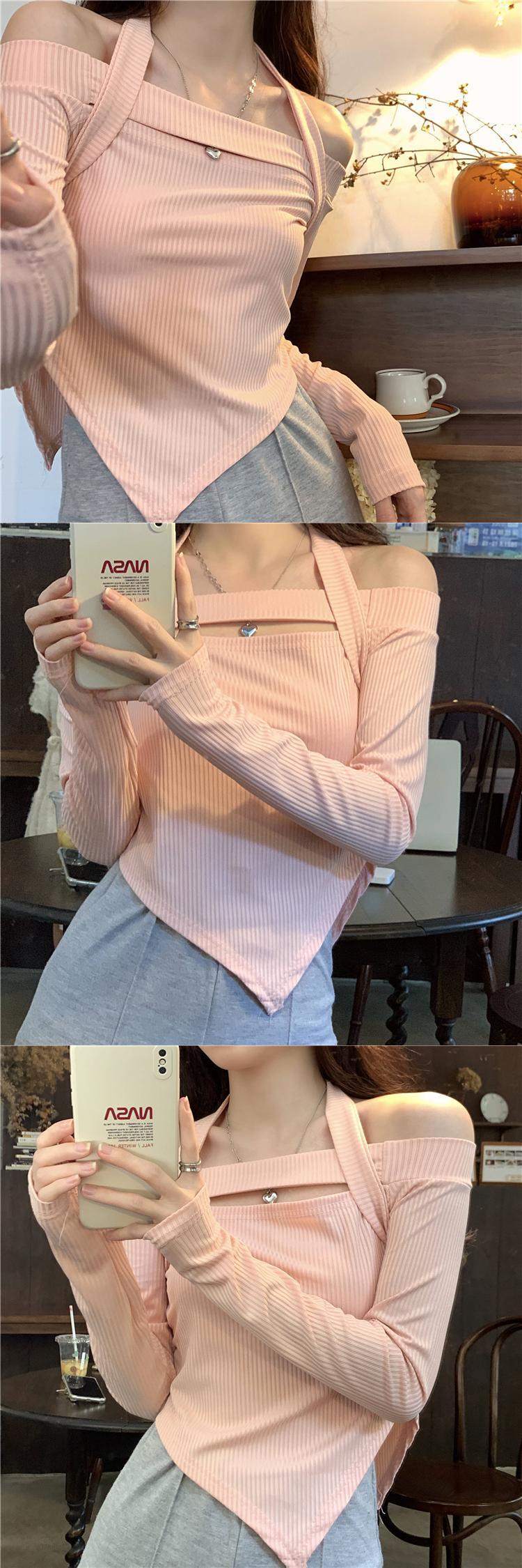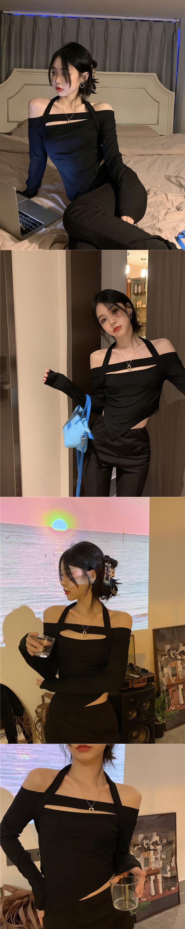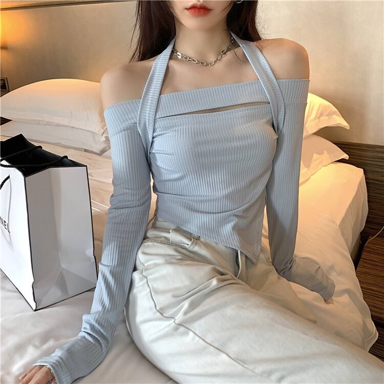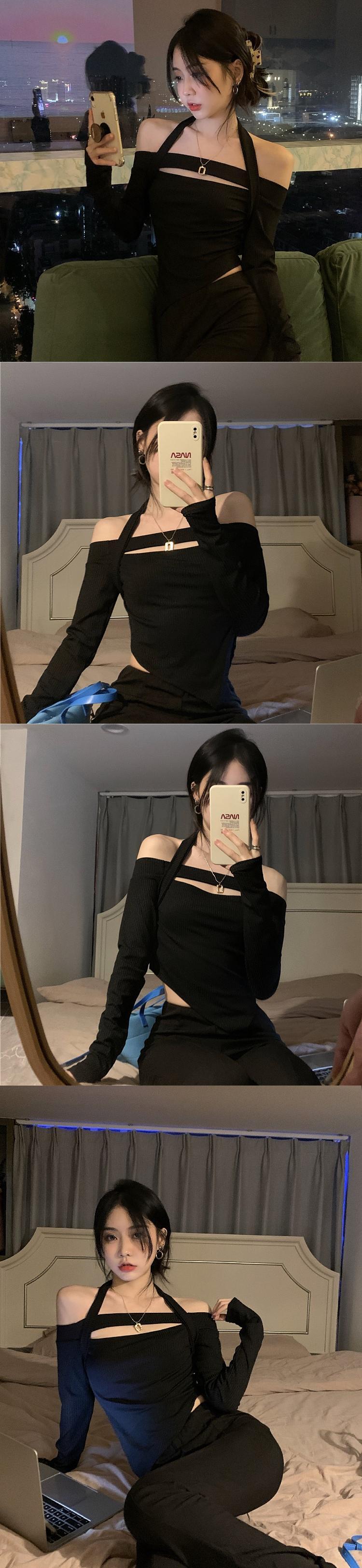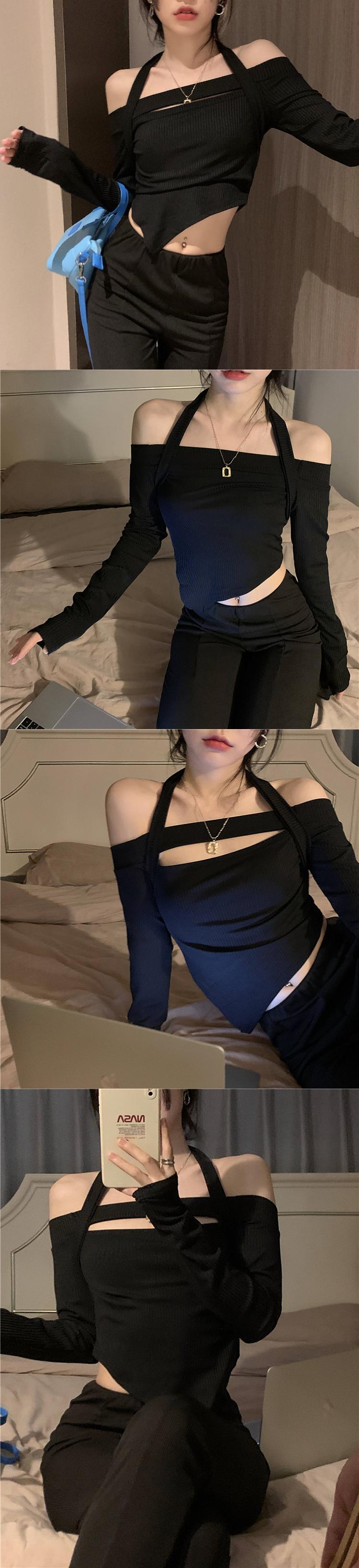 黒のワンショルダートップの女性の秋のセクシーなホルターTシャツのデザインの短いオフショルダーの長袖の底入れシャツ ショート ロング ブラック オータム 秋物 7460020255676700 | framboise21