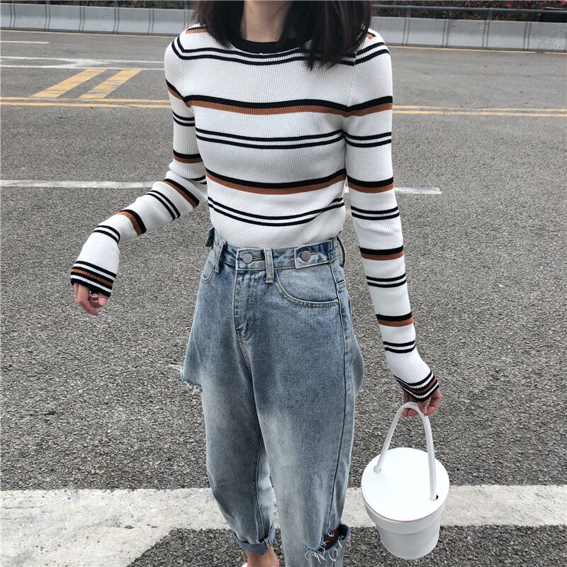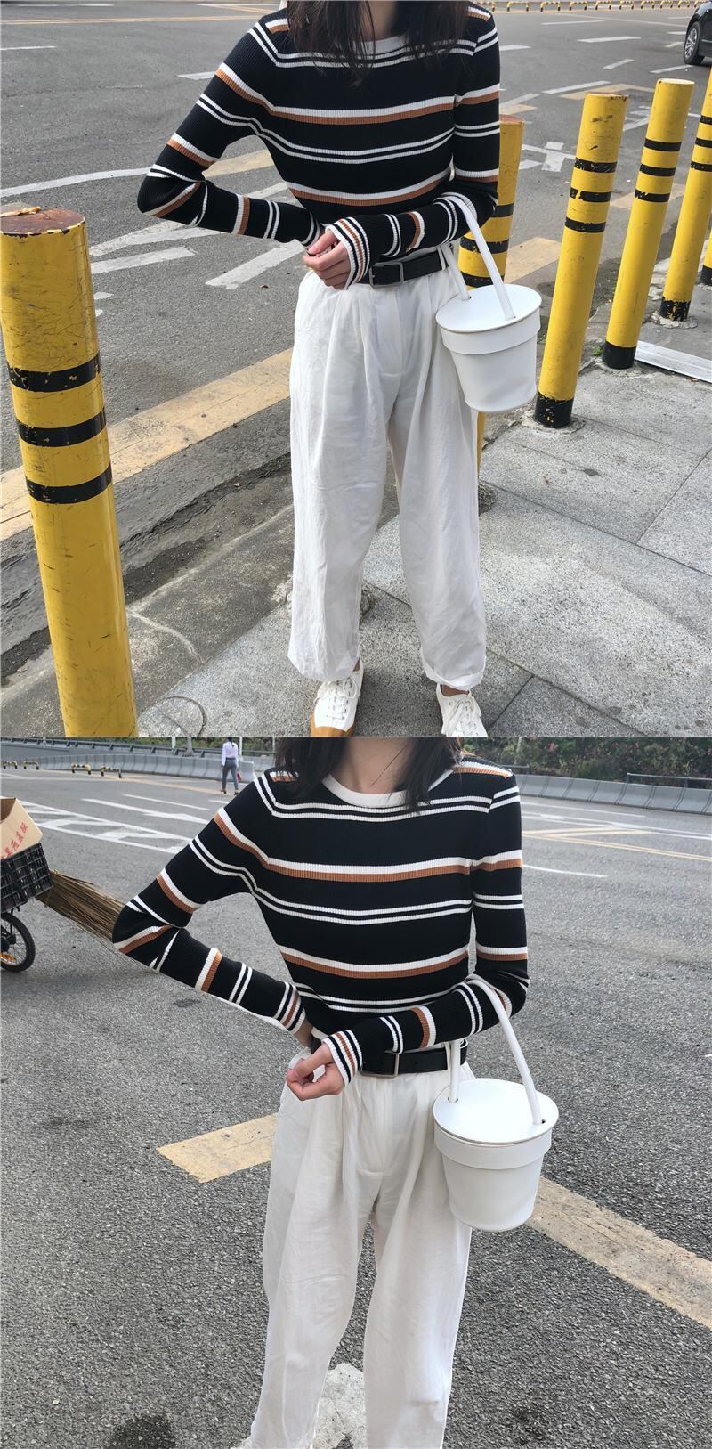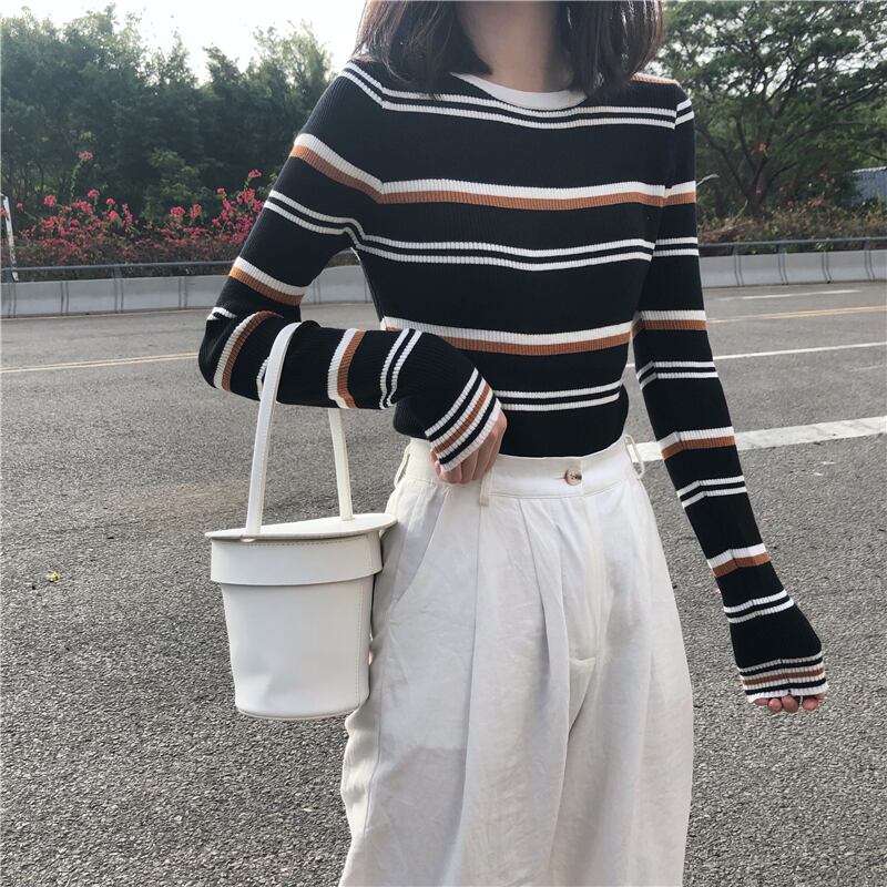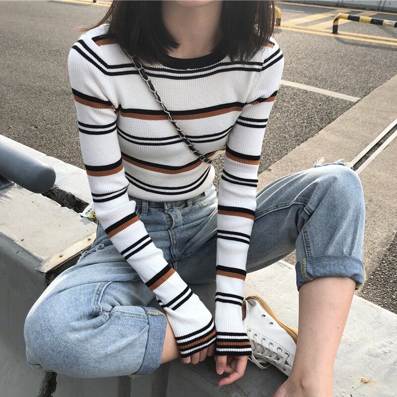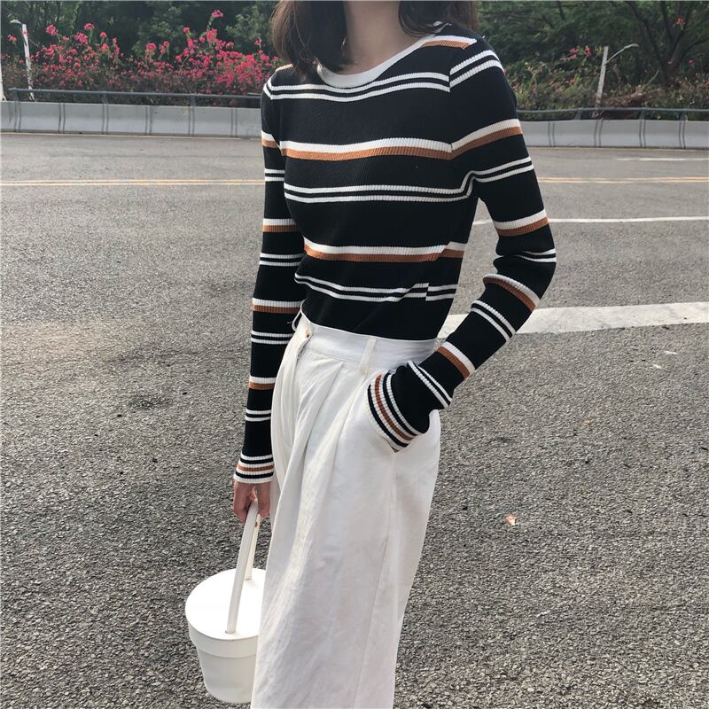 白のストライプのボトムスシャツの女性の秋と冬のリブ付きの長袖のセーターは、スリムフィットのオールマッチのニットトップを備えたeignスタイルのデザインです ロング ホワイト オータム 秋物 ウィンター 冬物 7460028092495938 | framboise21
